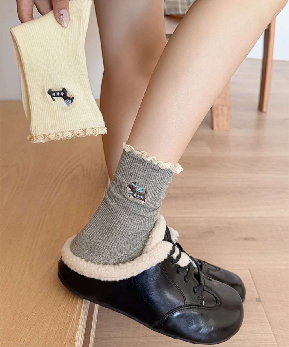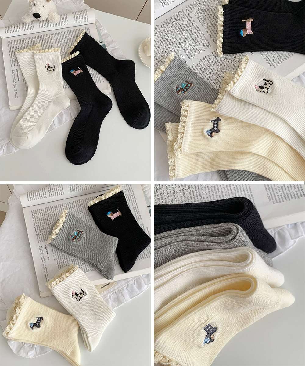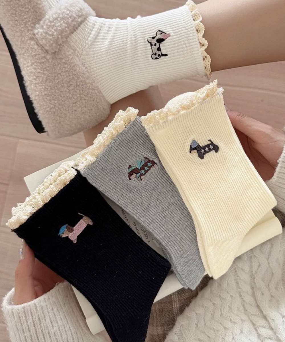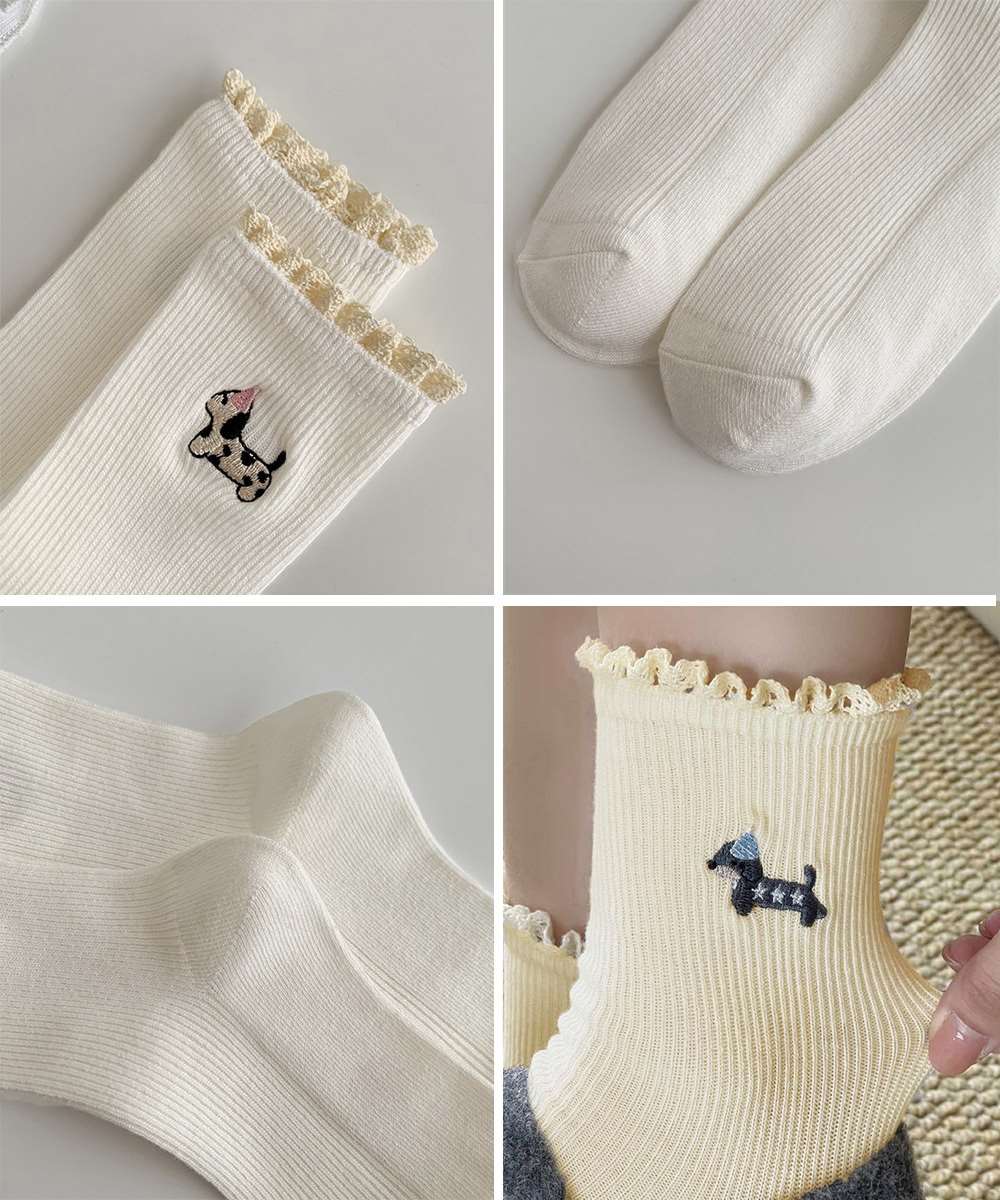 可愛い犬の刺しゅうがポイントのフリル付きリブソックス。