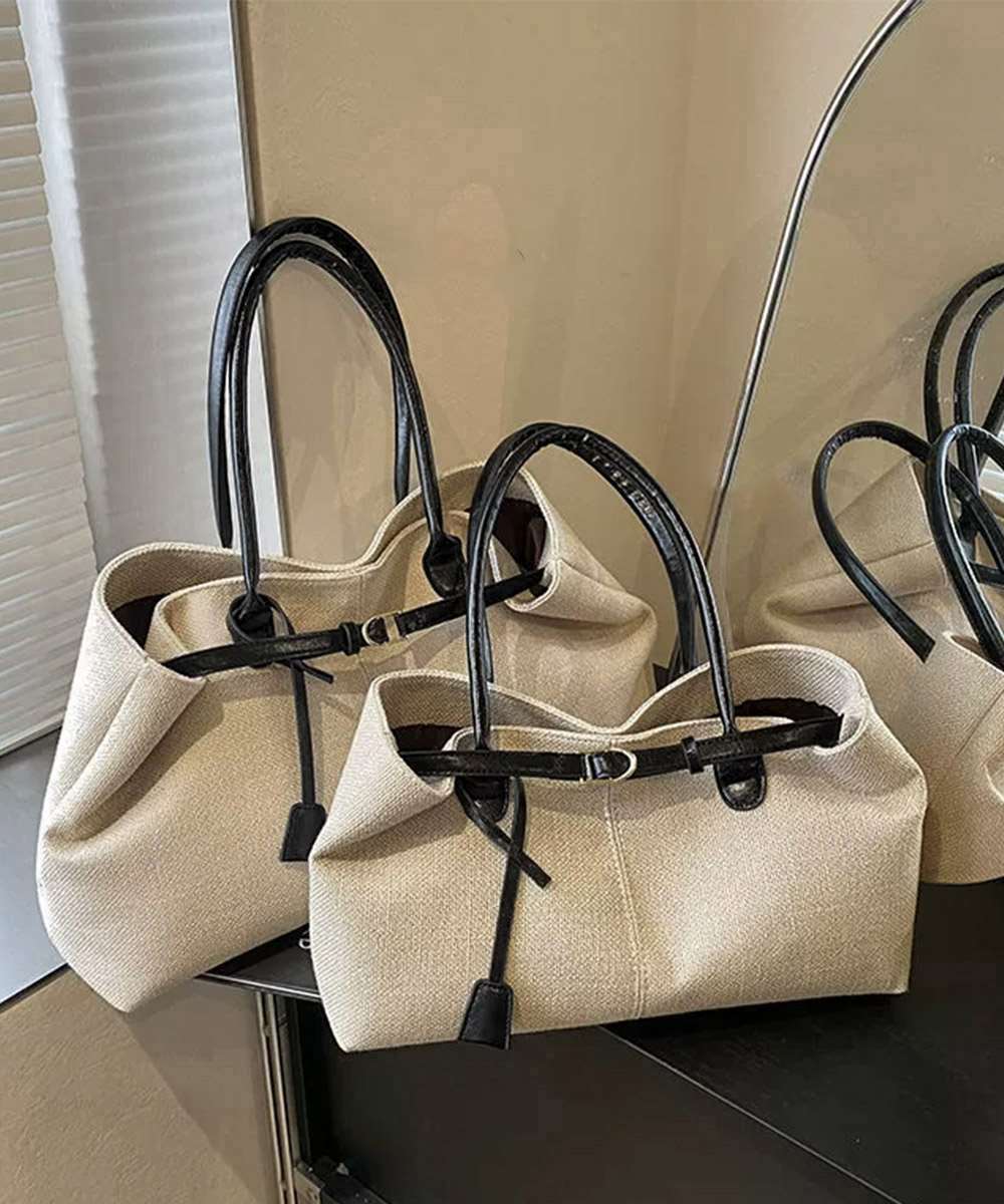 ナチュラル風生地にレザー調のハンドルとベルトが映えるレディーストートバッグ。