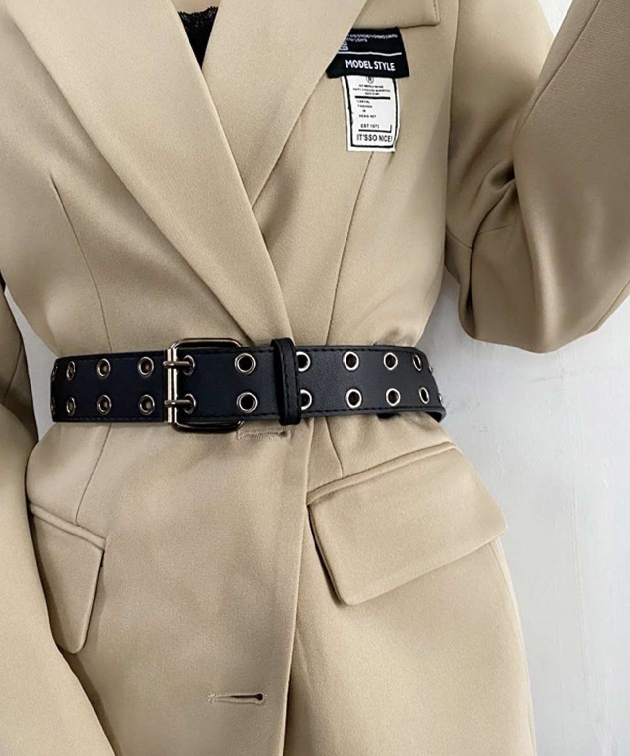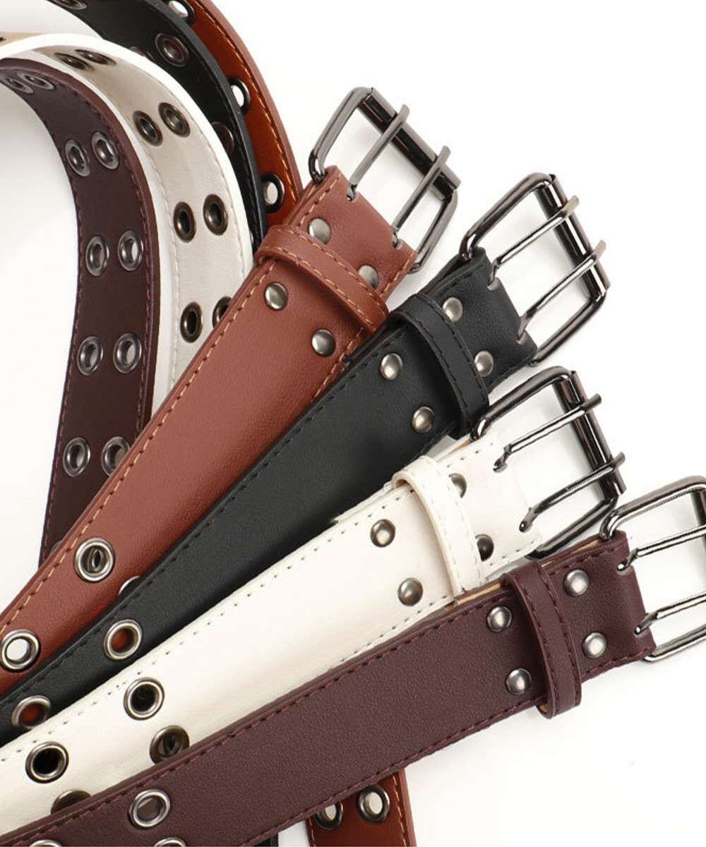 アイレットを全体にあしらった、存在感抜群のダブルピンベルト。