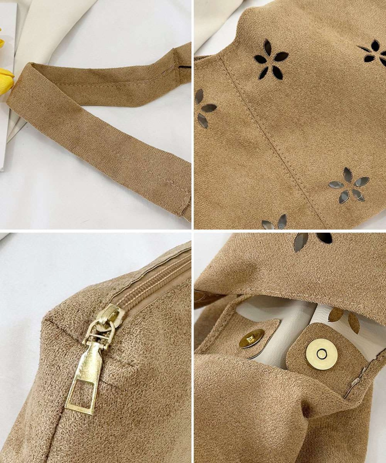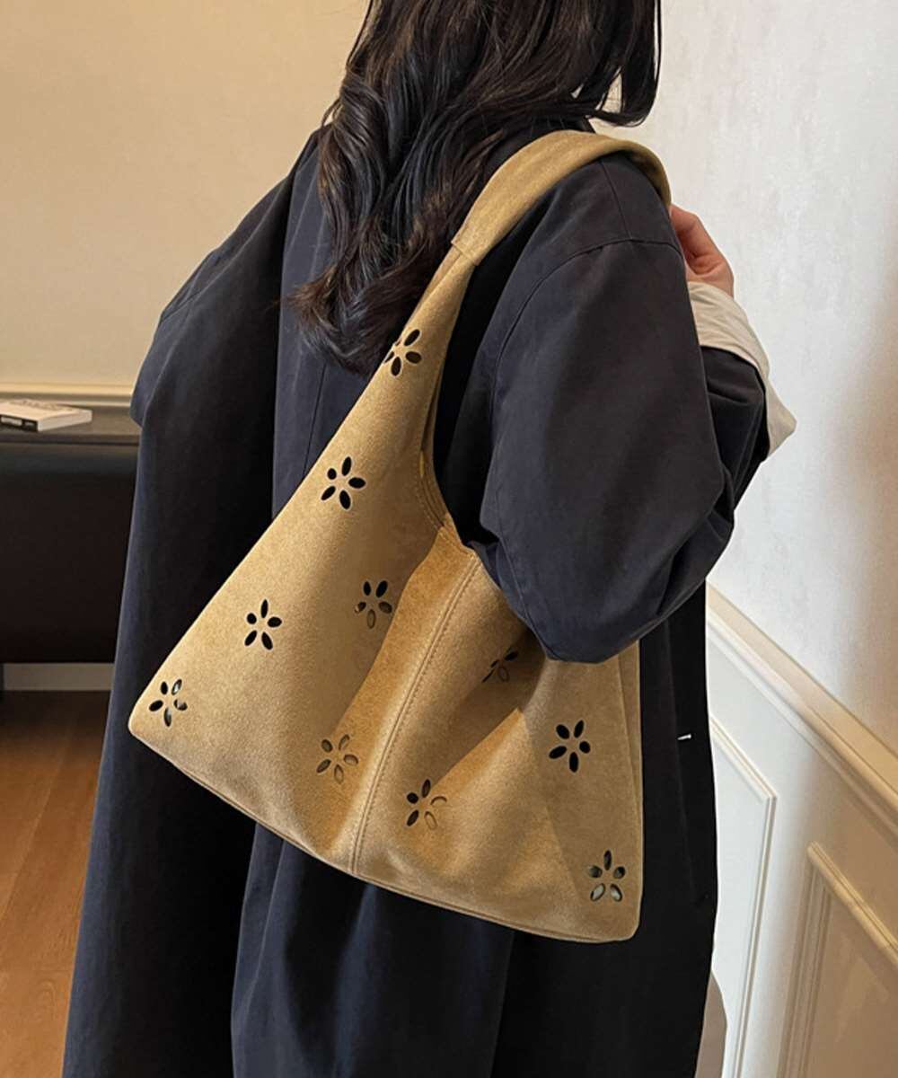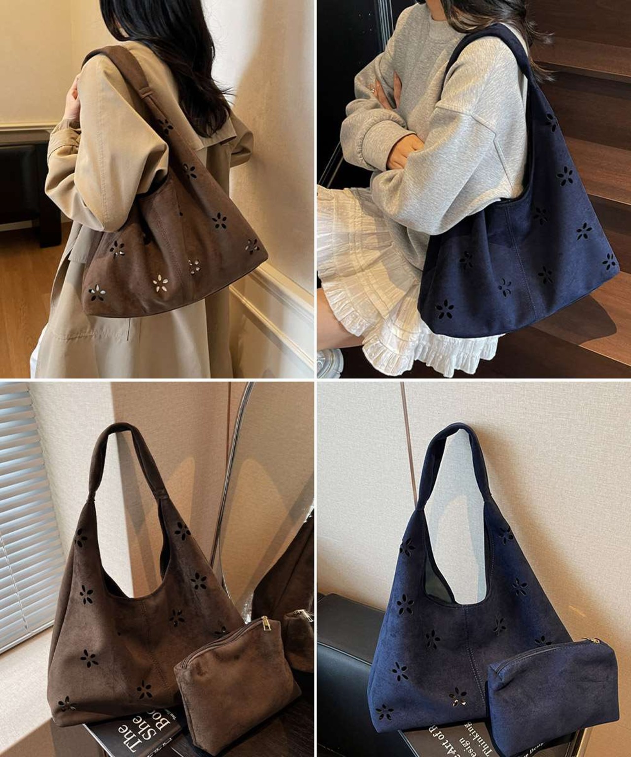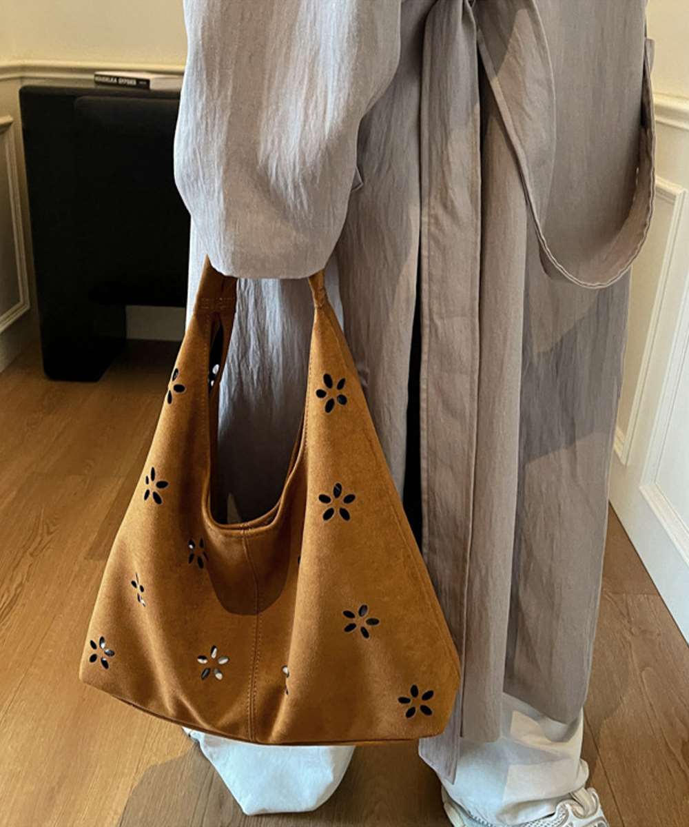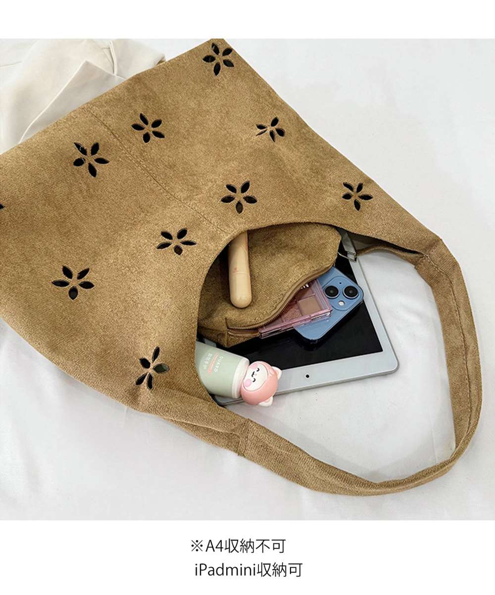スエード調素材にフラワーカットを施した、存在感抜群のトートバッグ。