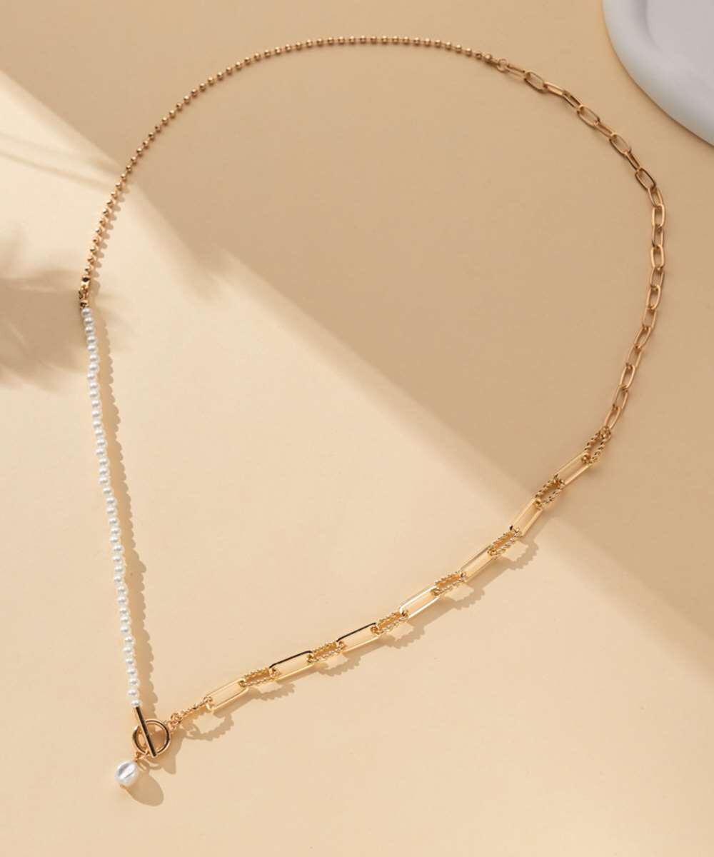 異素材を組み合わせたアシンメトリーデザインのパール×チェーンネックレス。
