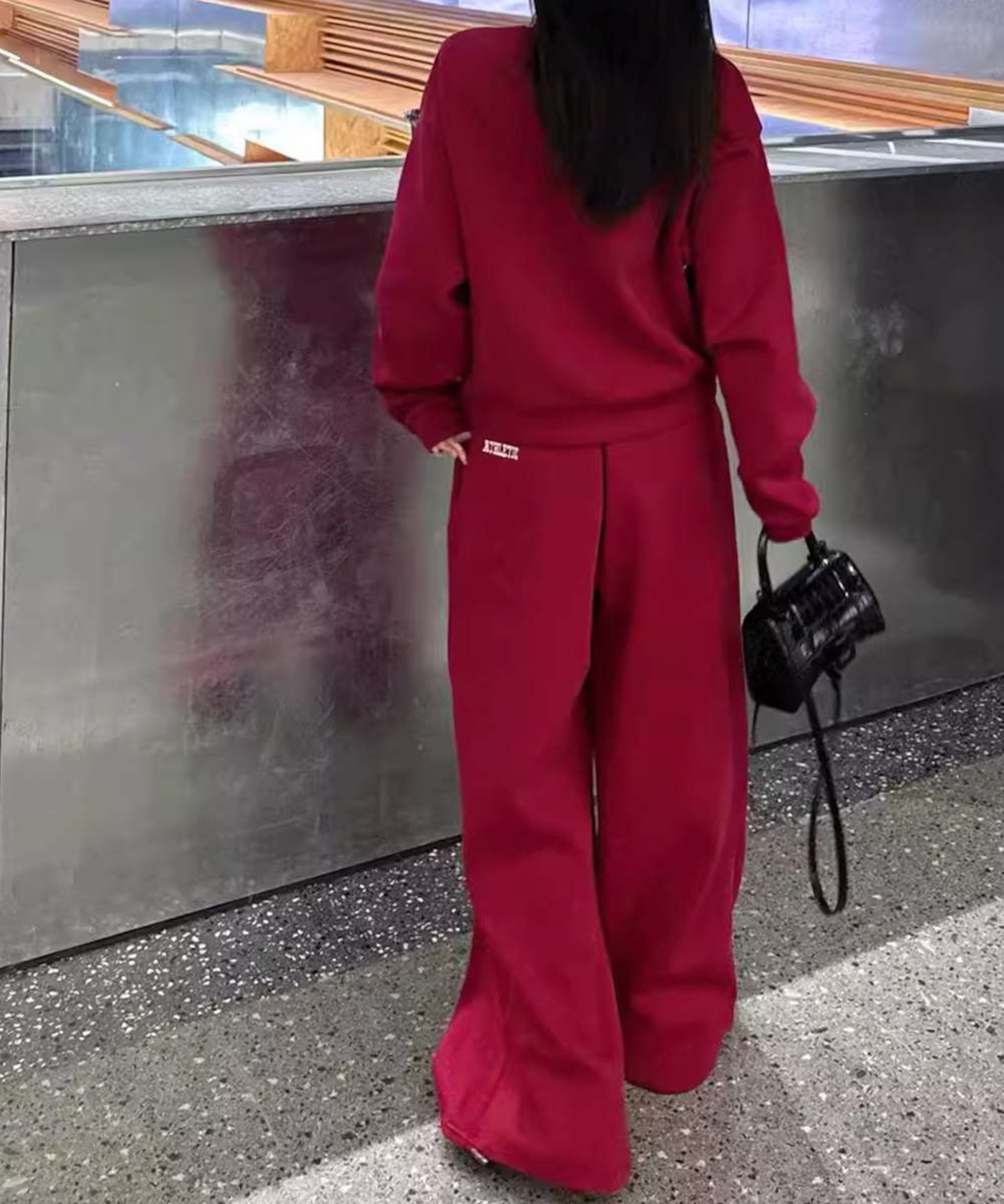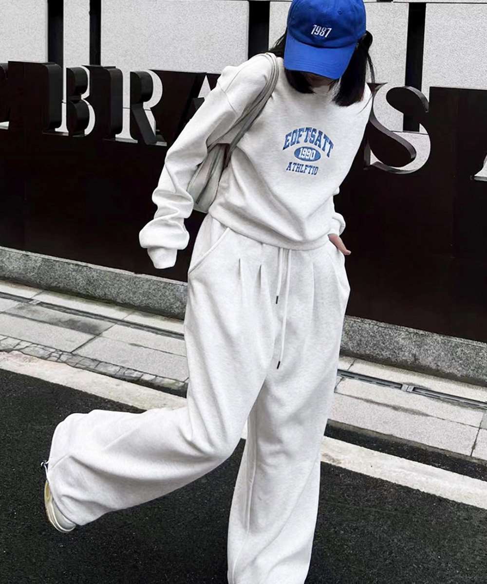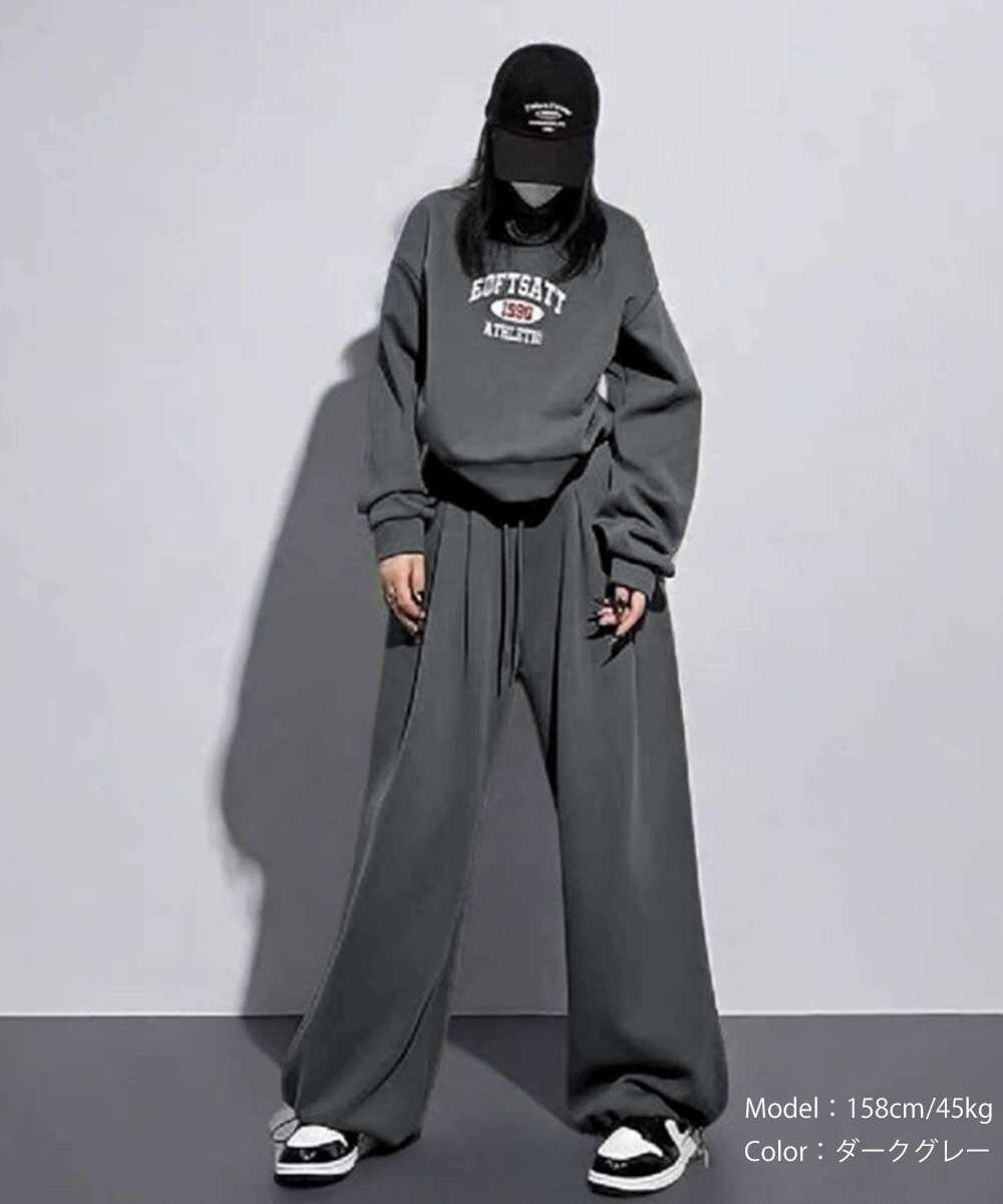 カレッジロゴが目を惹くスウェットトップスとワイドパンツのレディースセットアップ。