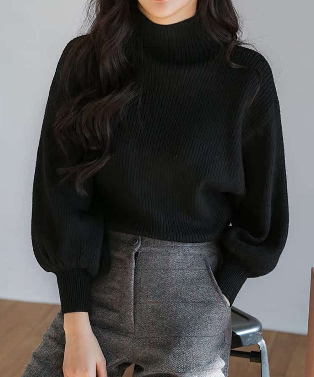 ボリューム袖が女性らしいハイネックリブニットセーター。