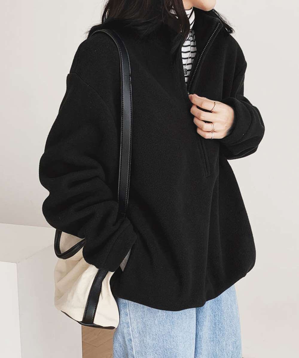 柔らかい起毛フリース仕上げのハーフジッププルオーバー。