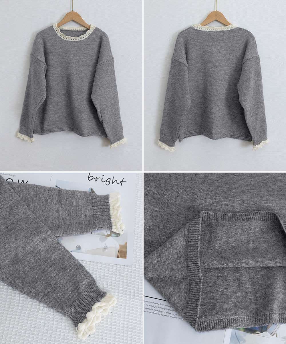 衿と袖口に配色切り替えデザインを施した、女性らしさを引き立てるシンプルなニットトップス。