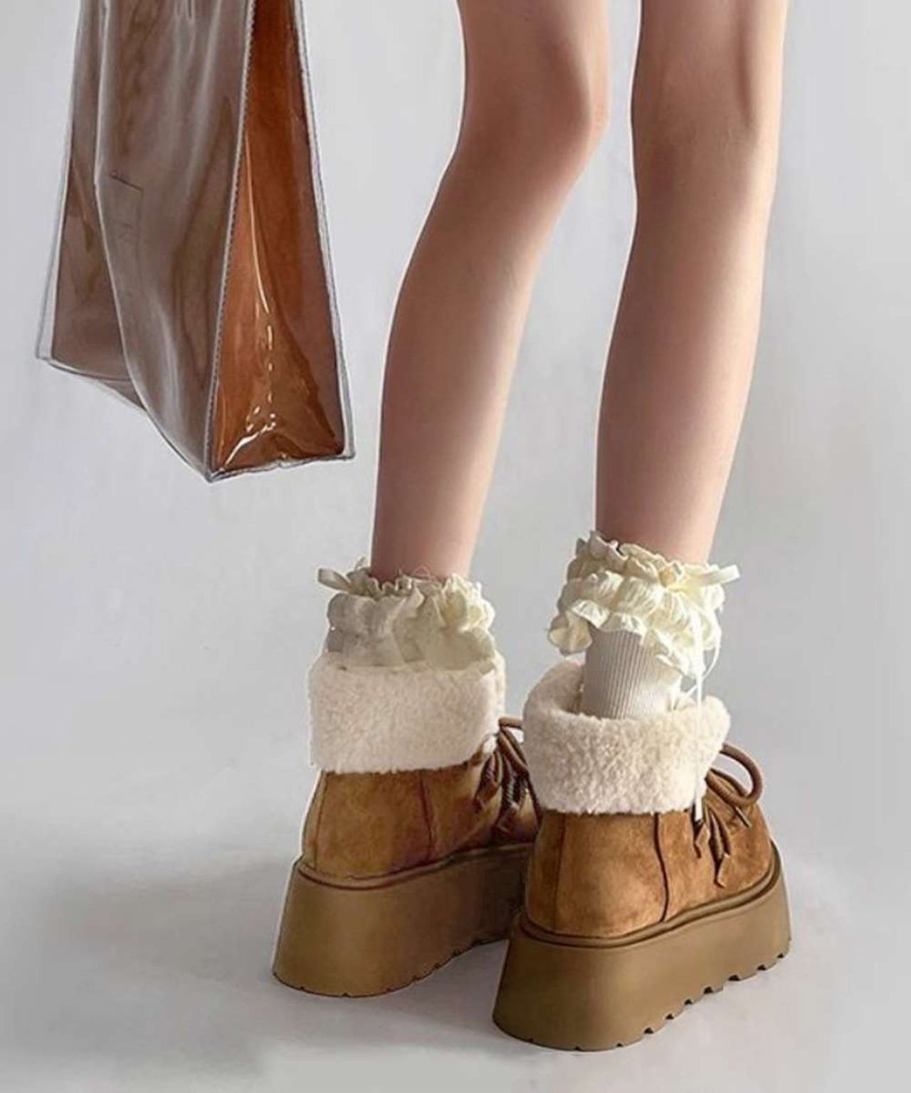ミニスカートやショートパンツに合わせて、韓国風の冬コーデを楽しめる一足。