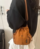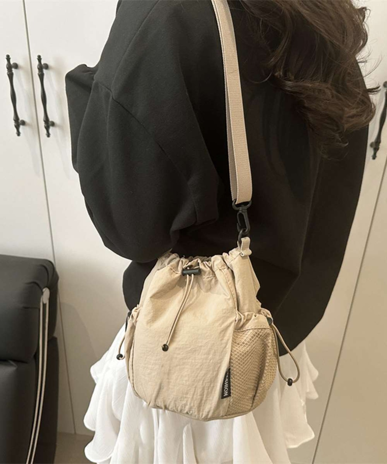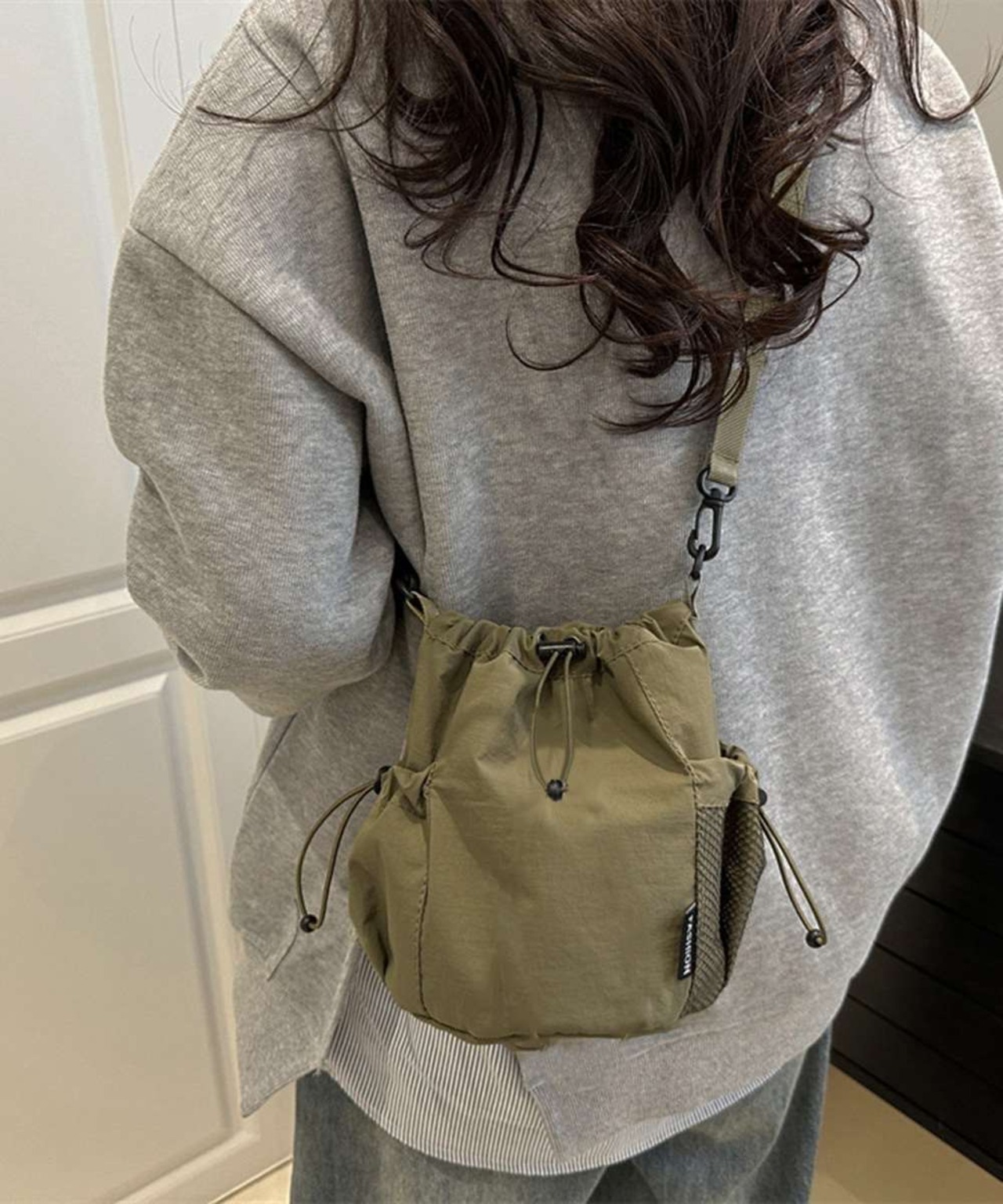 軽量でコンパクトなサイズ感が魅力の巾着ショルダーバッグ。