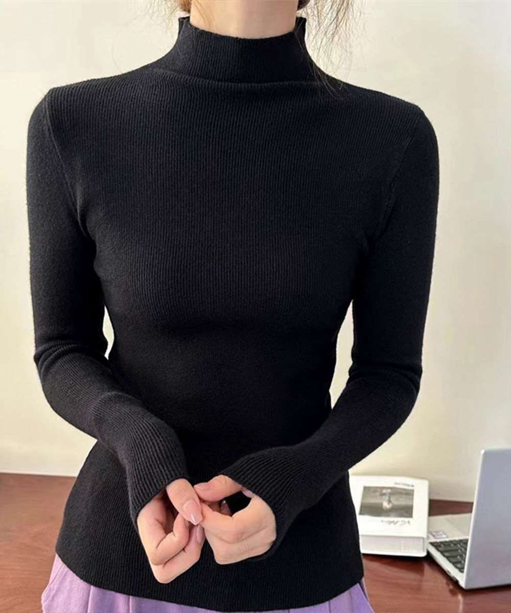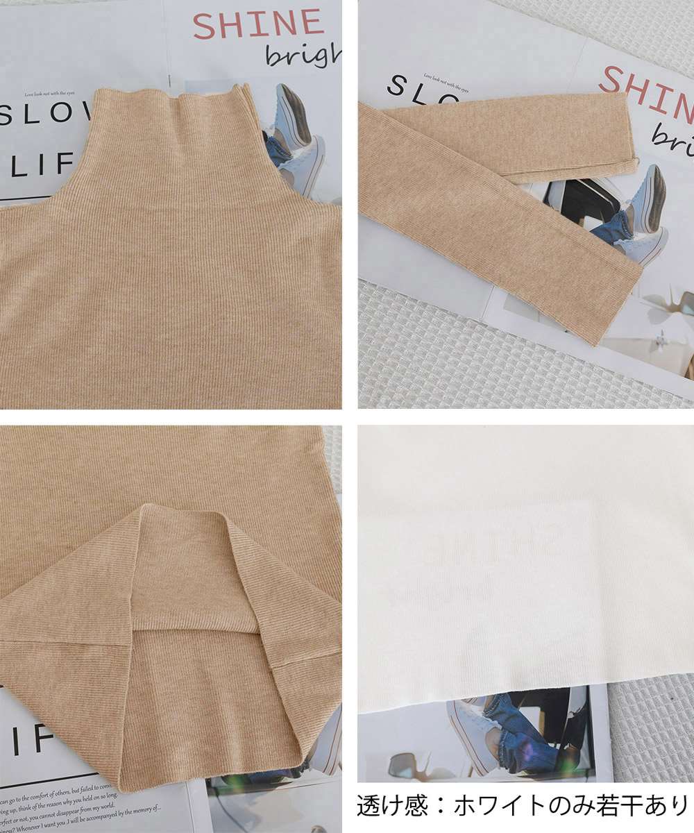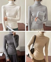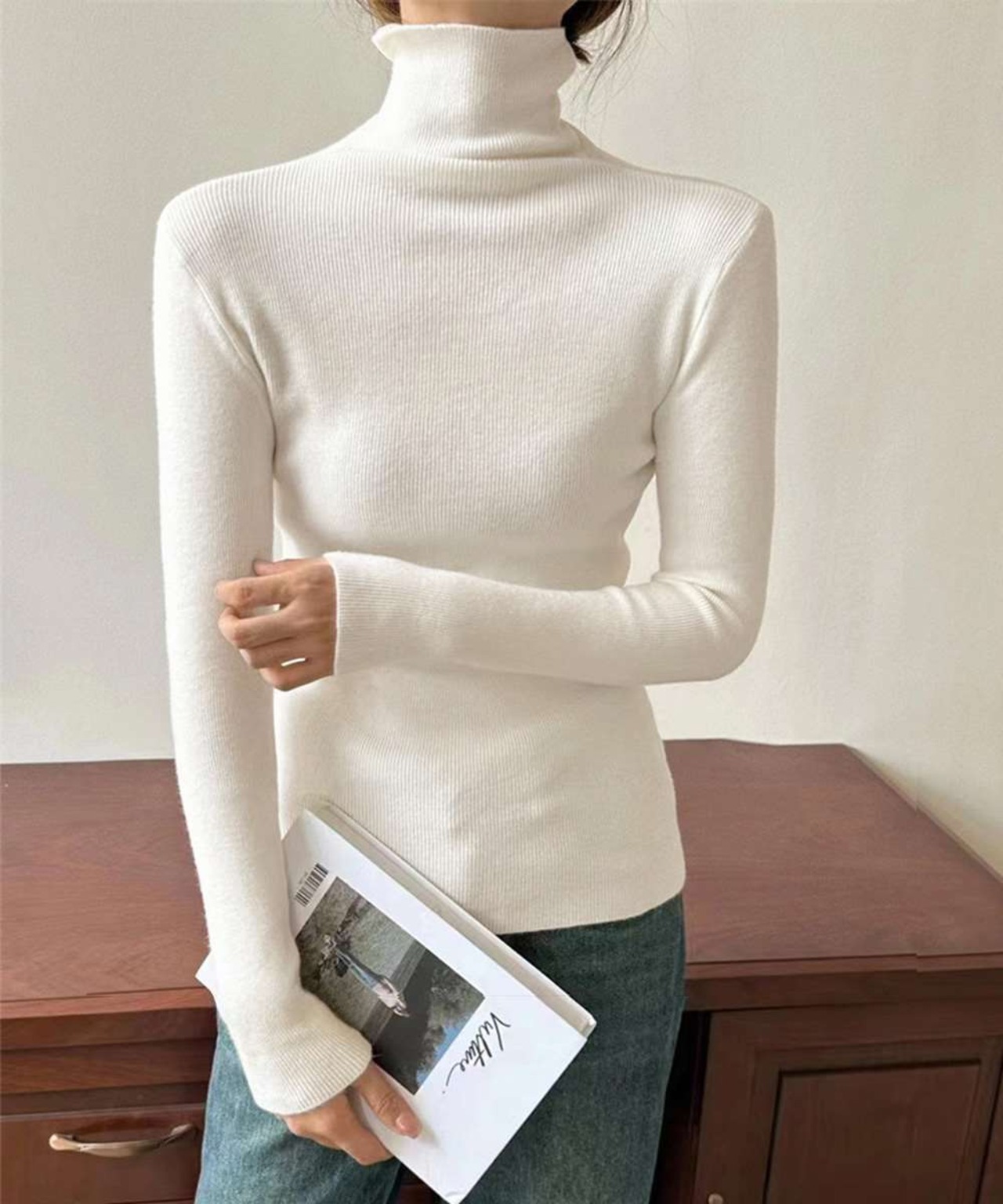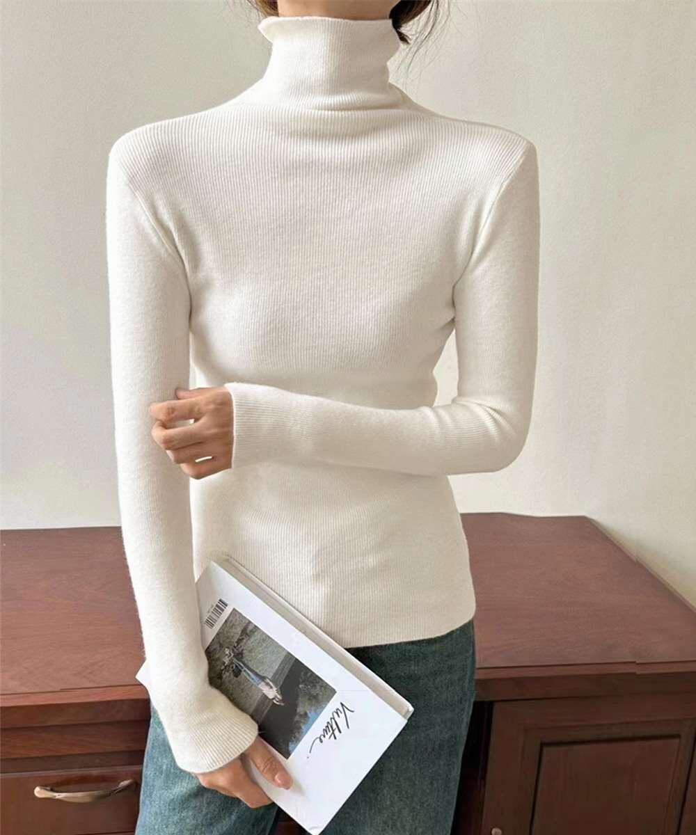 柔らかく滑らかな肌触りが魅力のリブ編みタートルネックニットトップス。
