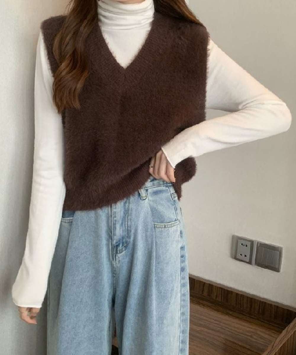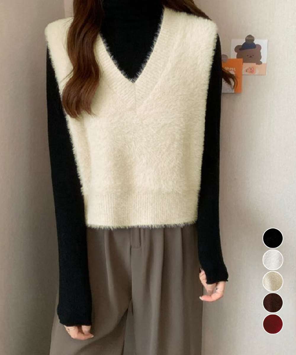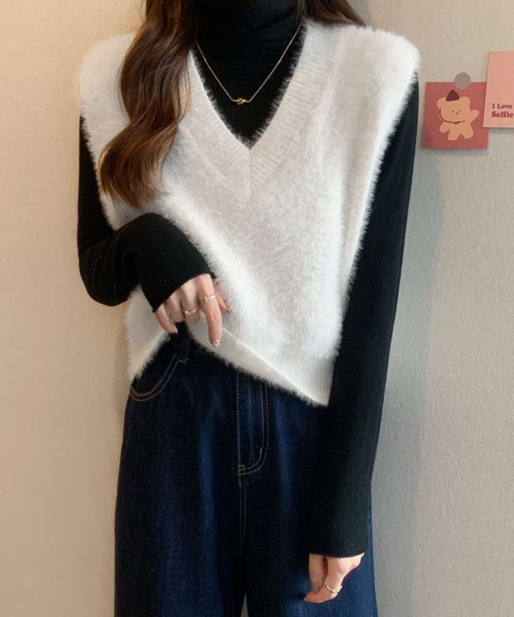 Vネックデザインが大人っぽい印象を与える、フェイクミンクニットベスト。
