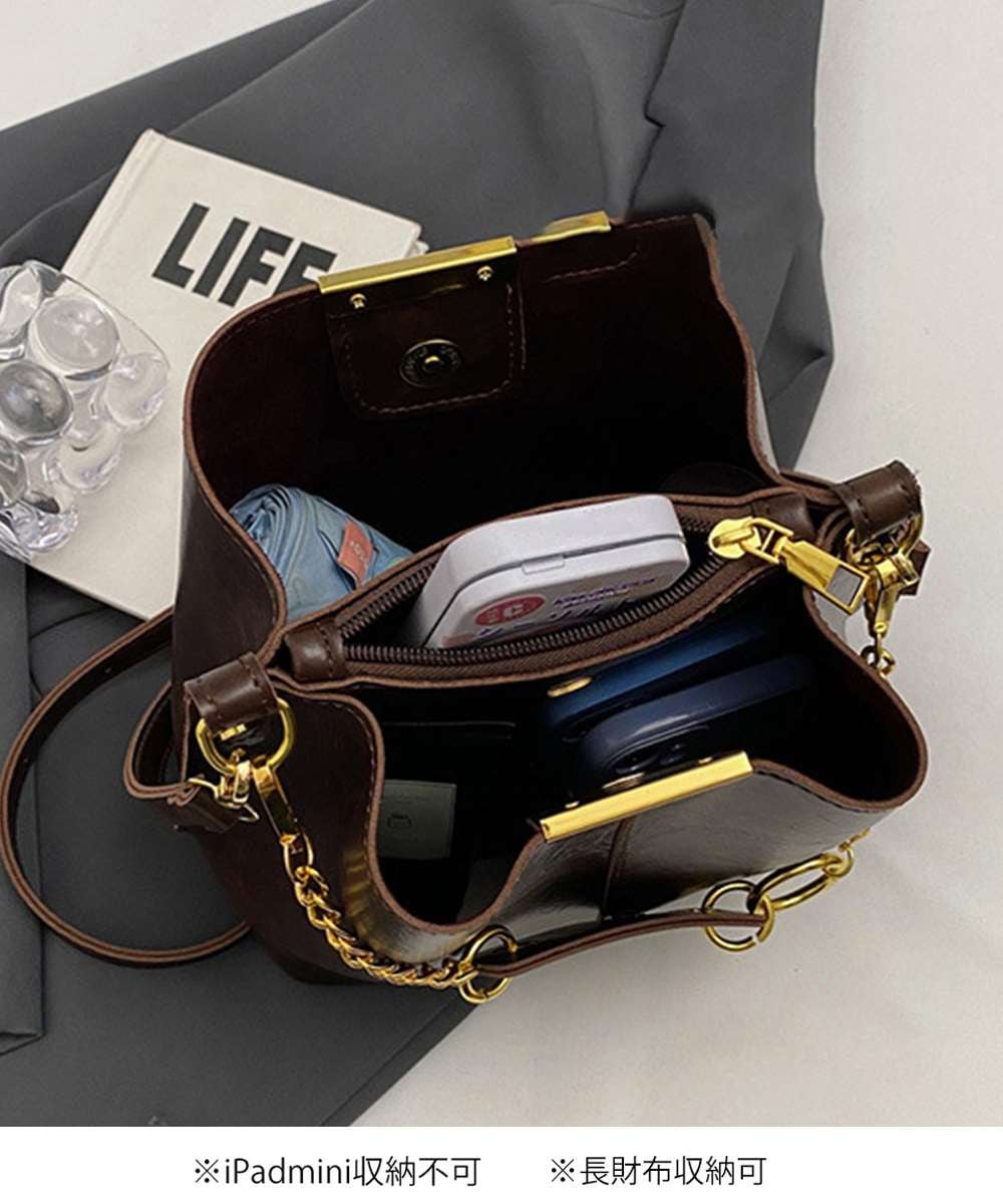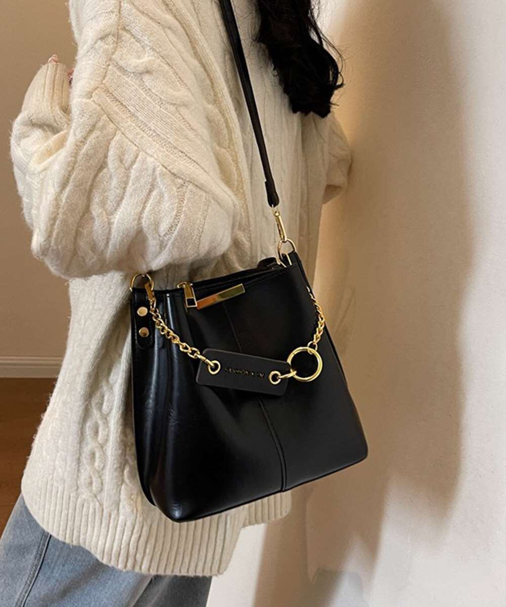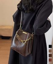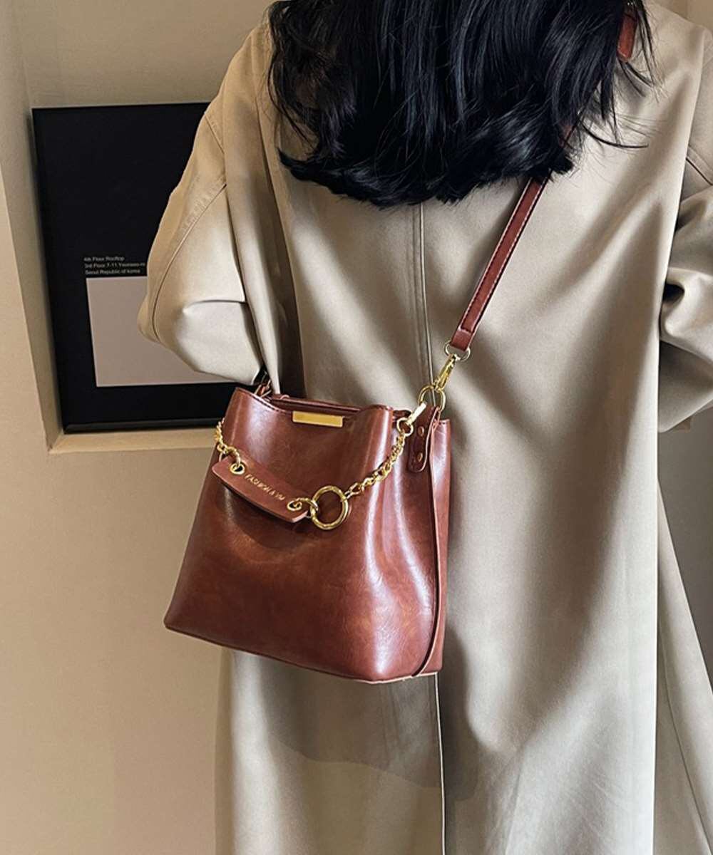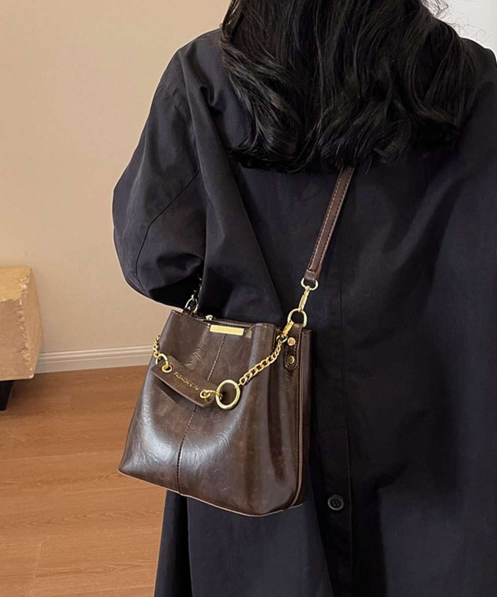 ヴィンテージ感漂う韓国風デザインのチェーン付きバケットバッグ。