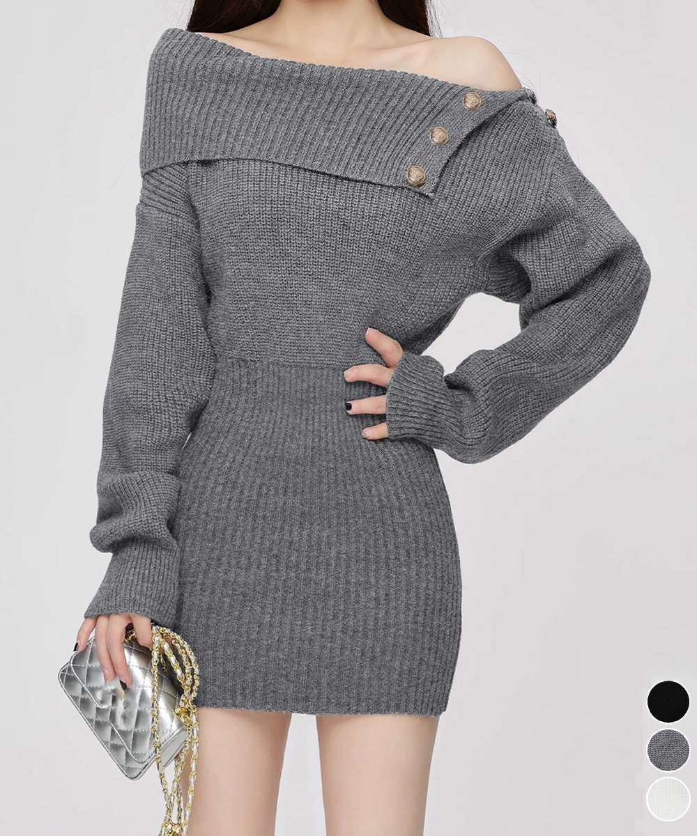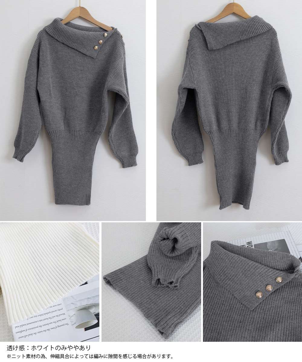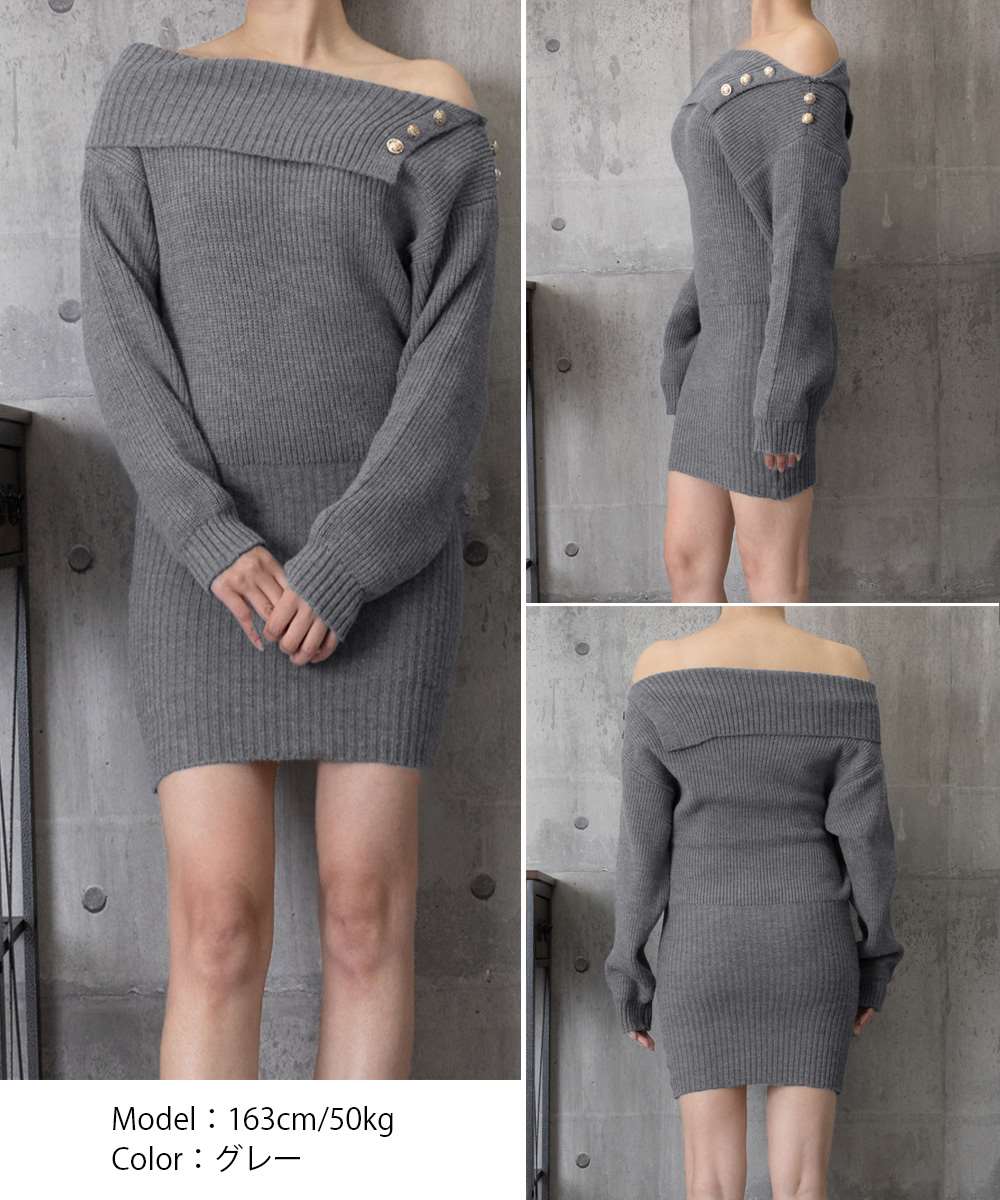 トレンドのオフショルダーに金ボタンデザインを施した、上品な雰囲気漂うニットワンピース。