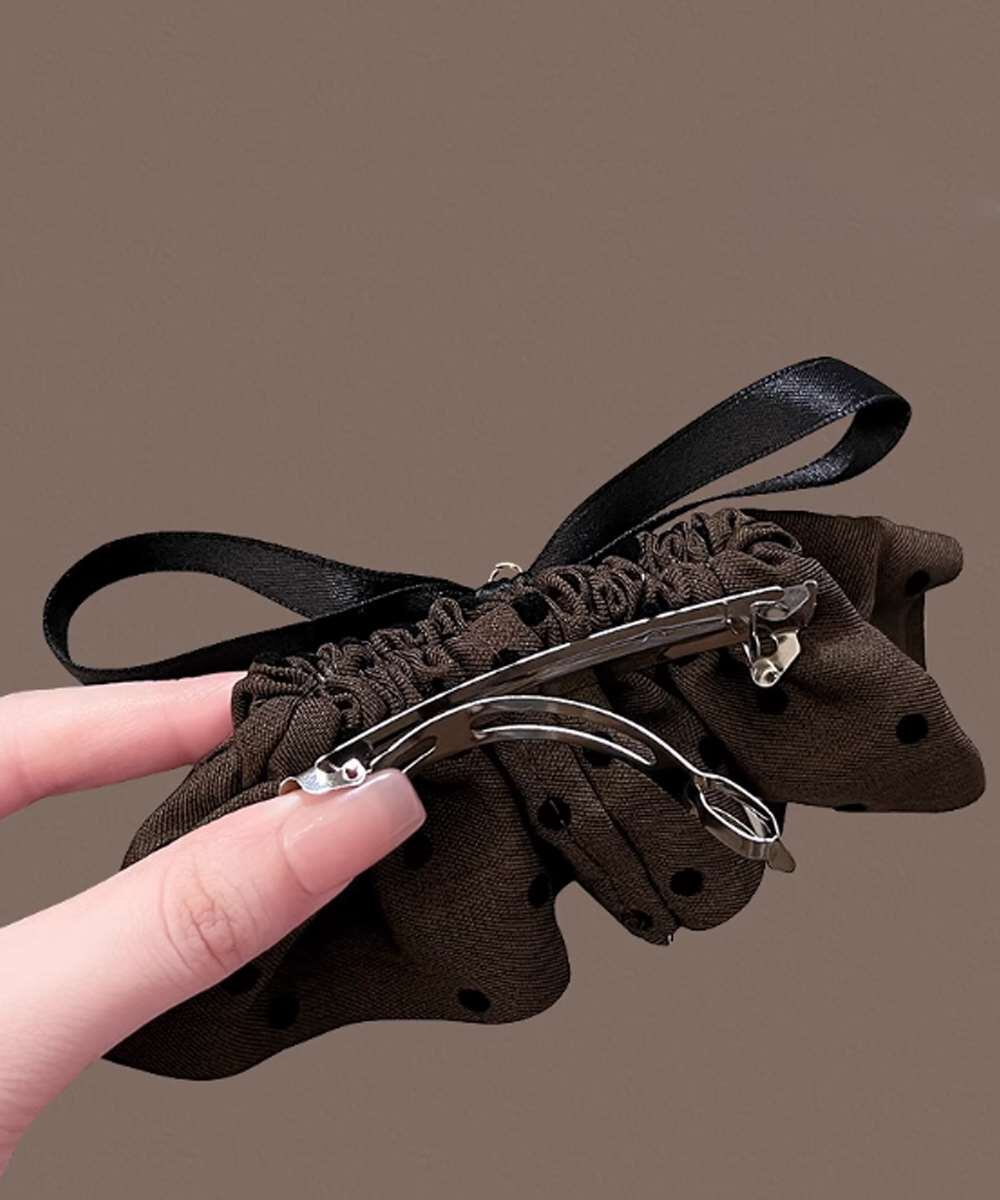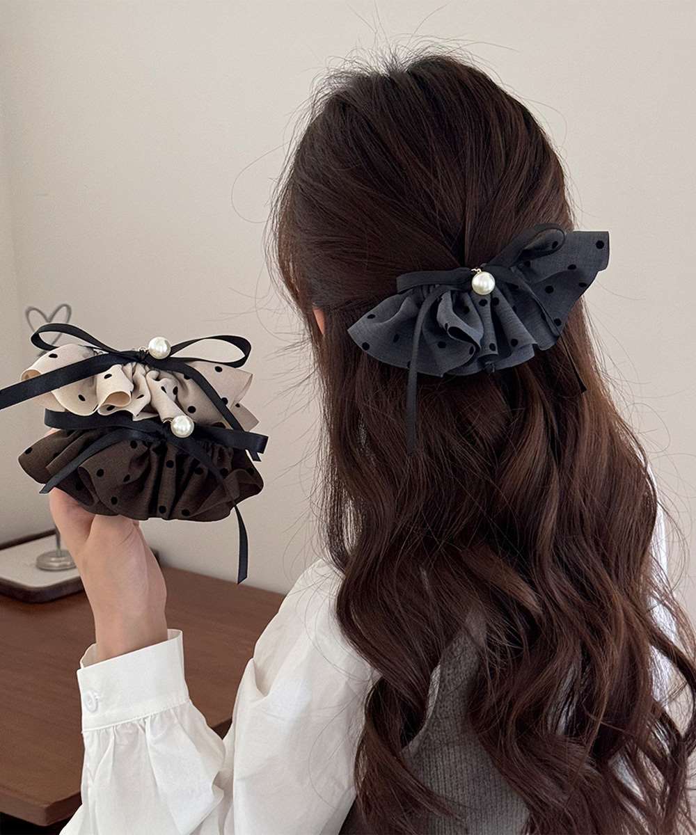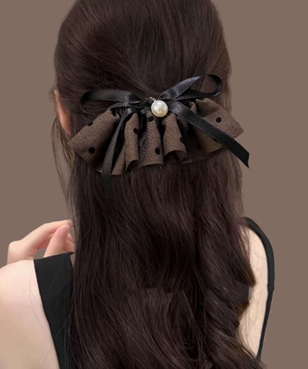 上品なドット柄フリルと、つややかなフェイクパールがアクセントになったヘアクリップ。