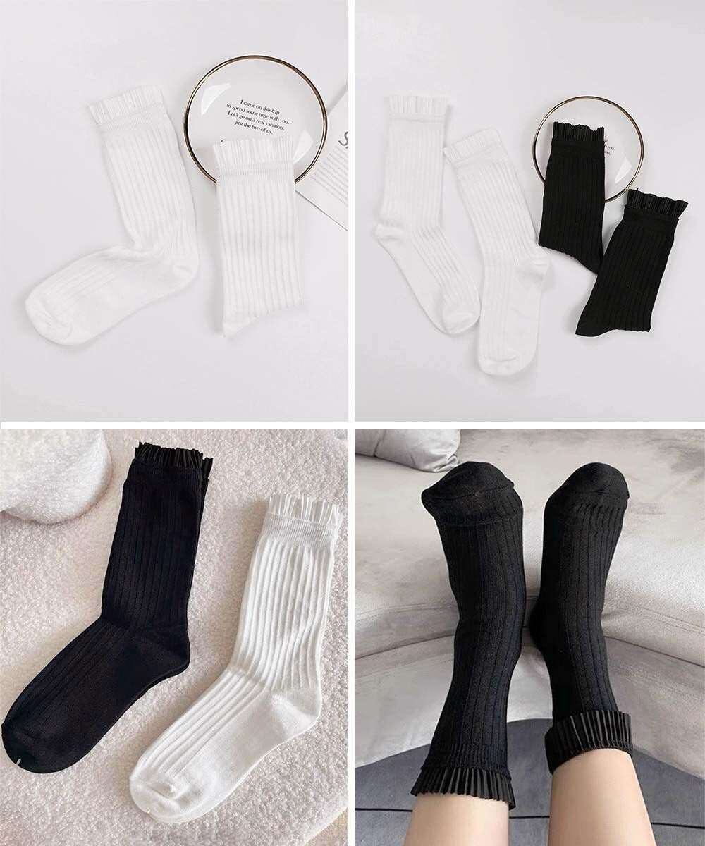 プリーツフリルが目を惹くリブ編みのミドル丈ソックス。