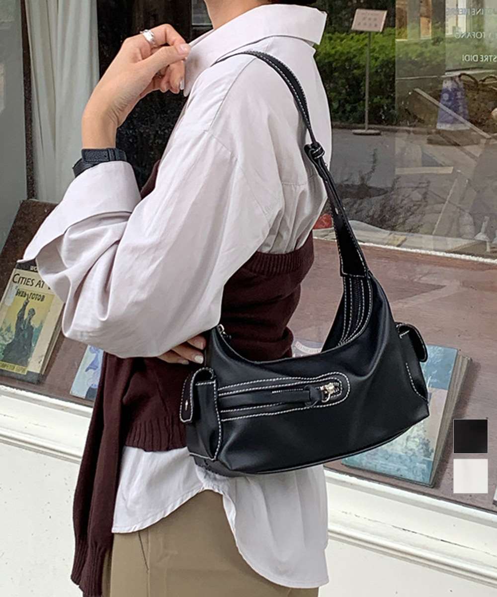 滑らかなフェイクレザーと程よい光沢感が、大人っぽさと上品さを引き立てるショルダーバッグ。