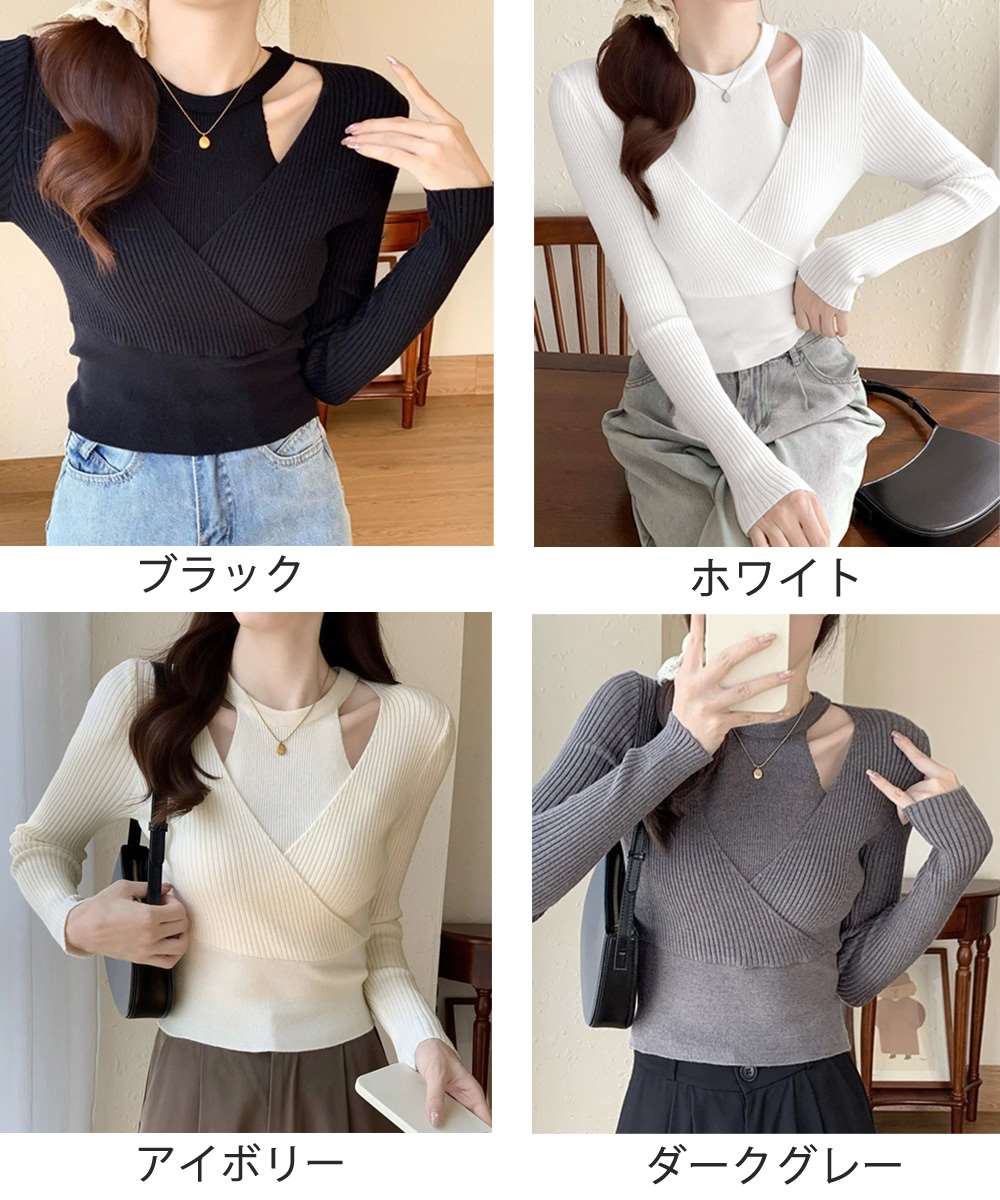 重ね着風のクロスデザインが目を引くリブニットトップス。