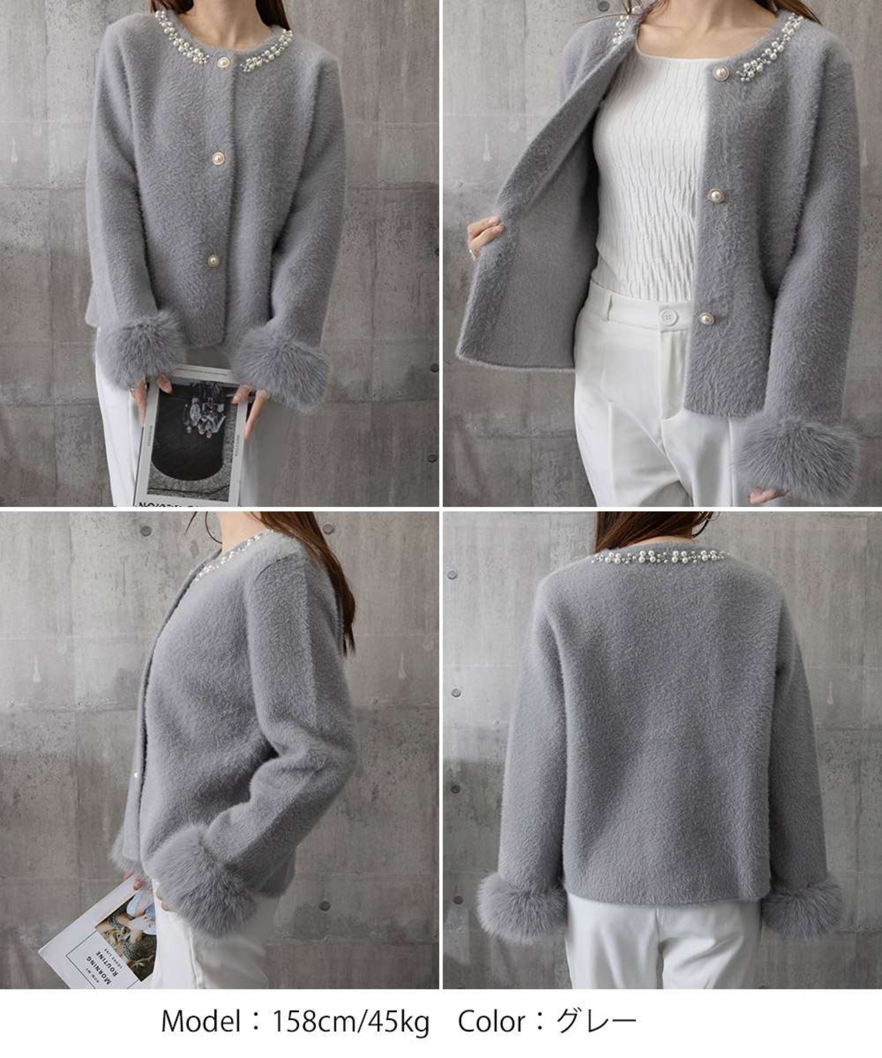 スッキリ見えるノーカラーにパールをあしらったきれいめカーディガン。