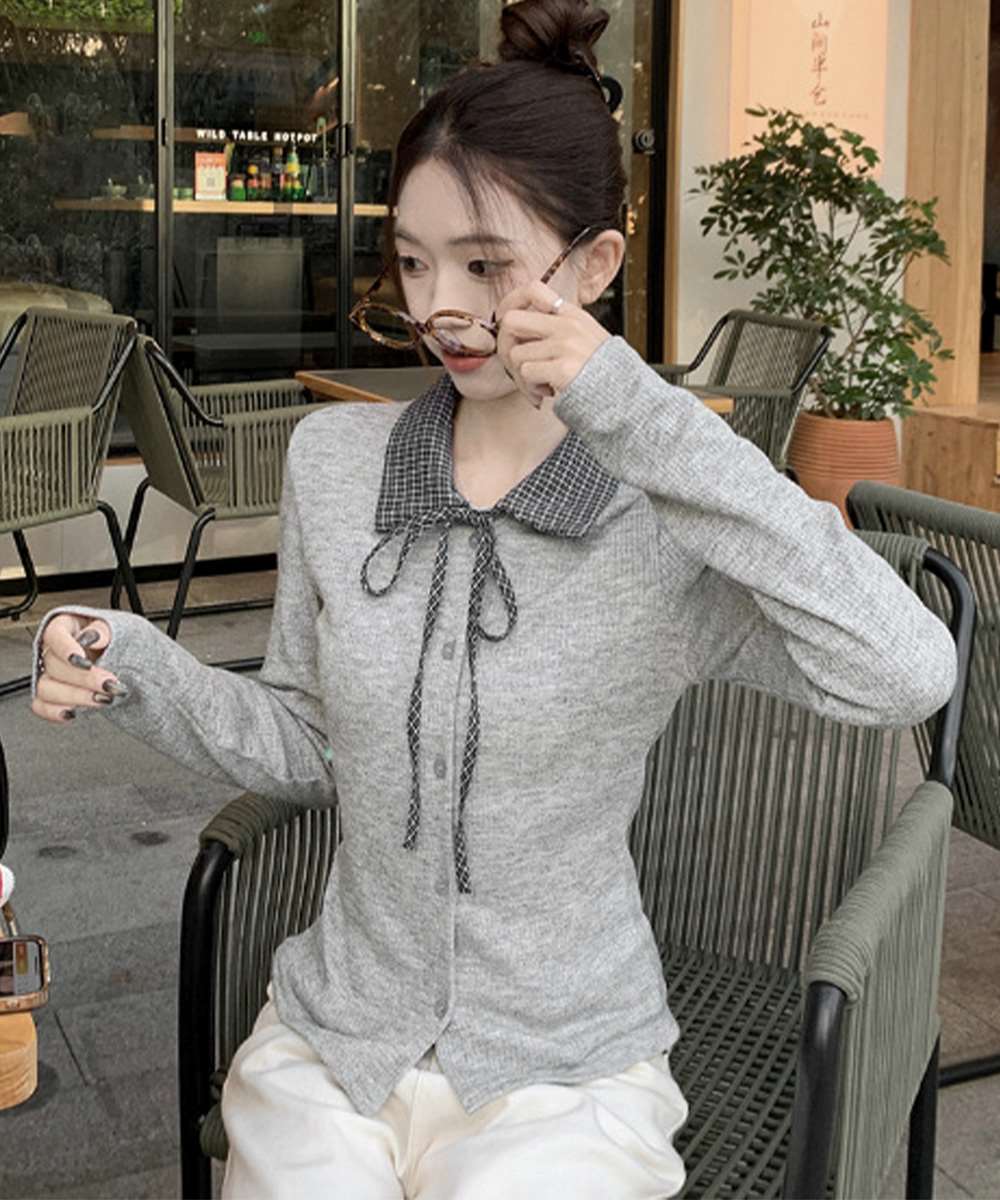 チェックカラー リボン リブニット トップス
