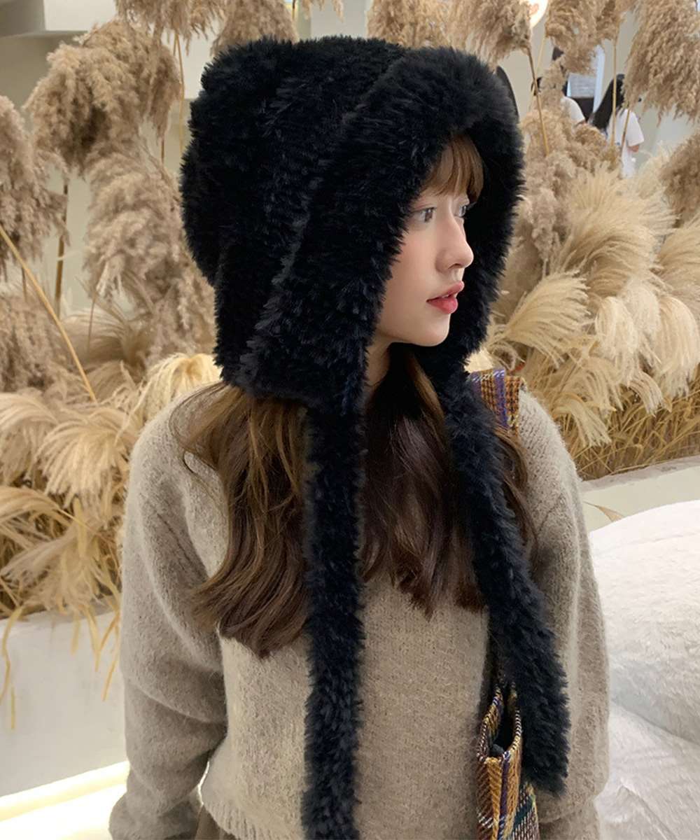 もこもこの毛並みが顔まわりに柔らかいニュアンスを添え、被るだけで季節感のある可愛いスタイリングに。