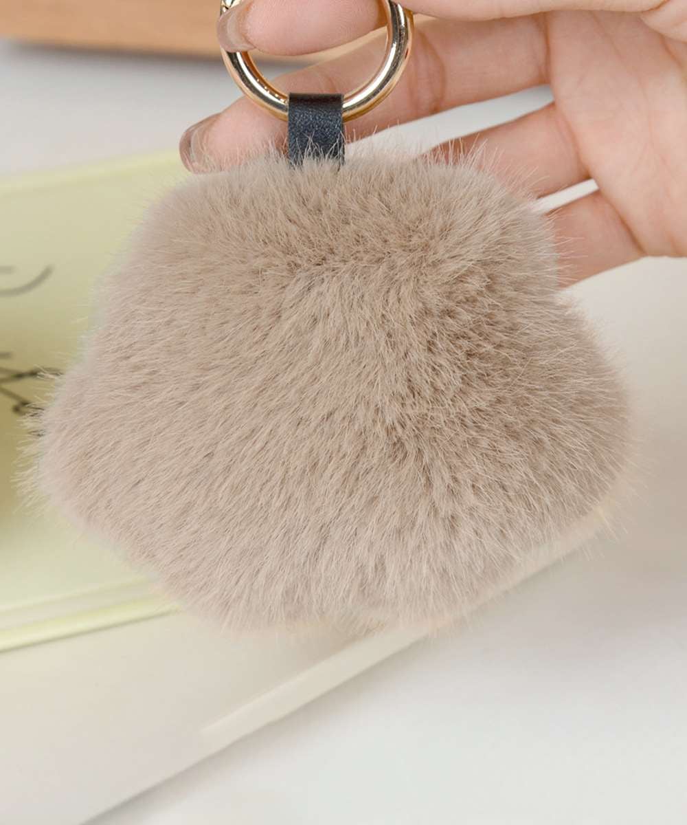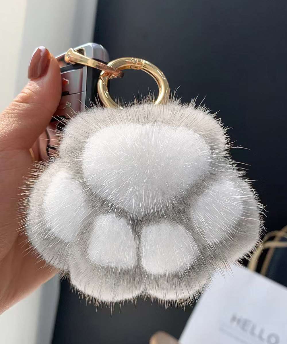 ふわふわの手触りが心地よい、猫の肉球デザインのファーチャームキーホルダー。