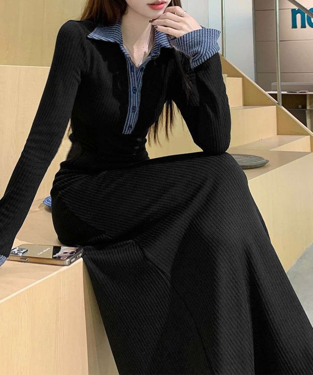 配色デザインが目を惹くリブニットのポロ衿ロングワンピース。