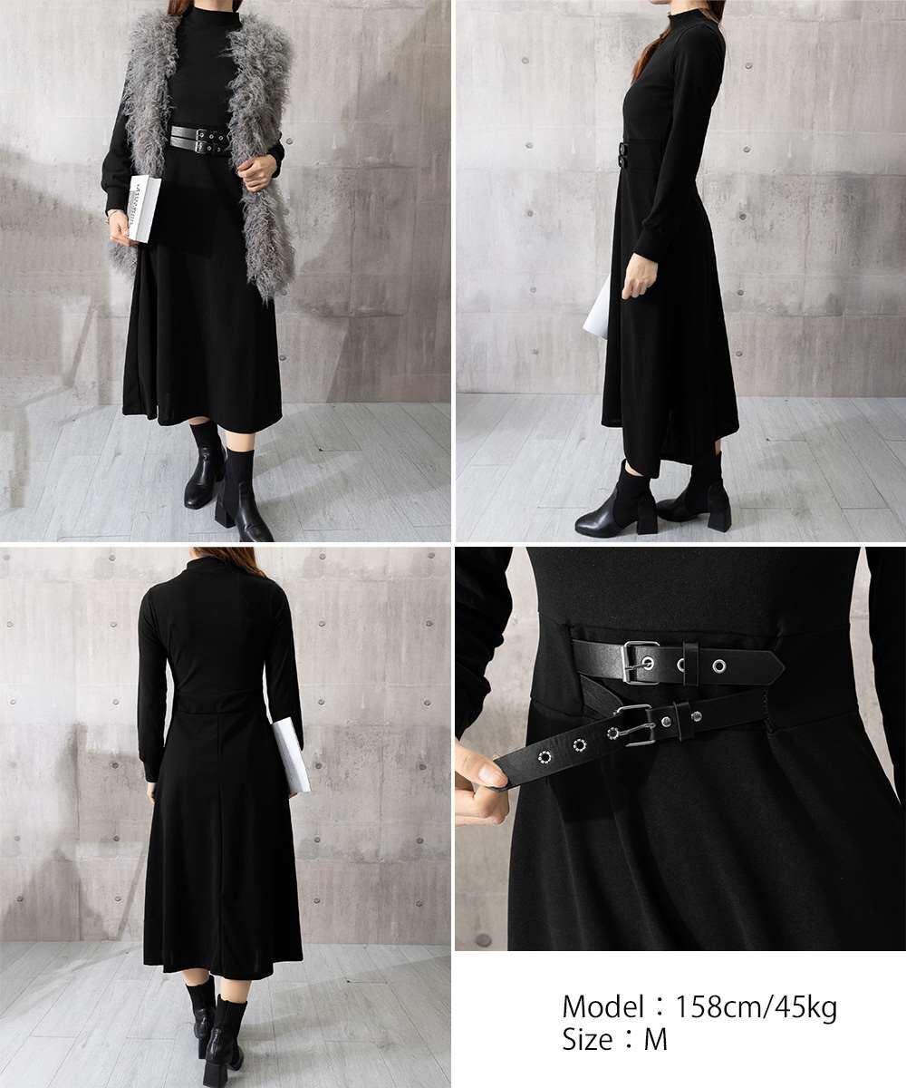異素材切り替えとウエストベルト飾りがアクセントのロング丈ワンピース。