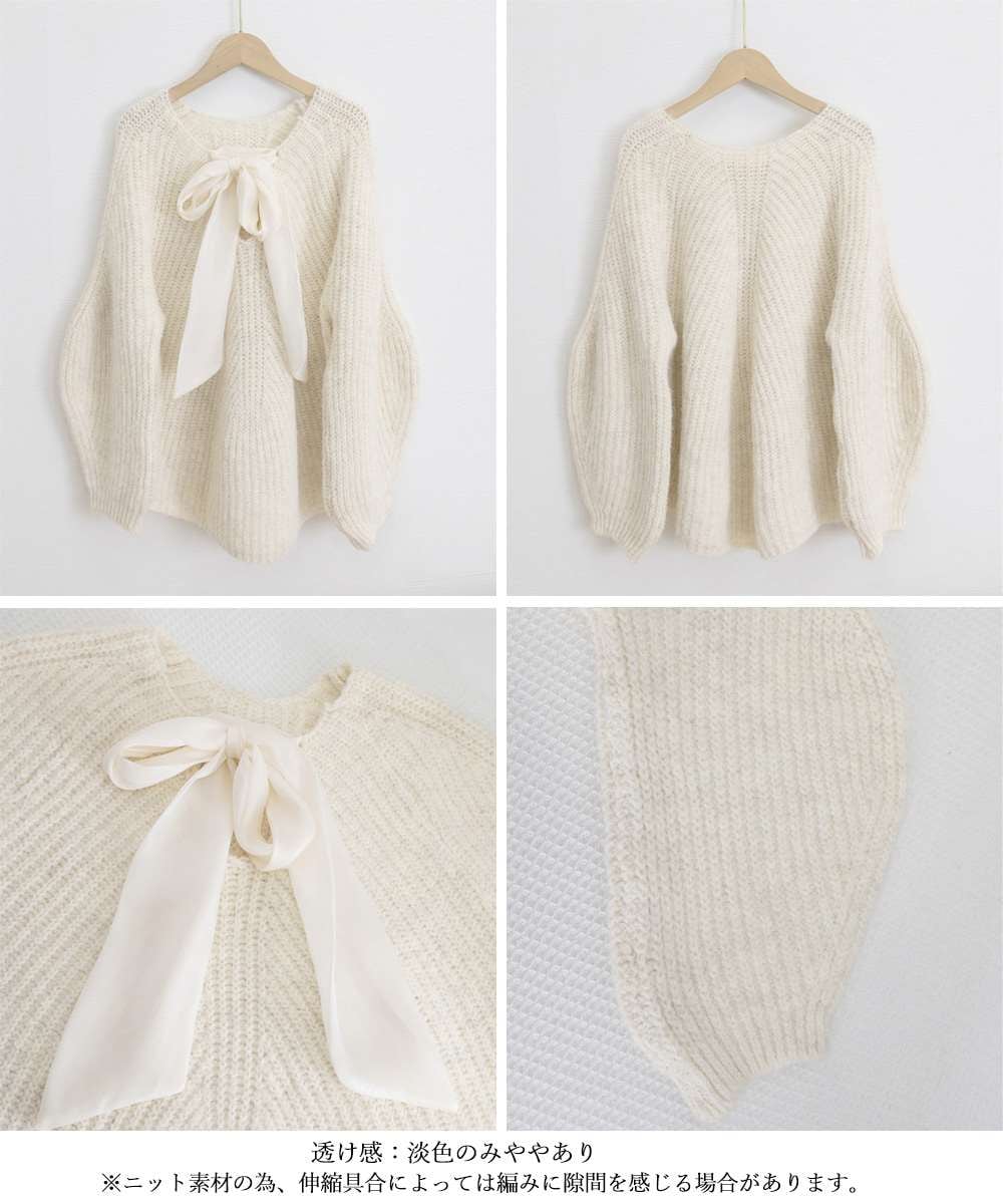 顔まわりを華やかに見せる、シルキーリボン付きのフェミニンニットトップス。