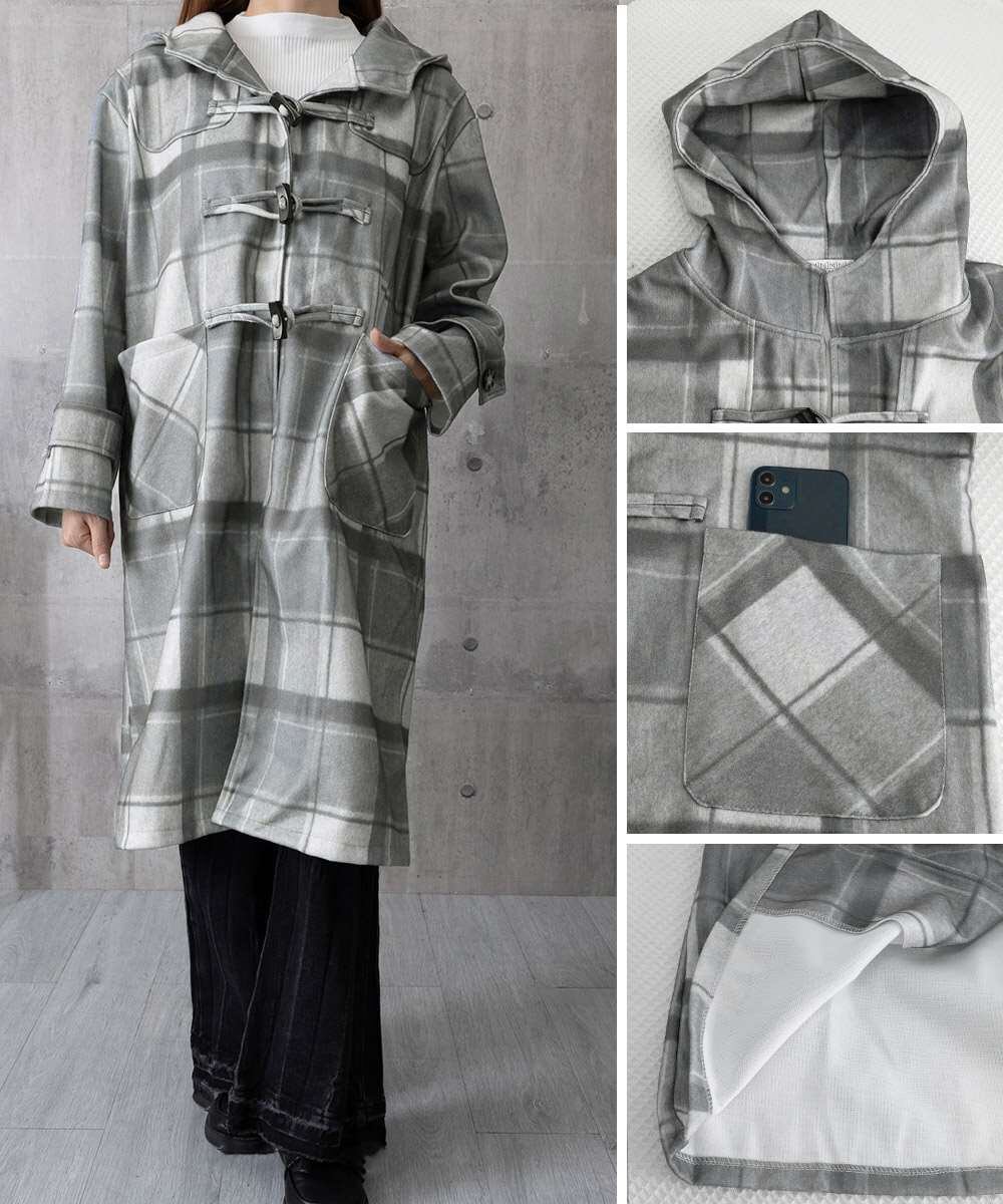 チェック柄とトグルボタンが印象的な、フード付きロングコート。