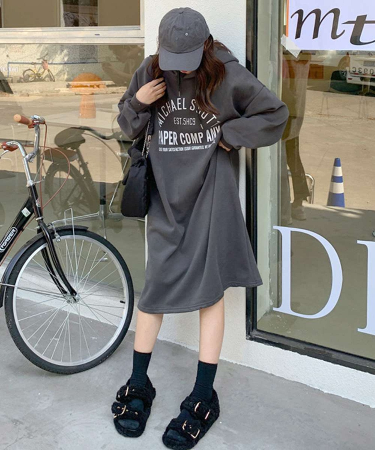 キャップやミニショルダーバッグ、ブーツを合わせてストリートカジュアルなスタイリングが楽しめる。