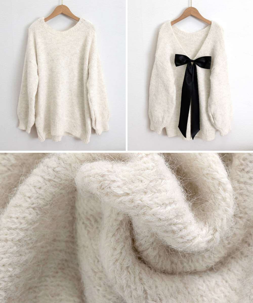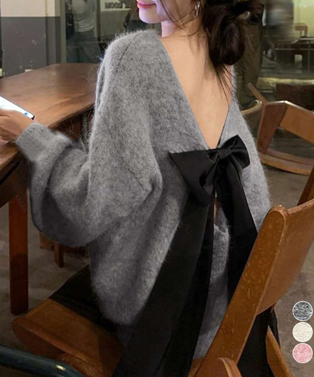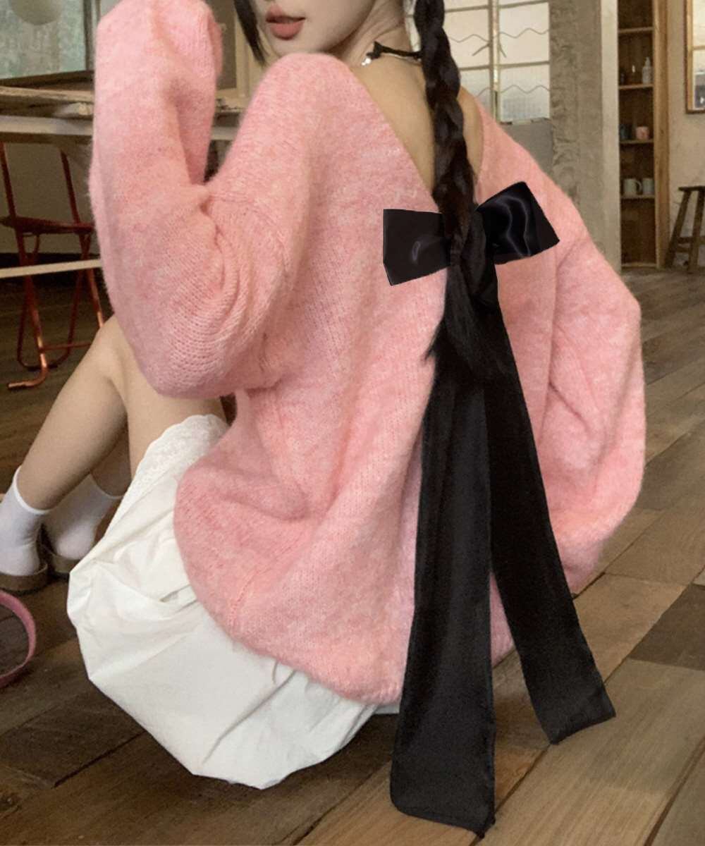 バックオープン リボン ニット トップス 韓国風
