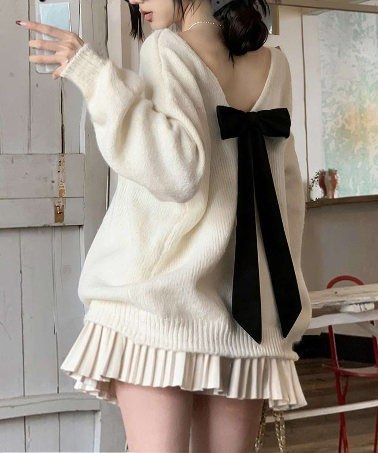 背中で揺れる大きなリボンが視線を引き寄せ、後ろ姿まで可愛く決まる。