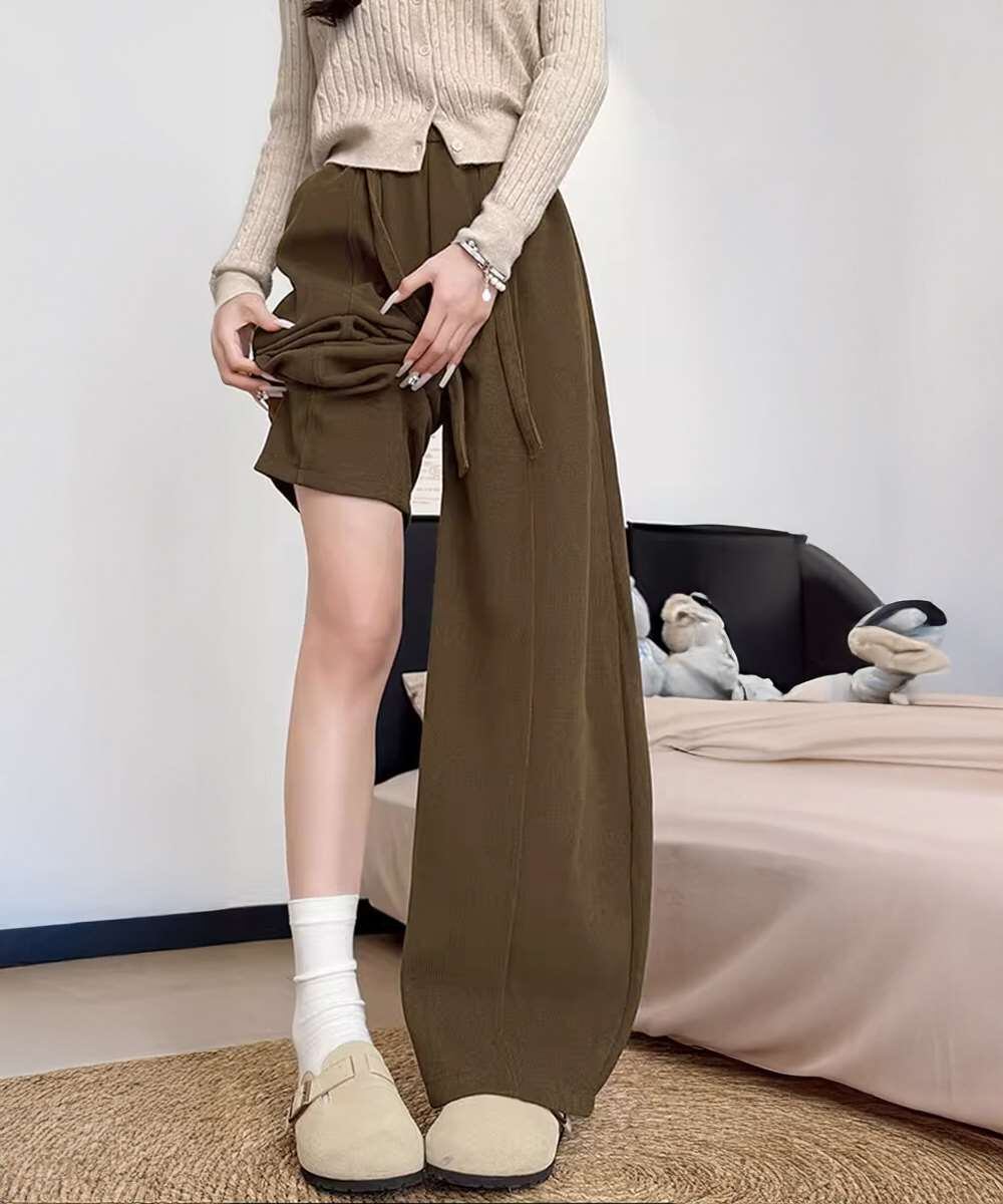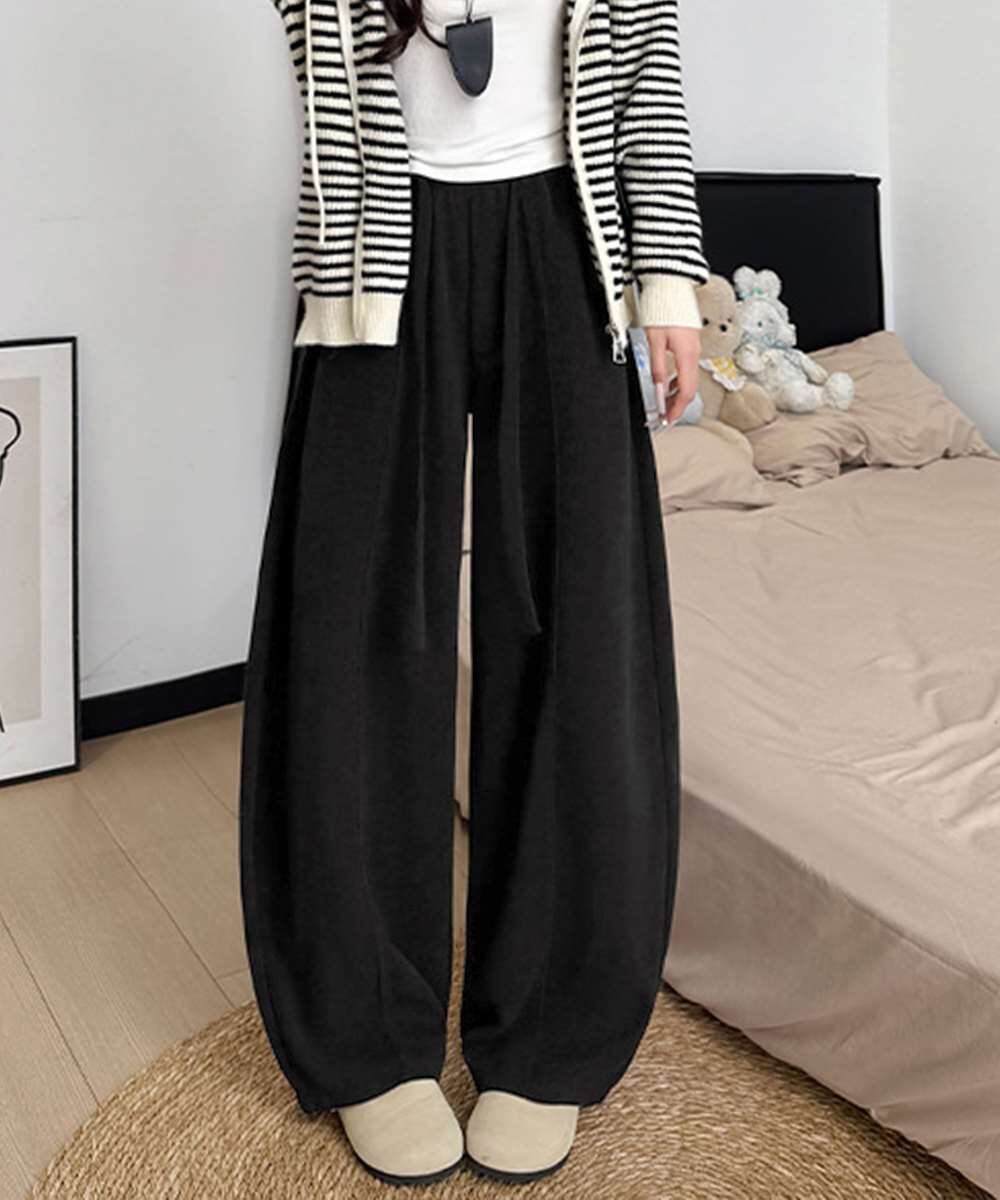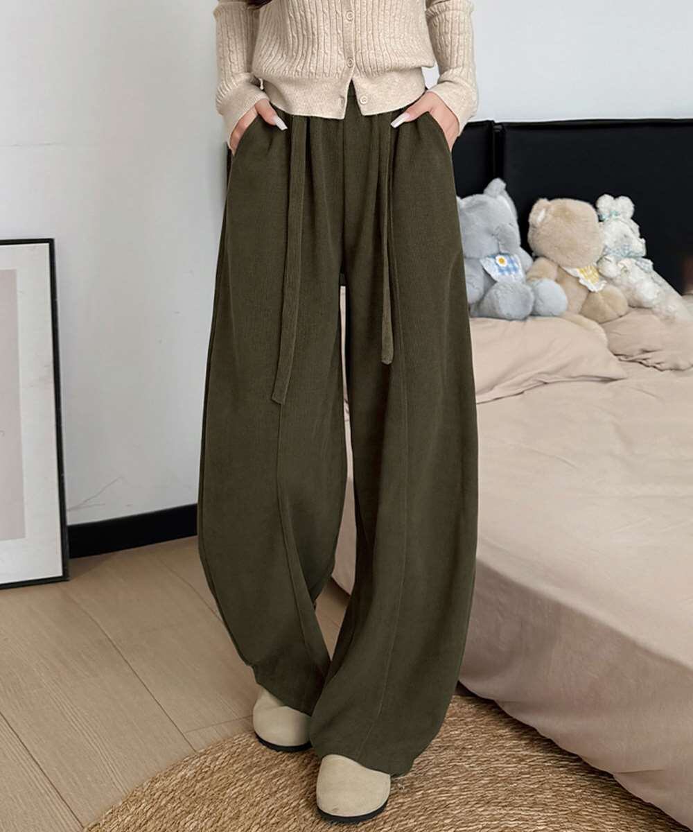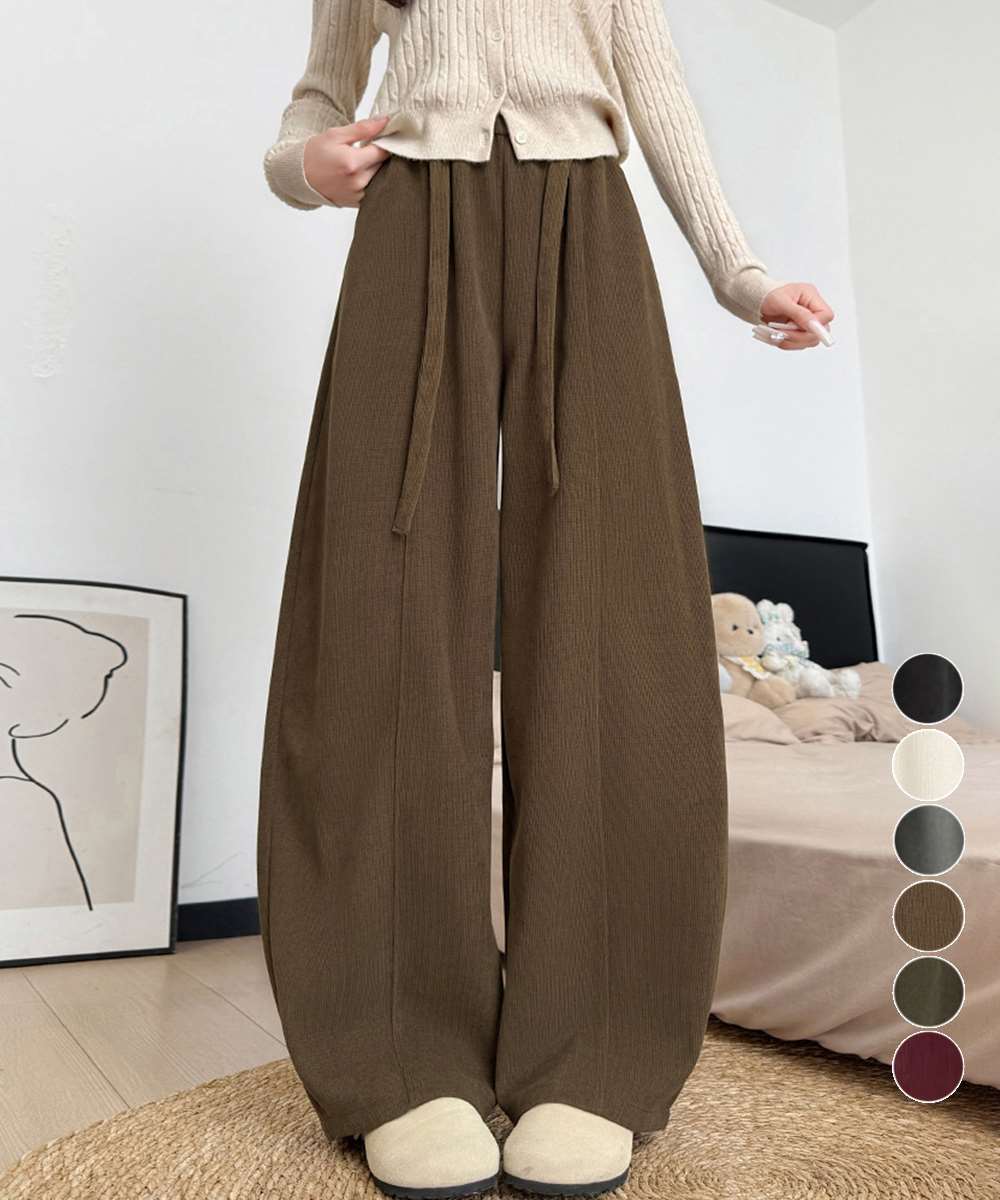 ハイウエストで脚がすらっと見えるワイドカーブパンツ。