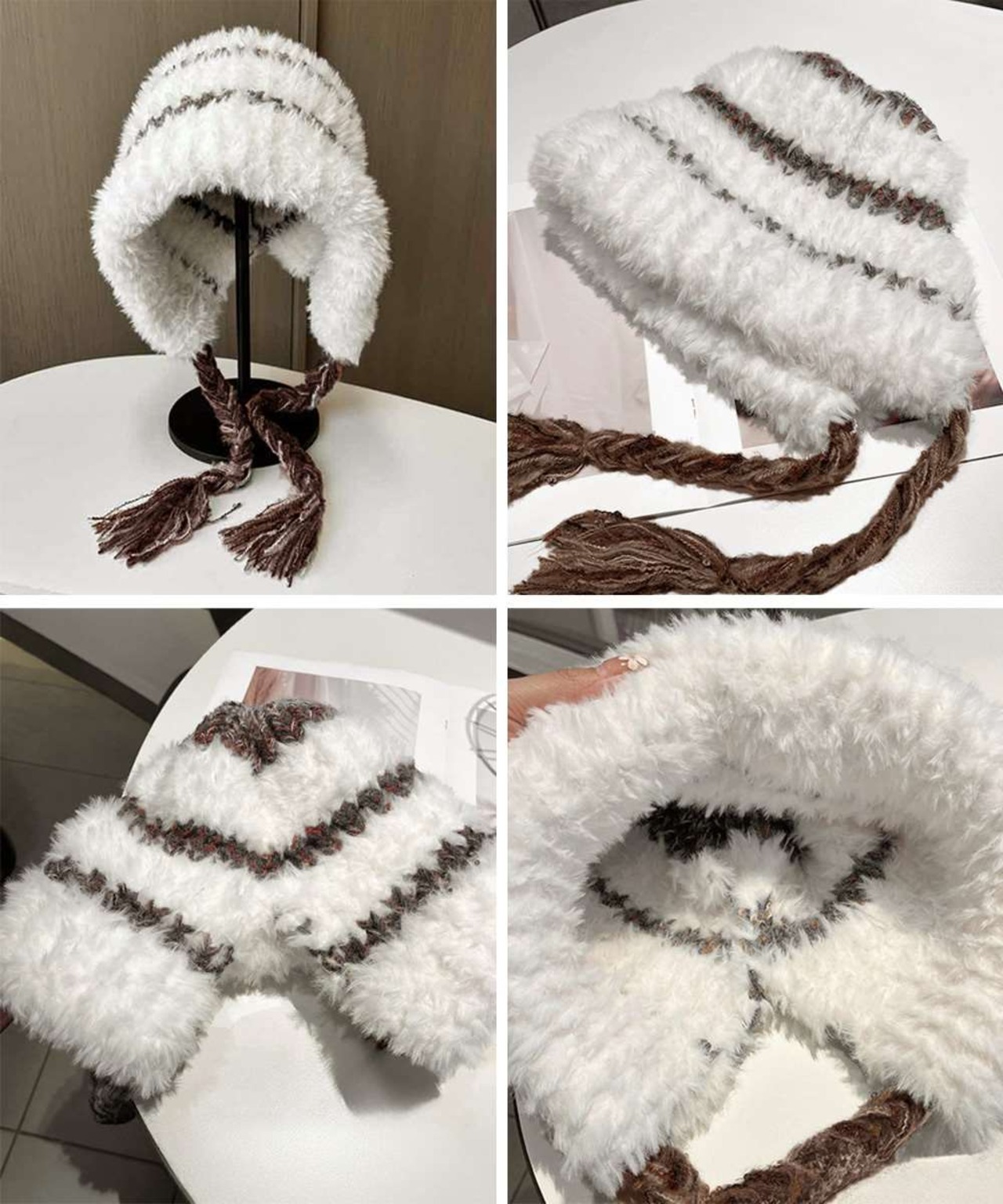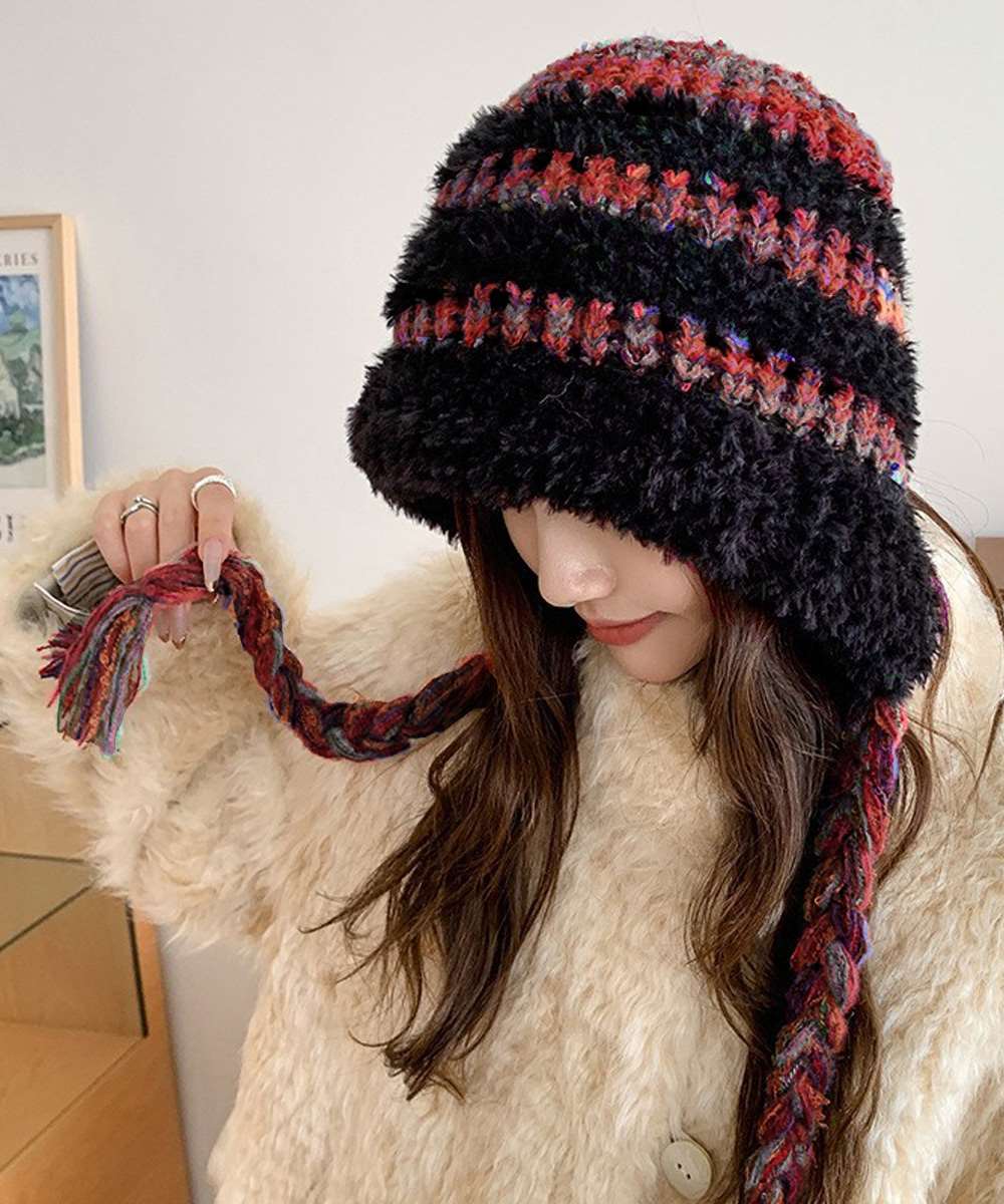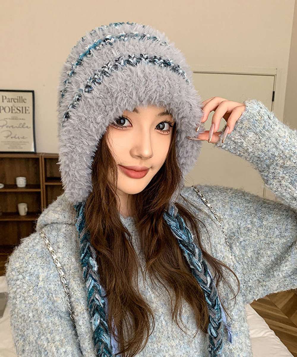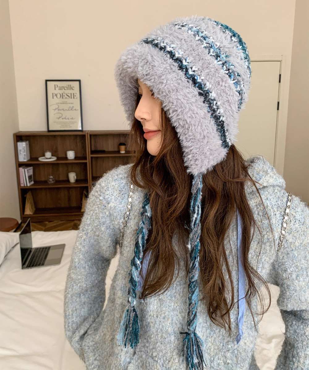柔らかな編地と編み込みストラップがポイントで、防寒しながら可愛らしいアクセントをプラス。