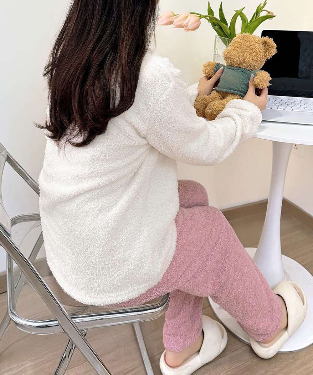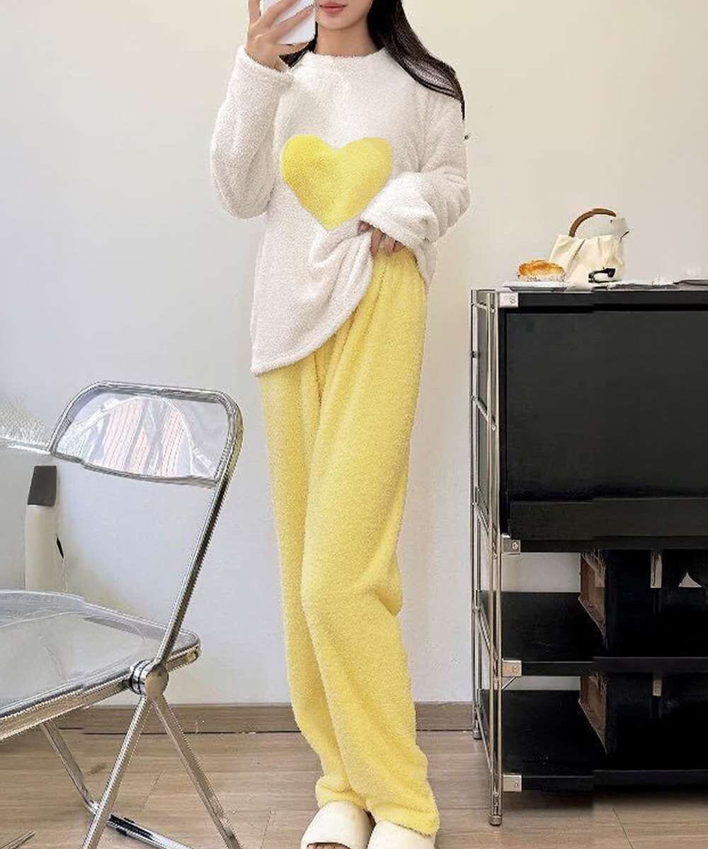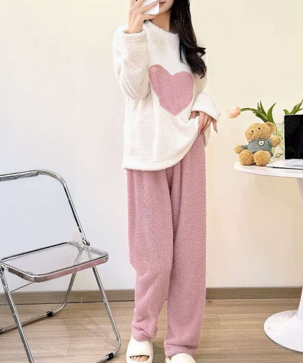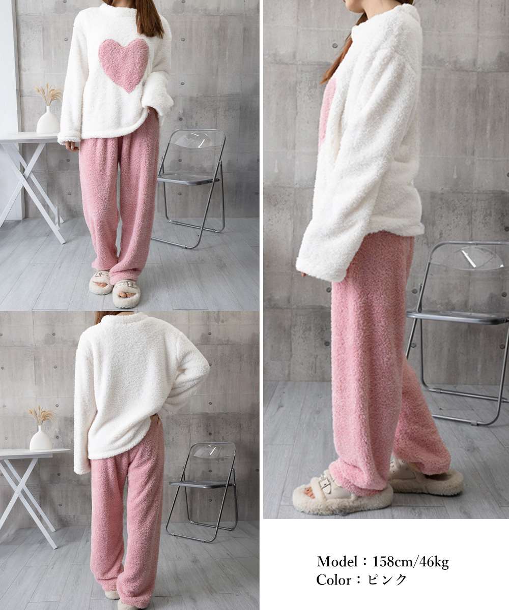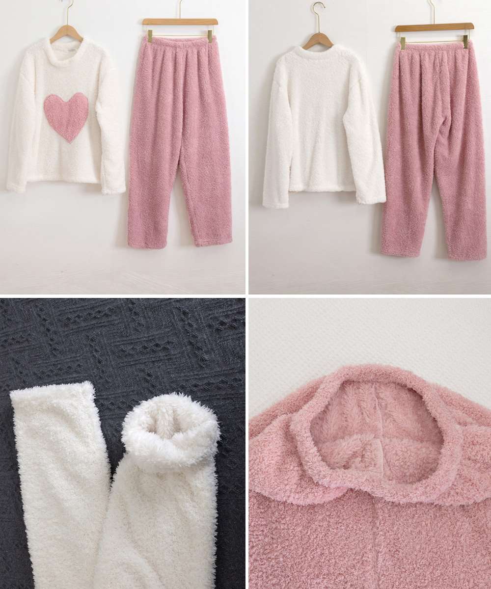 ハート柄が可愛いもこもこルームウェア上下セット。