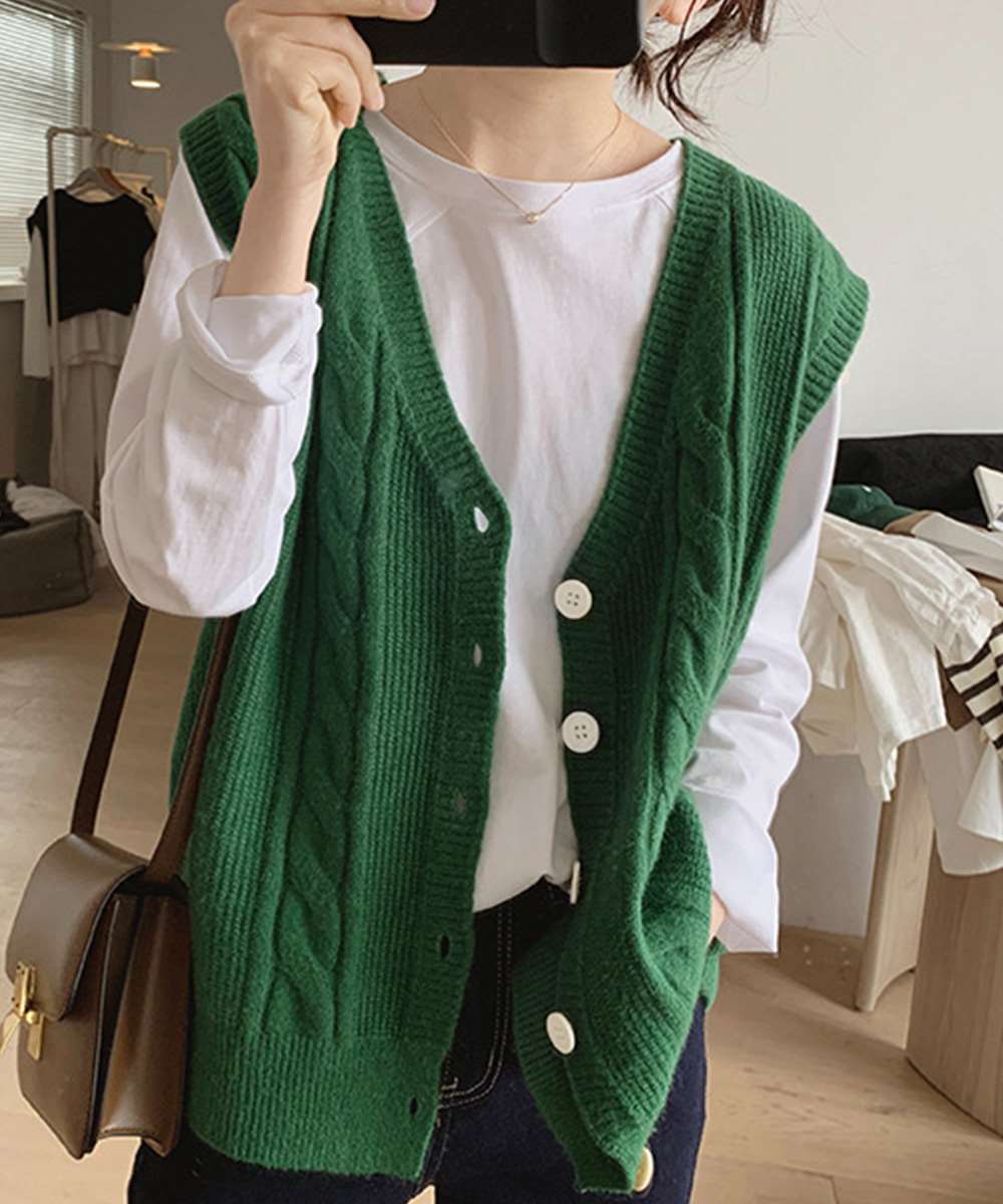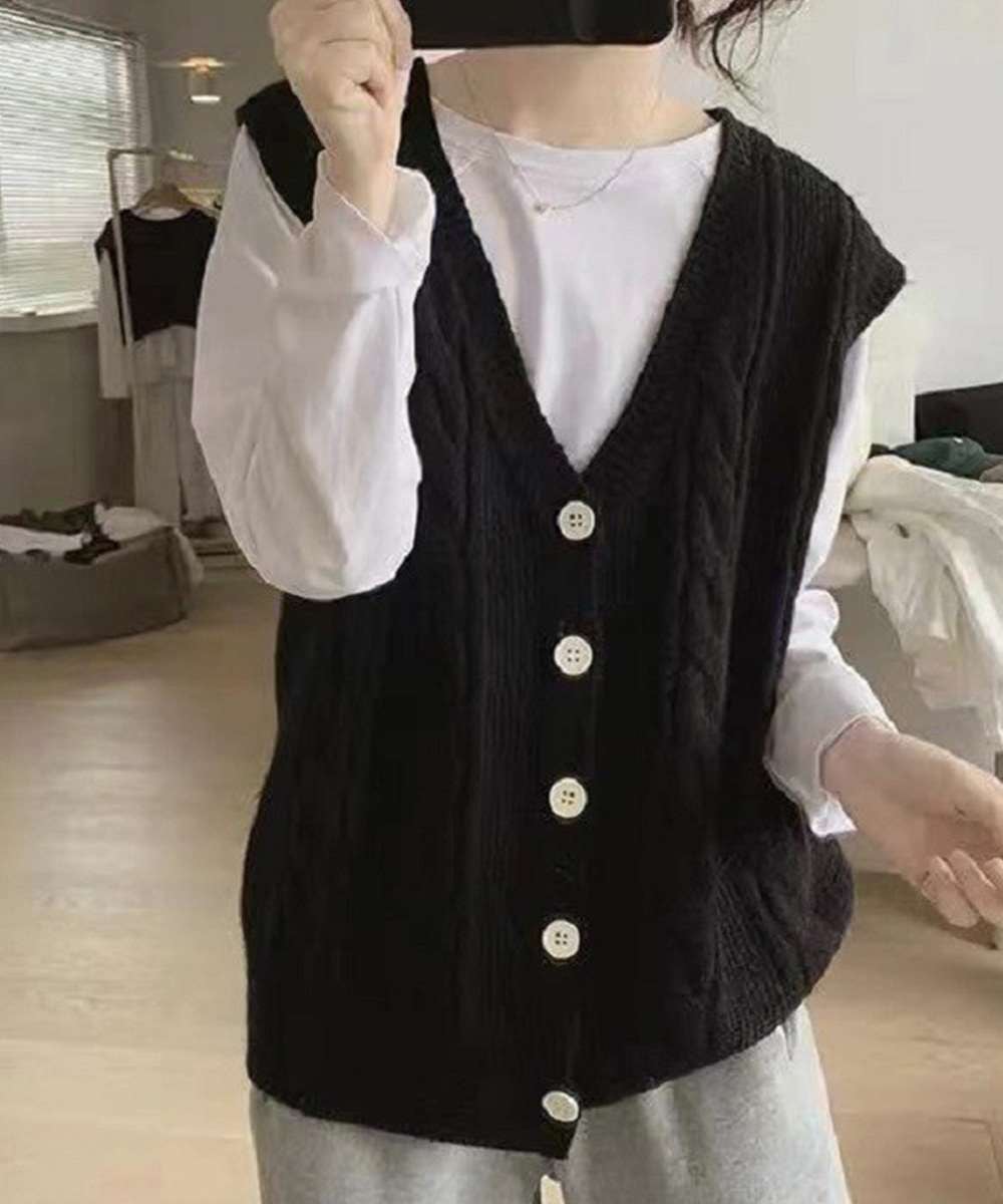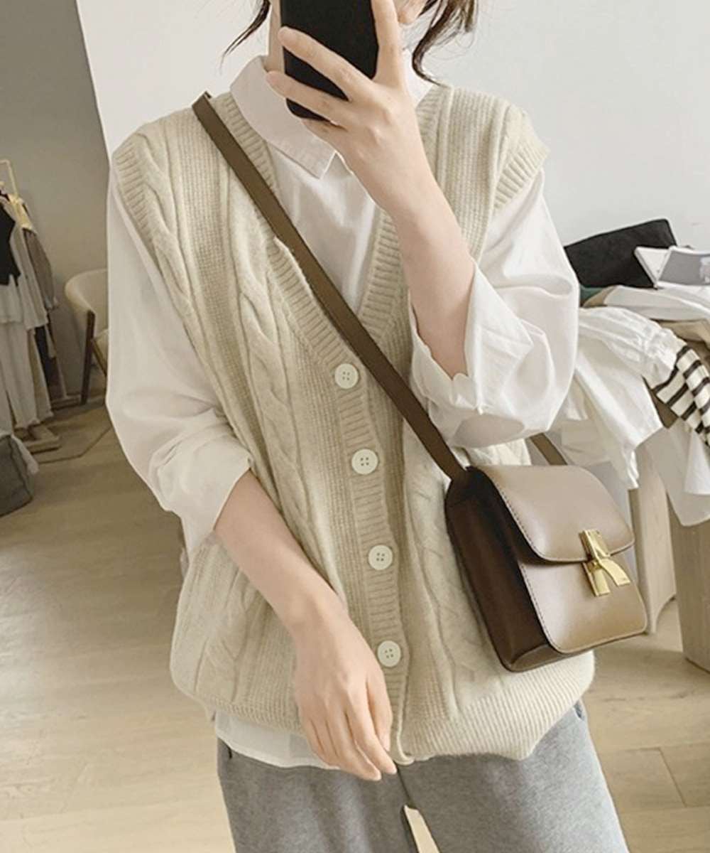ケーブル編みがポイントのVネックニットベスト。