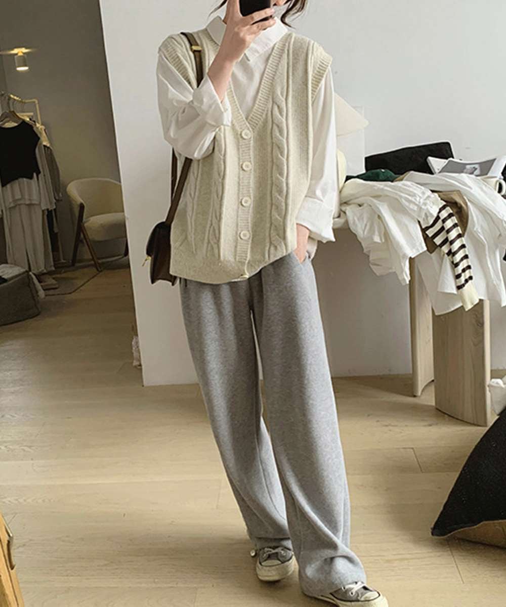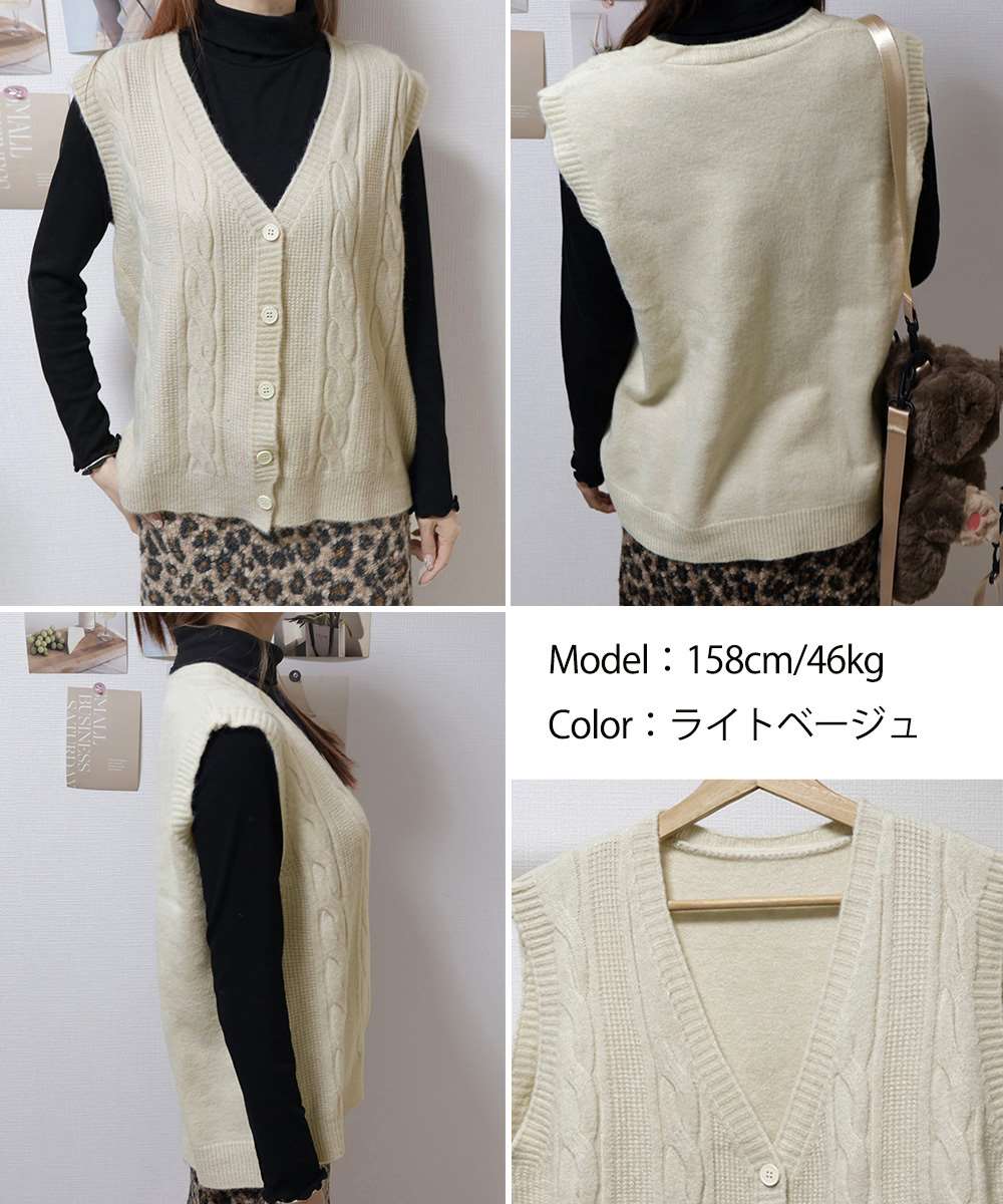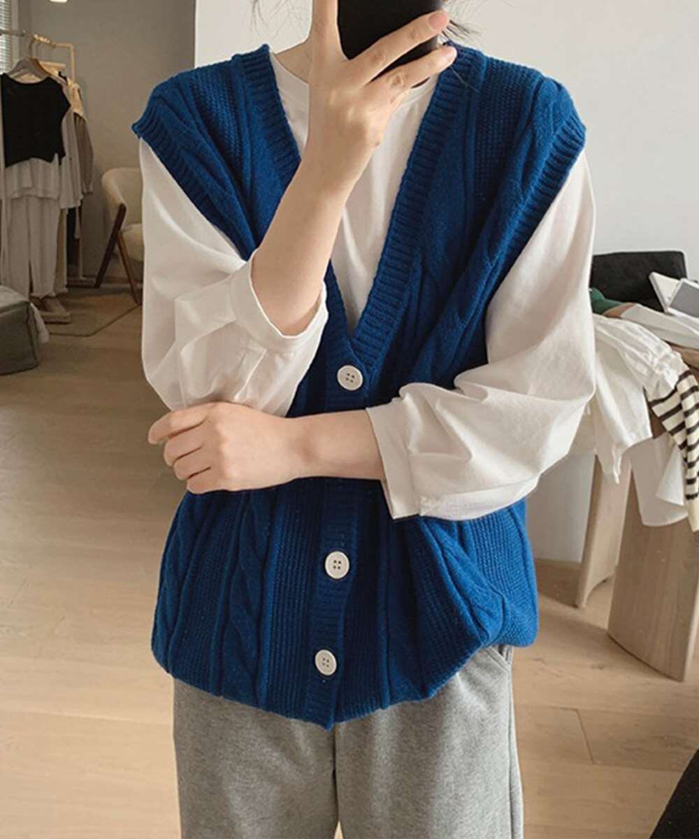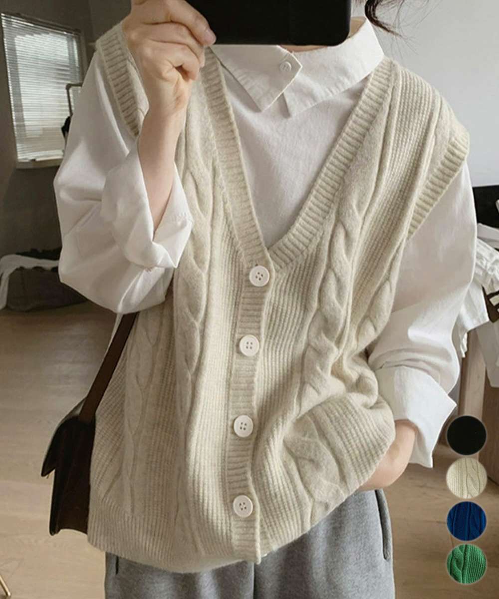 ケーブル編みがポイントのVネックニットベスト。