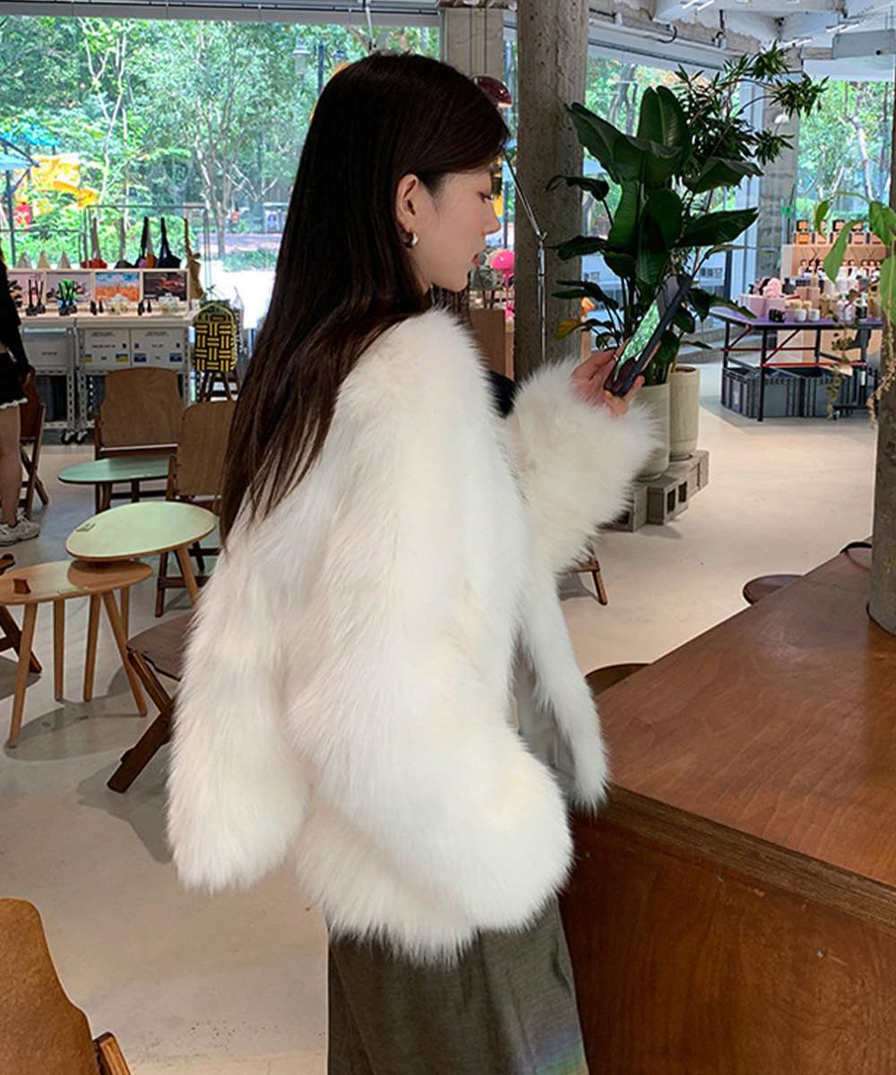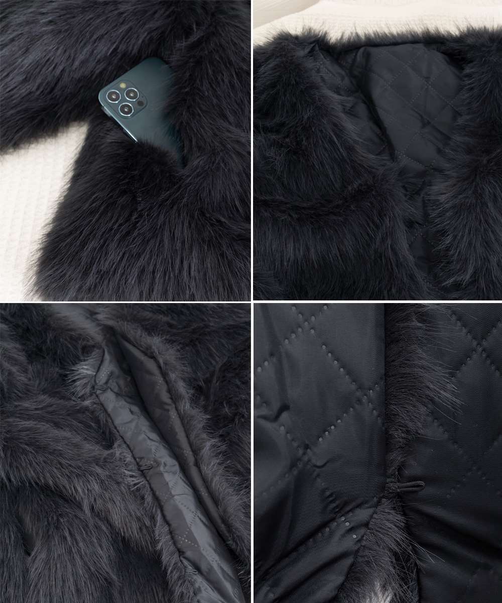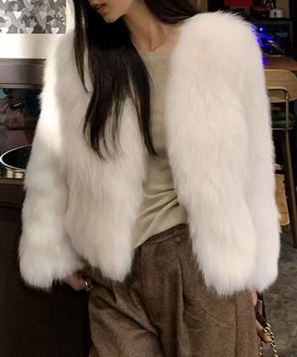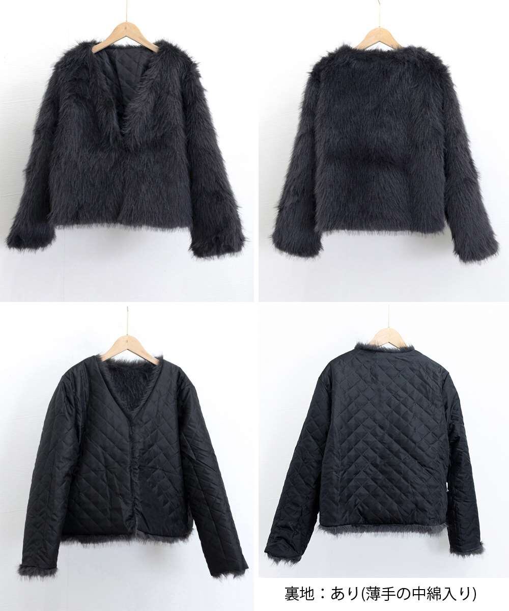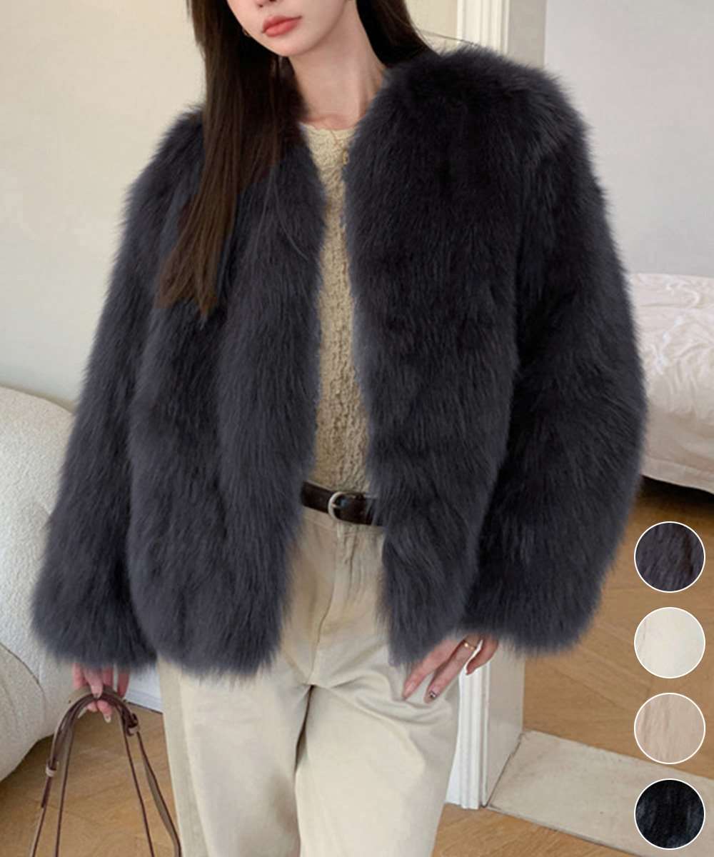 ボリューム感たっぷりのフェイクファーを使用した、ノーカラージャケット。