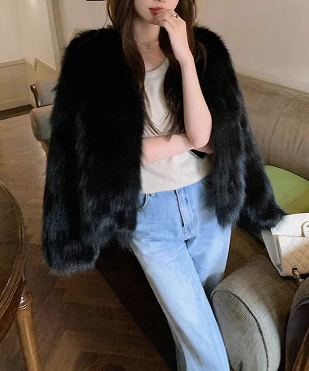 韓国風 ノーカラー フェイクファー ジャケット