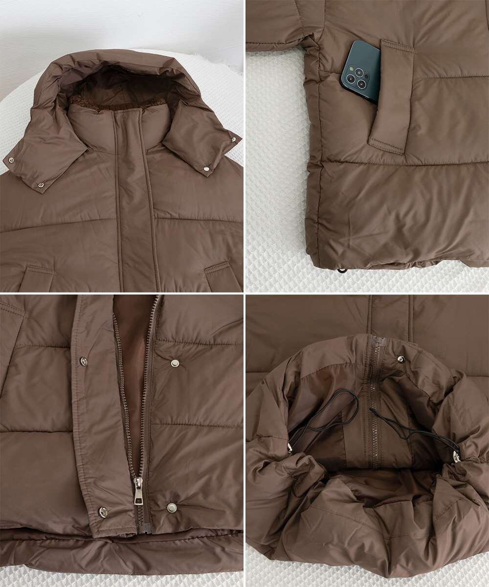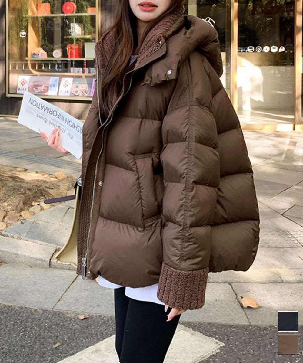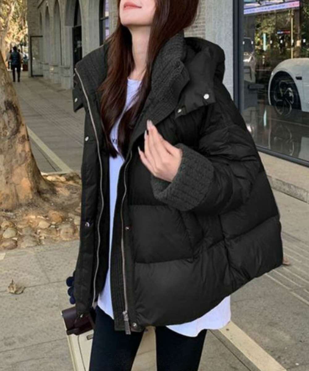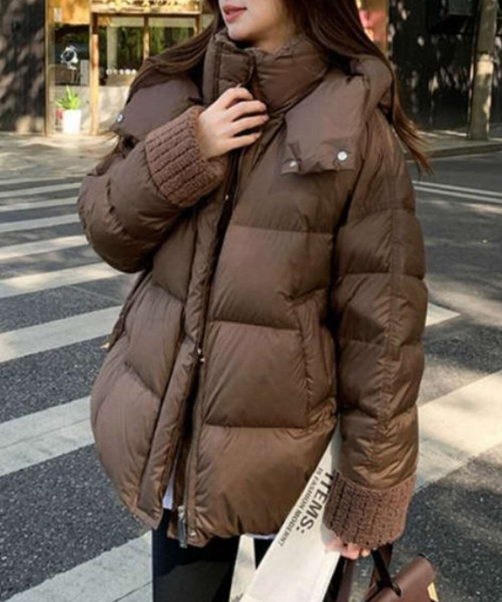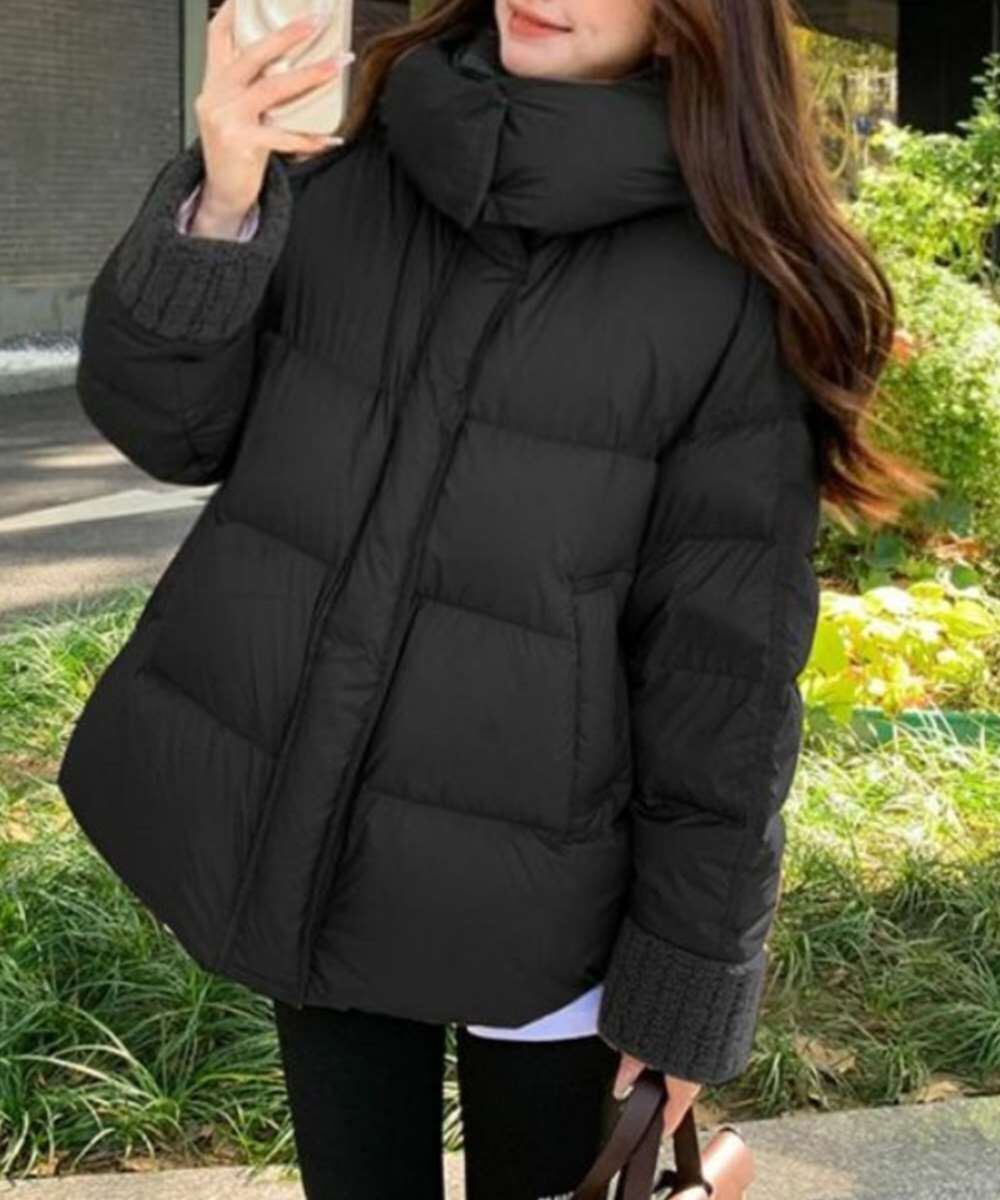 トレンド感のあるボリュームシルエットが魅力の、フード付き中綿ダウンジャケット。
