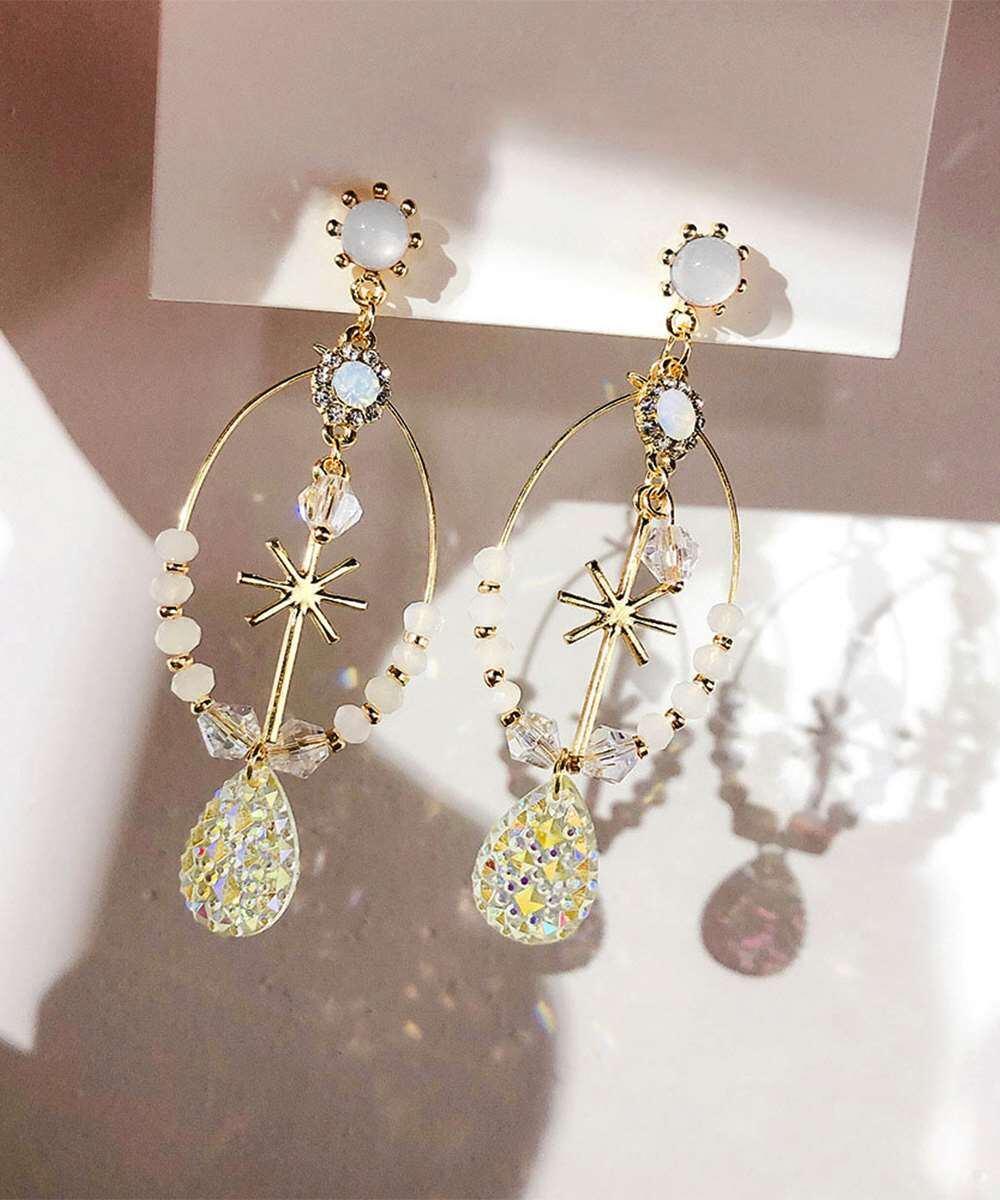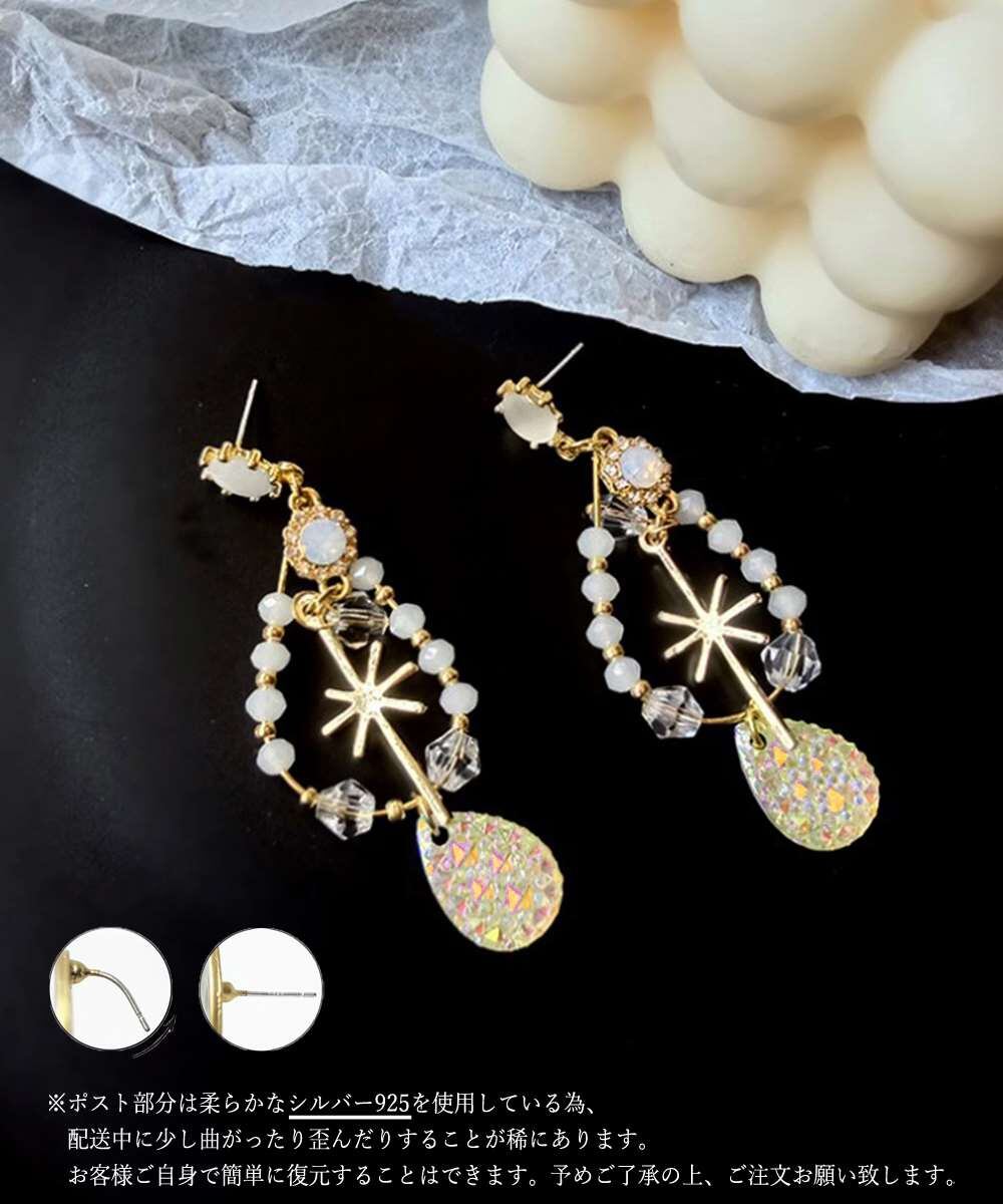 ワイヤーモチーフにビジュービーズやラインストーンを組み合わせた大振りのピアス。