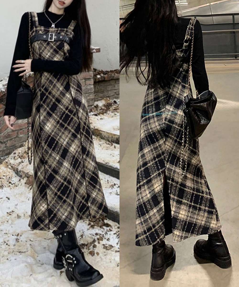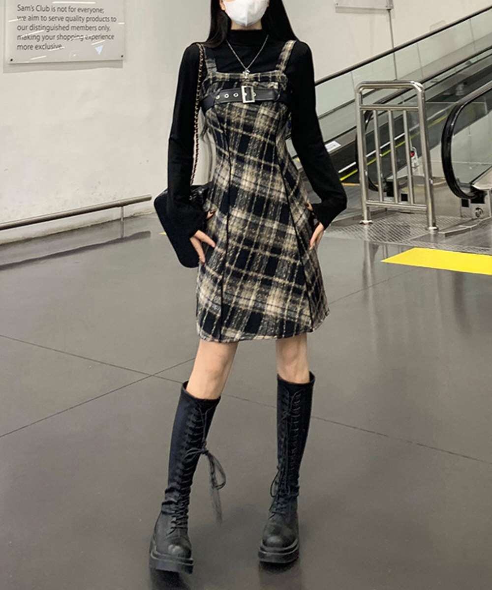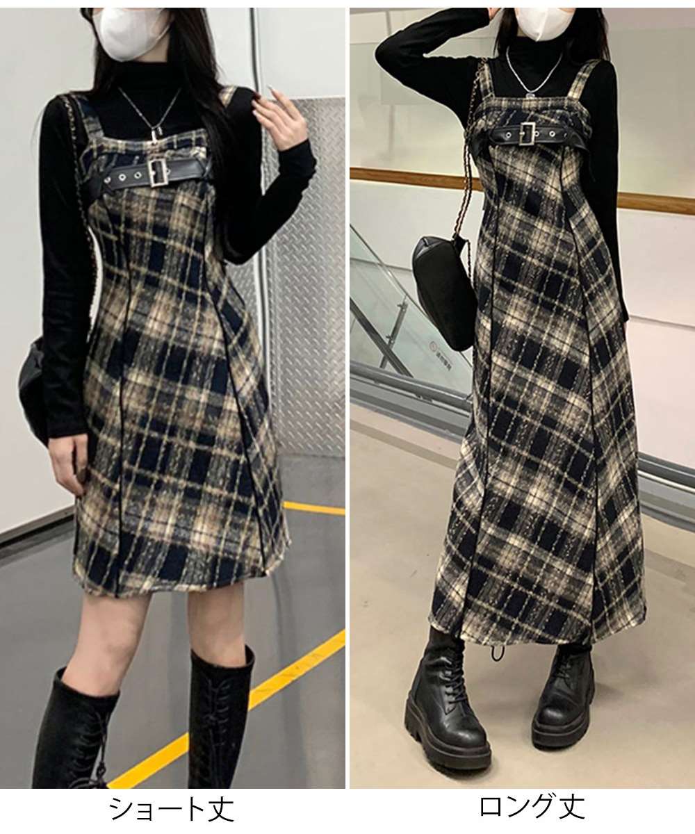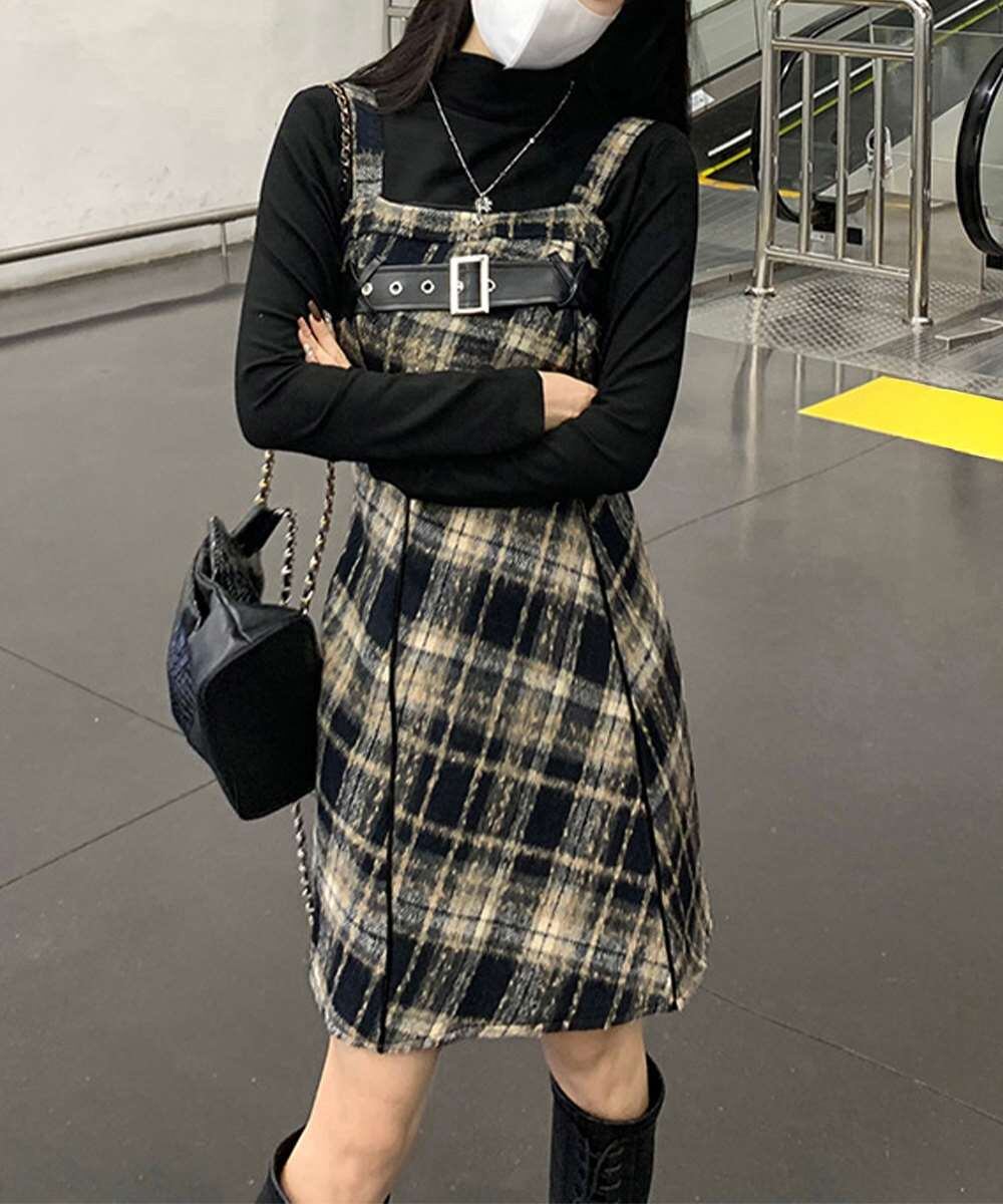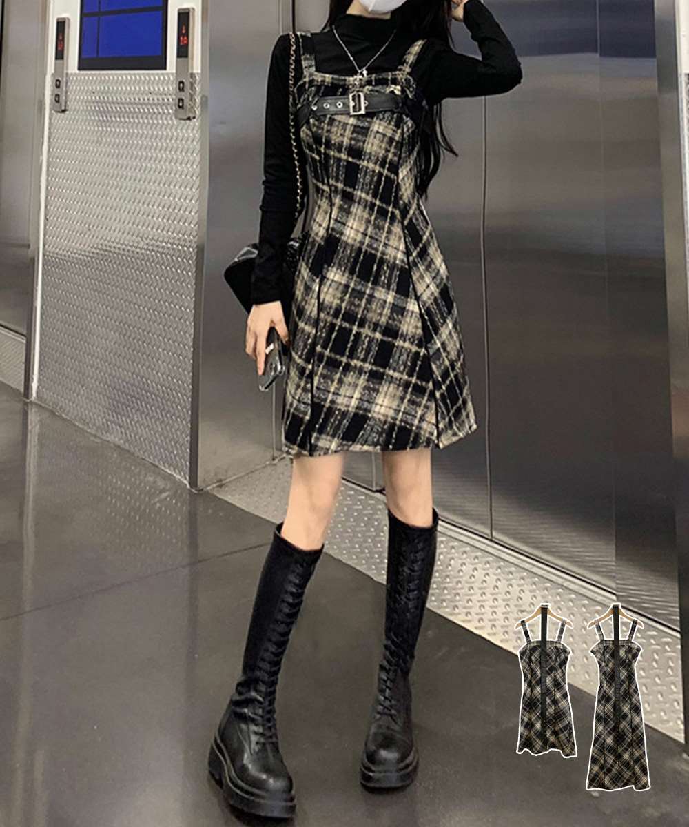 チェック柄が目を引くサスペンダーワンピースで、春秋冬レイヤードスタイルにぴったり。