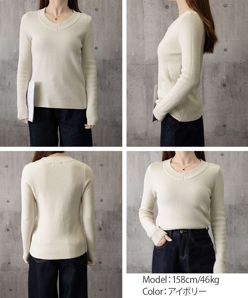 柔らかなリブ編みが魅力の、Vネック長袖あったか裏起毛ニットプルオーバー。