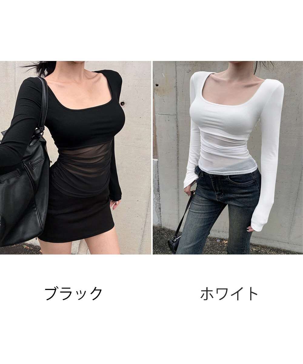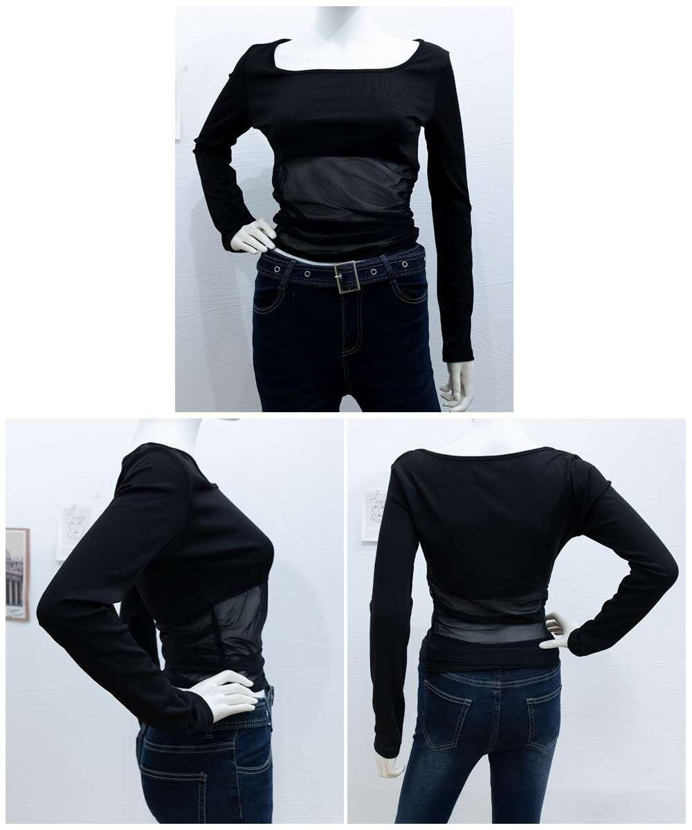 シアー生地切り替えデザインがポイントのロングスリーブトップス。