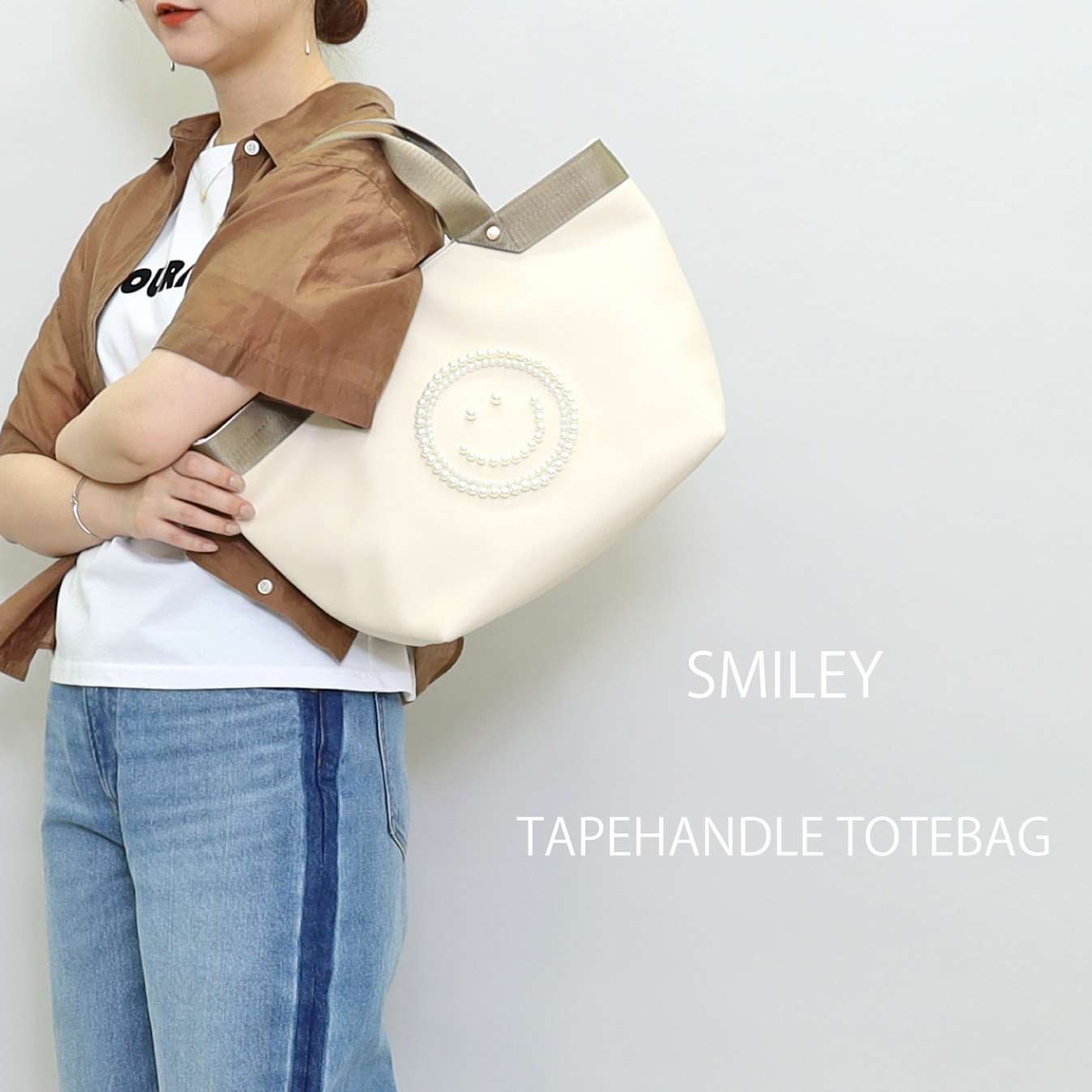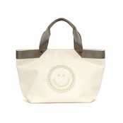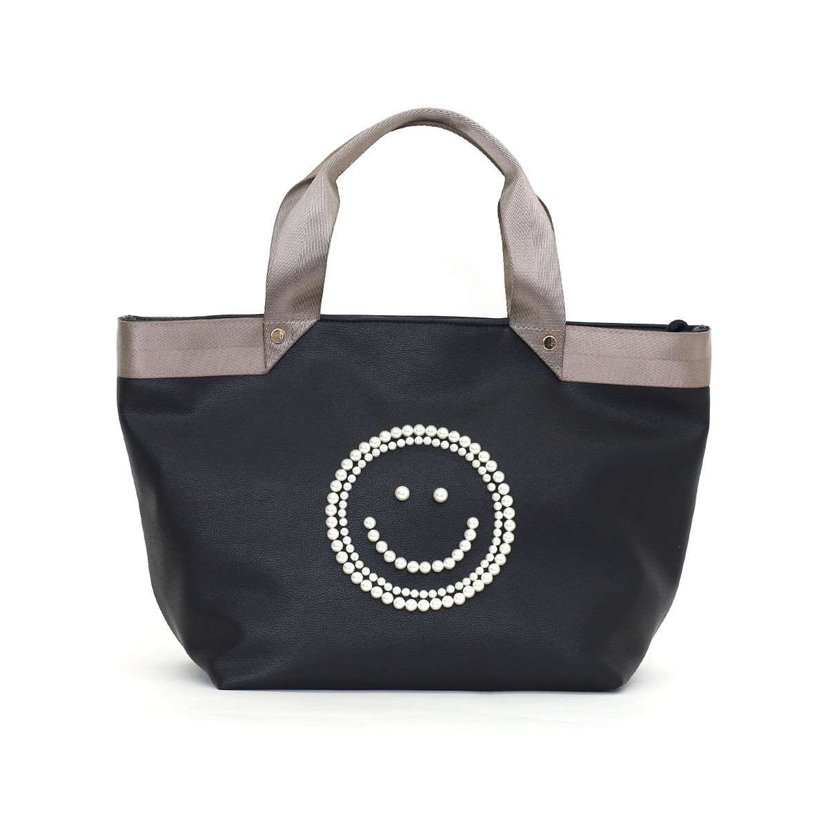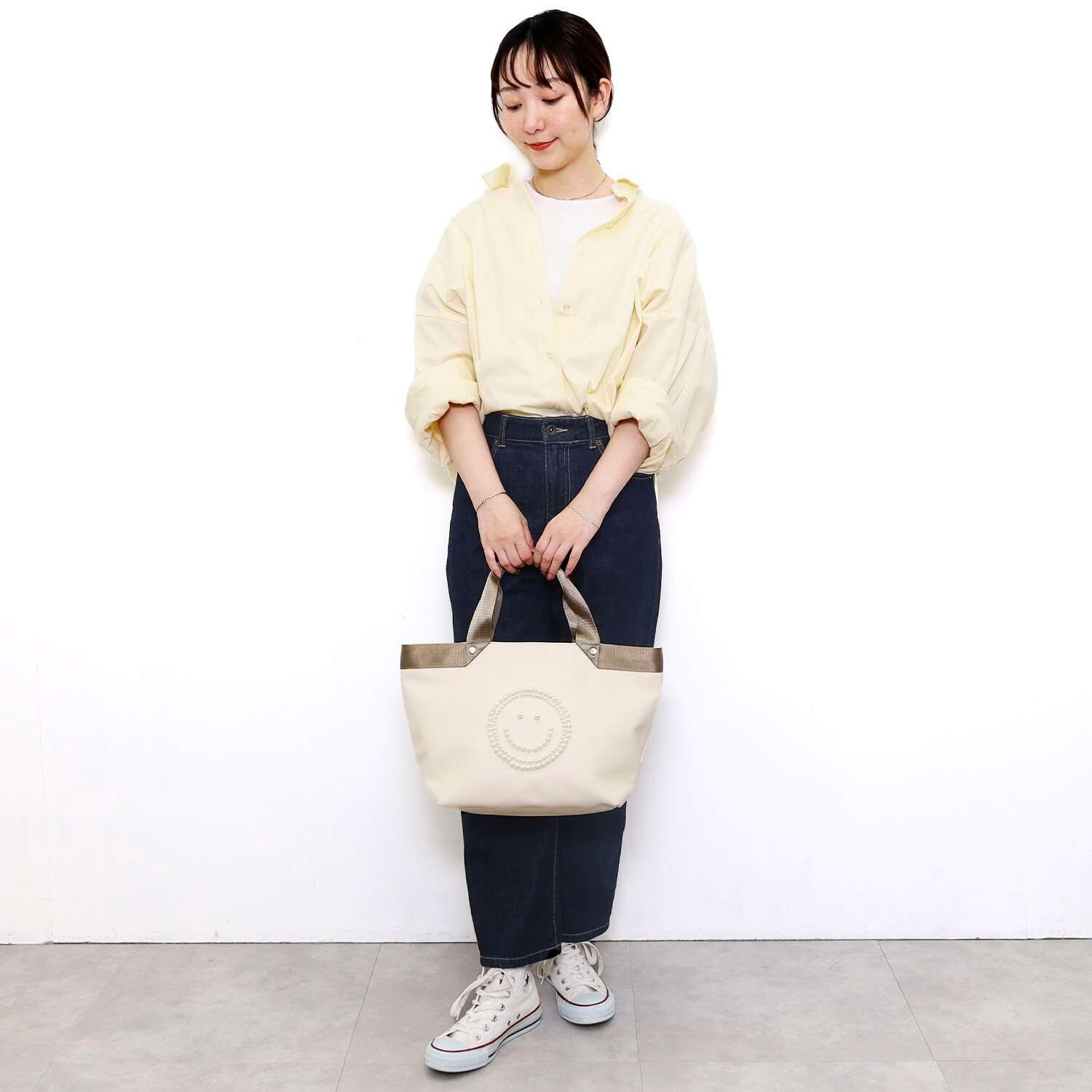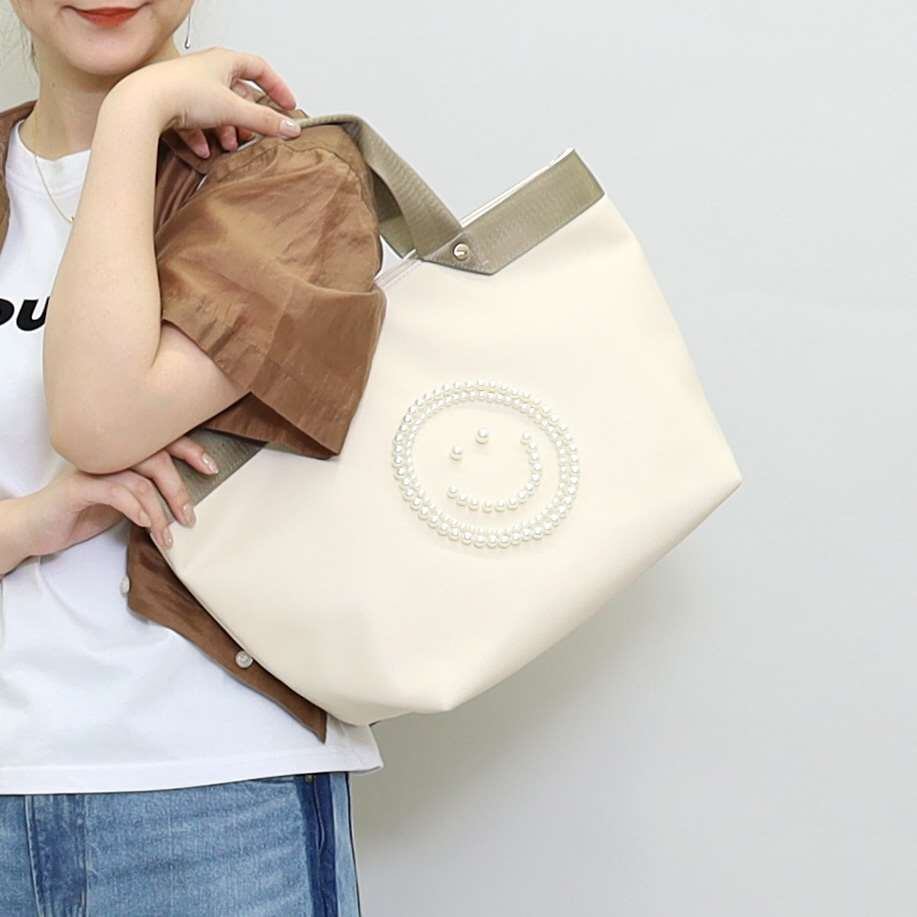 バッグの前面にパールでSMILEYフェイスが施されたトートバッグ