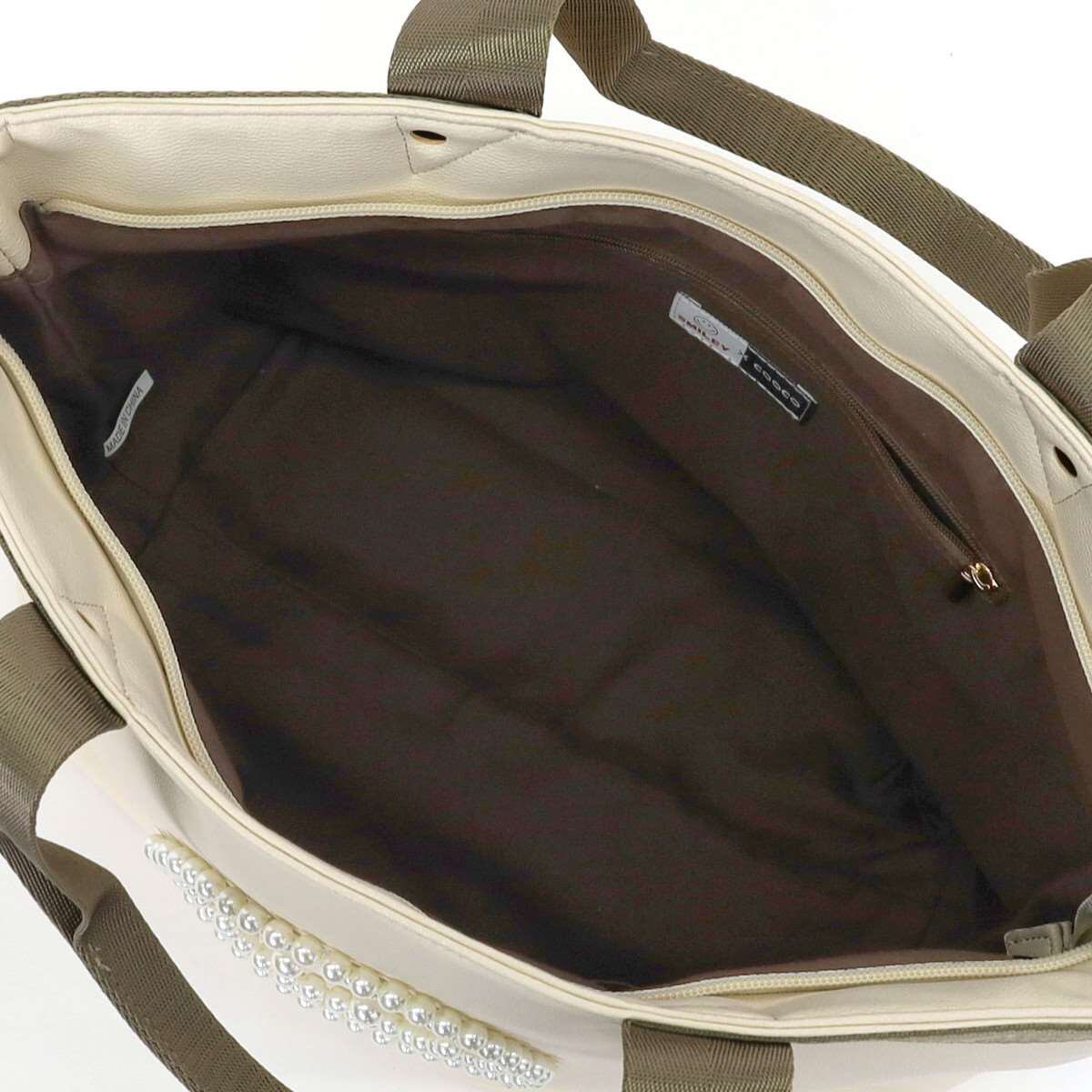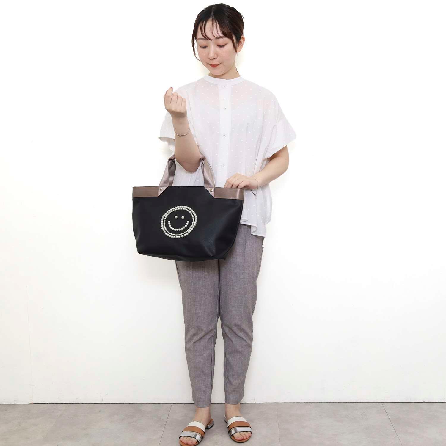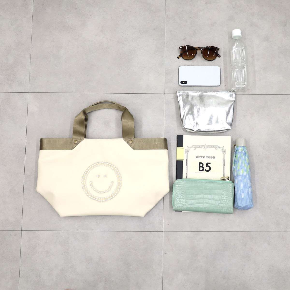 バッグの前面にパールでSMILEYフェイスが施されたトートバッグ
