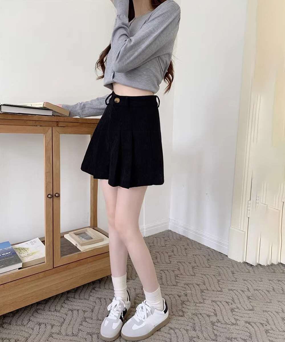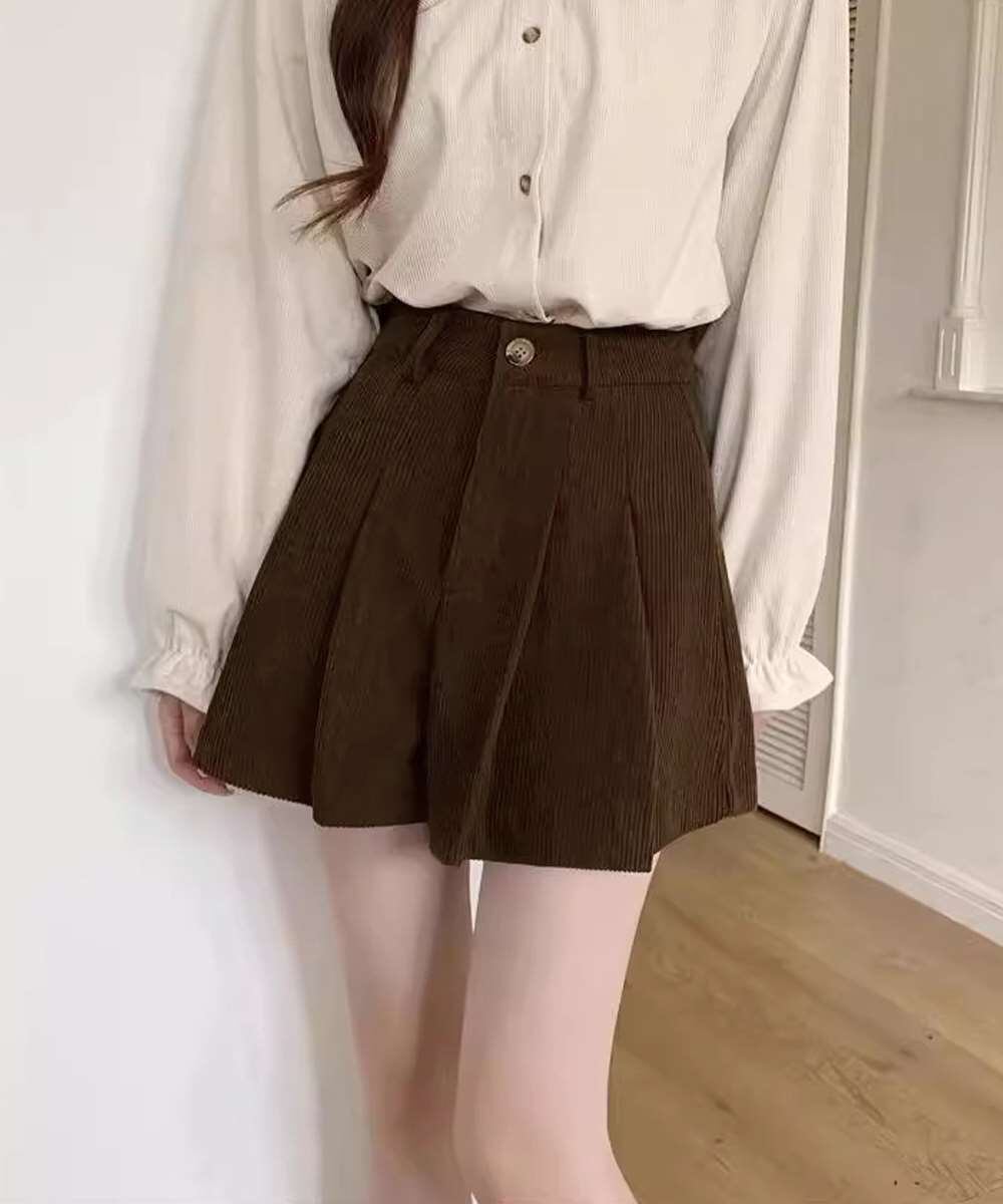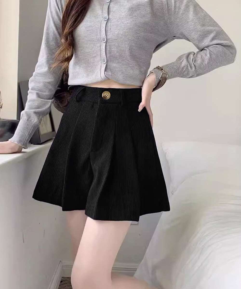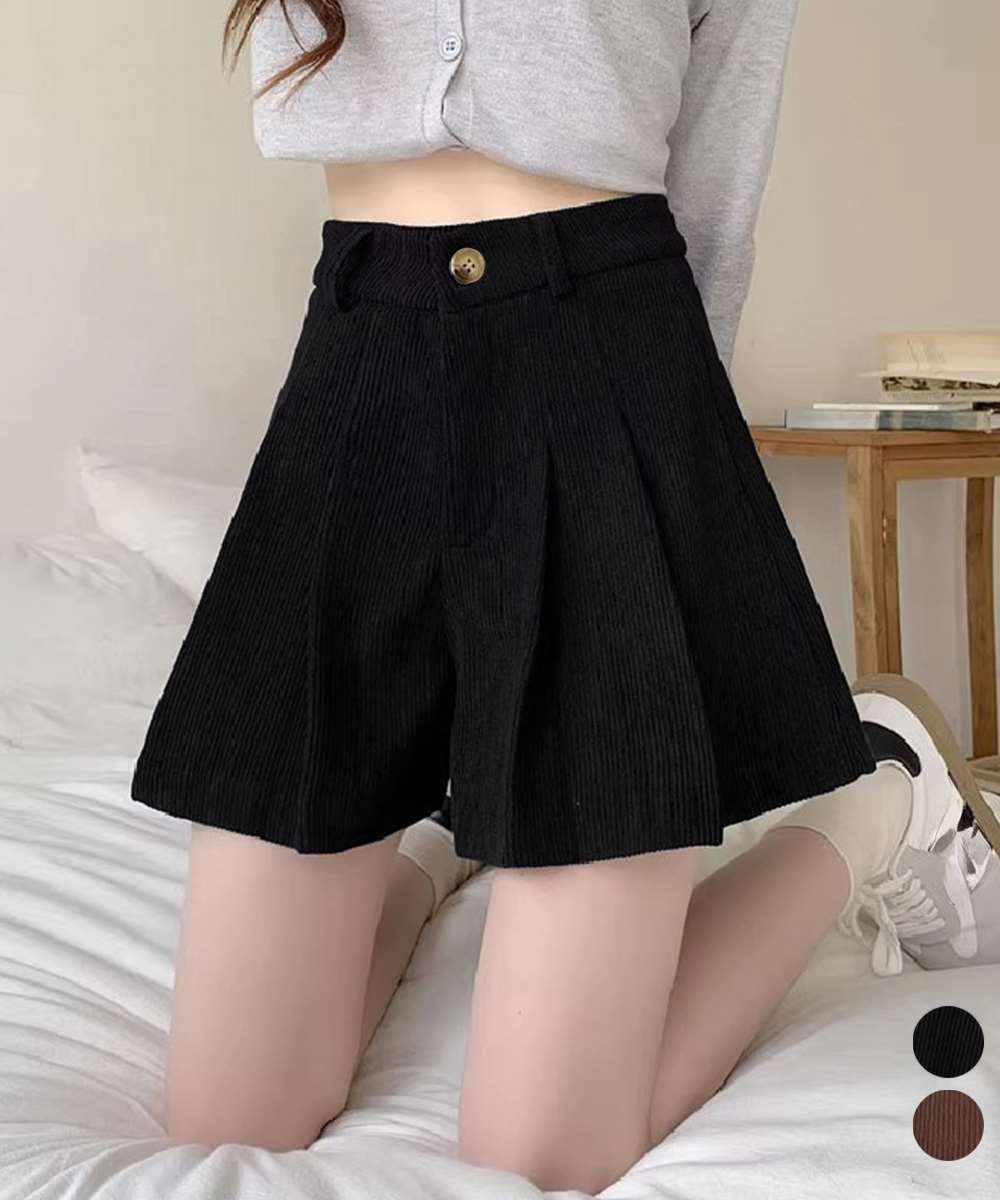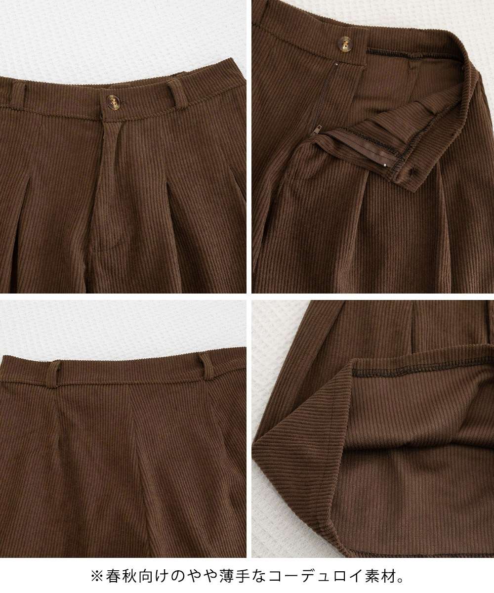 薄手コーデュロイ素材を使用したハイウエストプリーツショートパンツ。