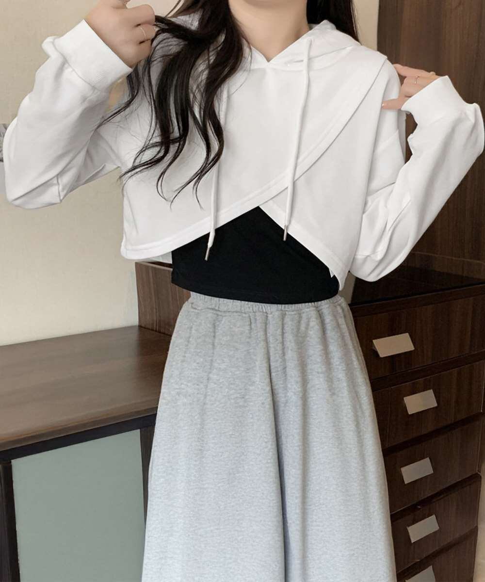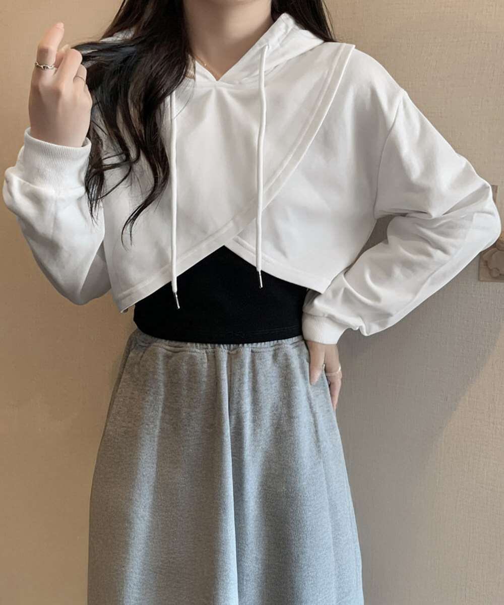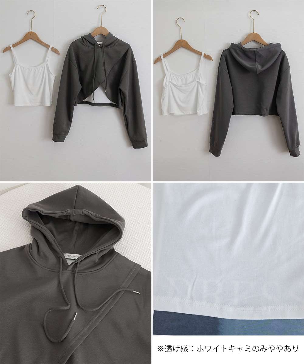ショート丈フーディとインナーを組み合わせた、レイヤード2点セットトップス。