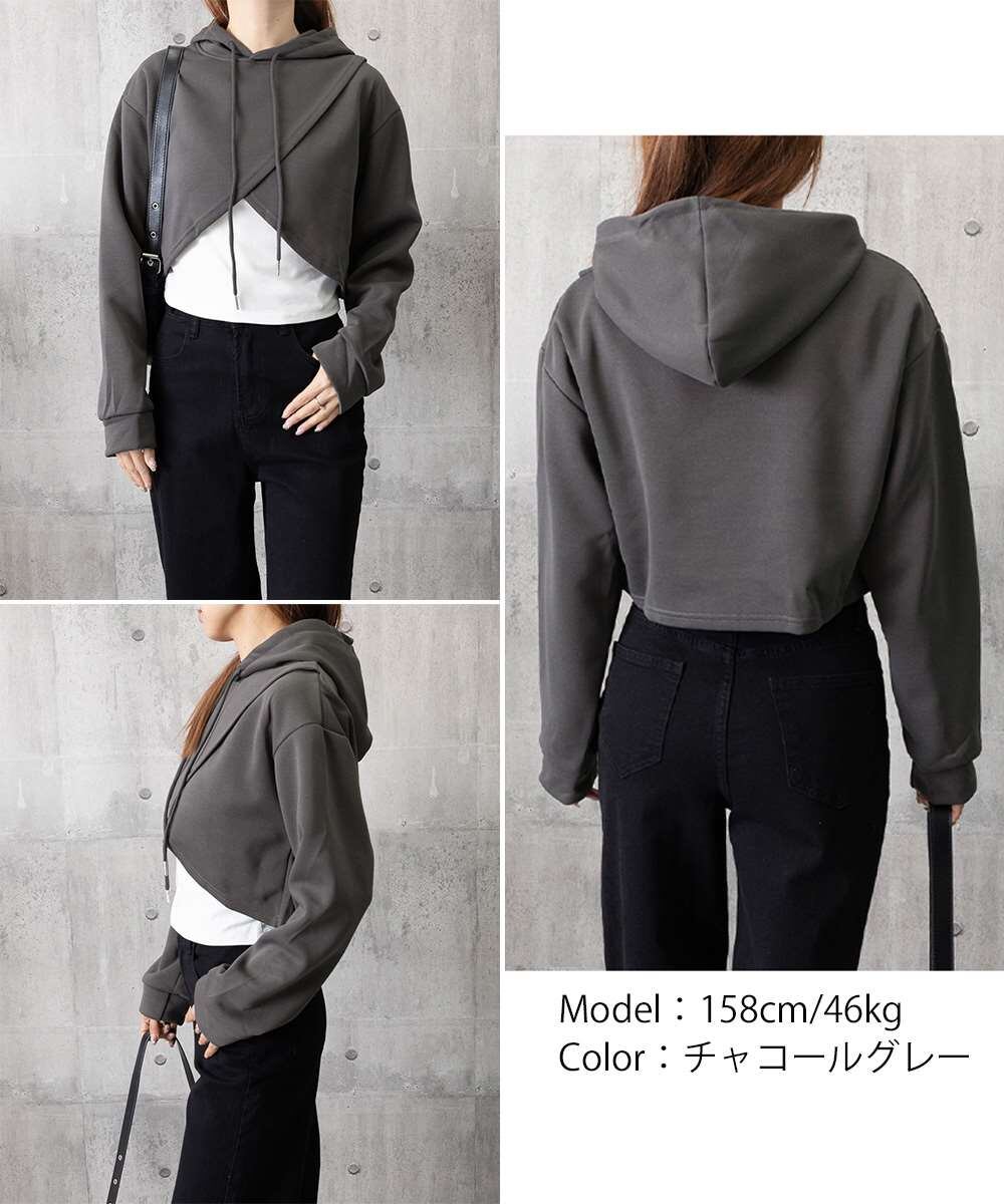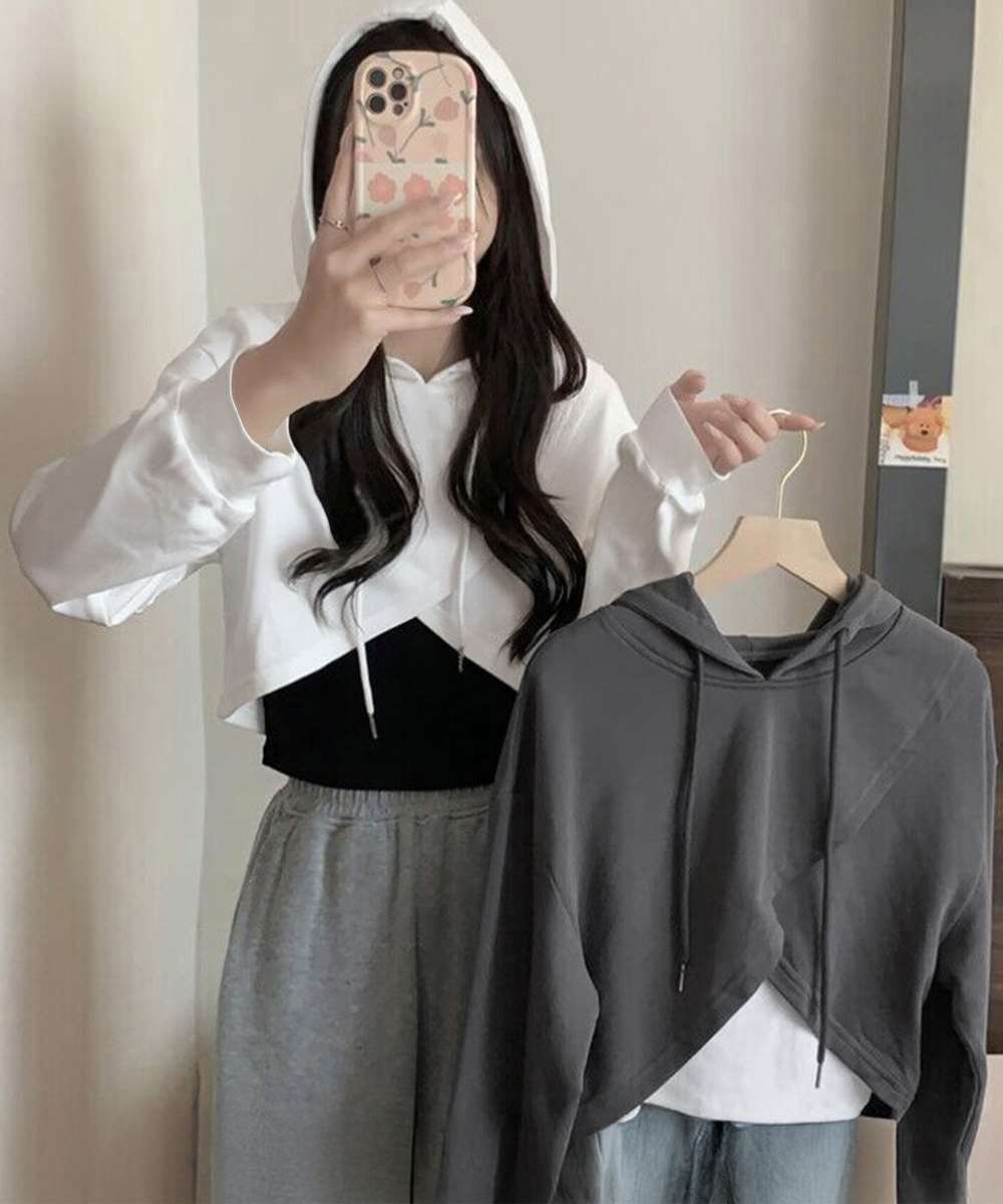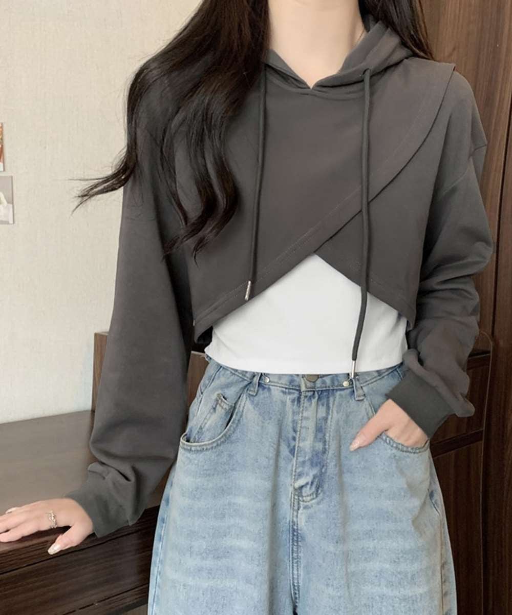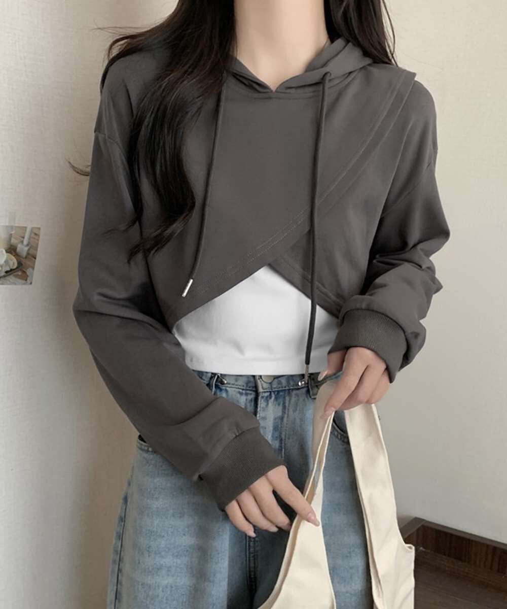 ショート丈フーディとインナーを組み合わせた、レイヤード2点セットトップス。