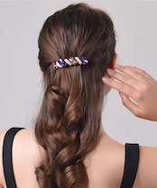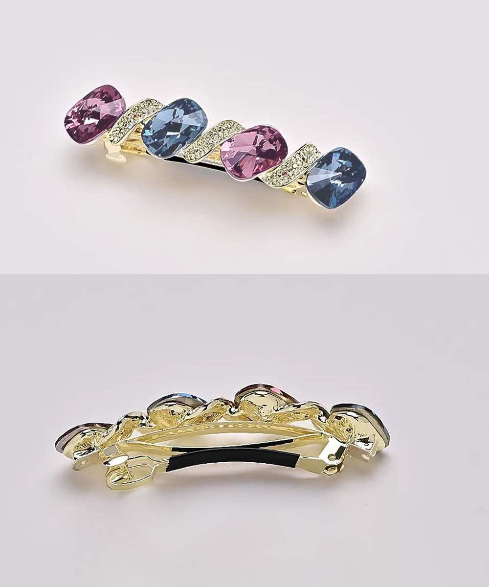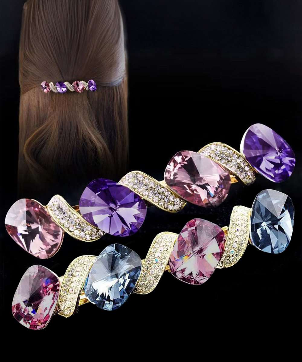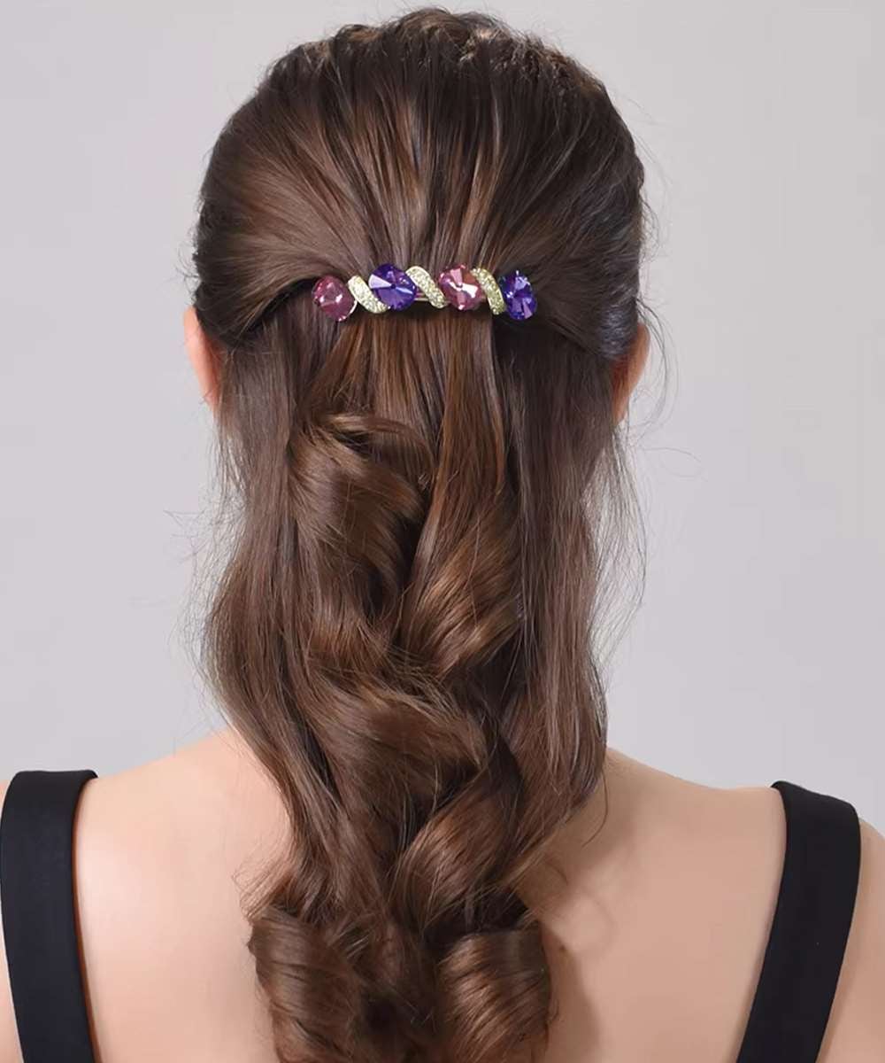 カラフルなクリスタルが光を受けて輝き、ヘアスタイルに高級感と華やかさをプラス。
