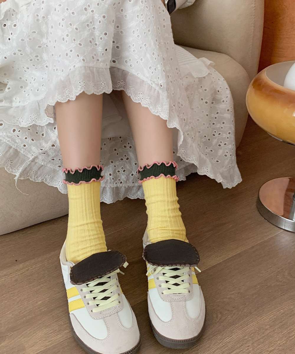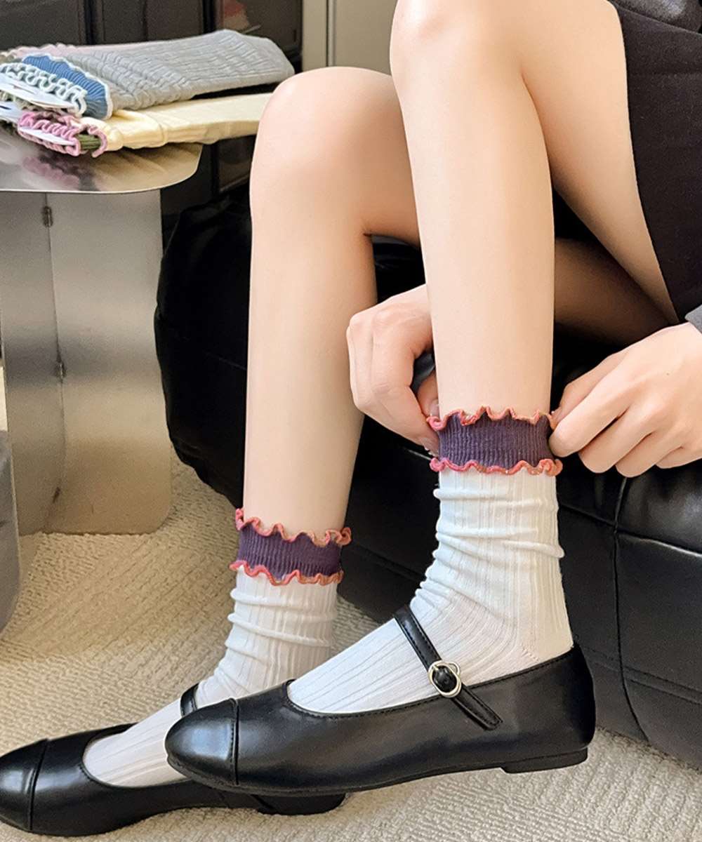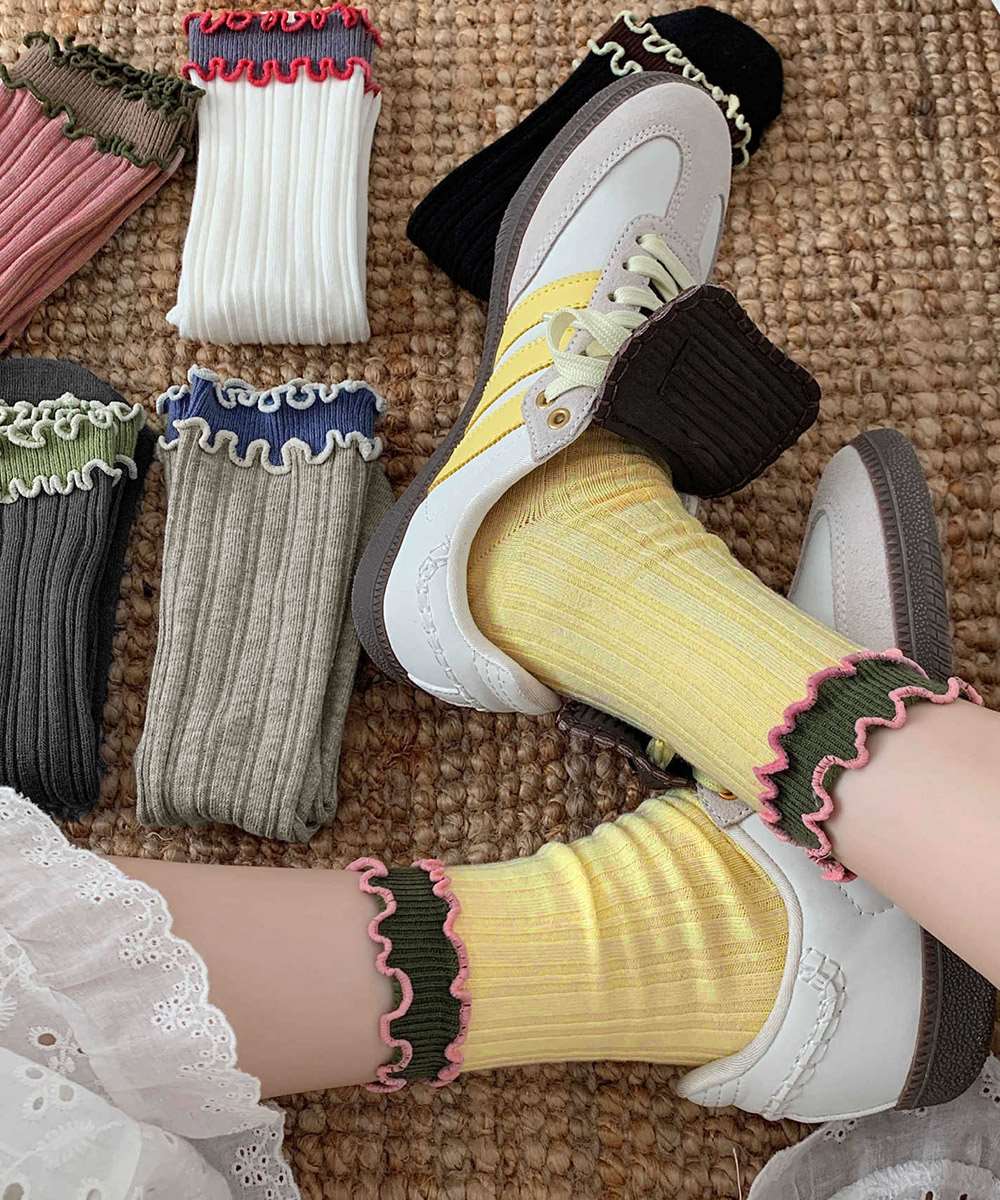 レトロ感のある配色が可愛い、2重フリル仕様のレディースリブソックス6色セット。