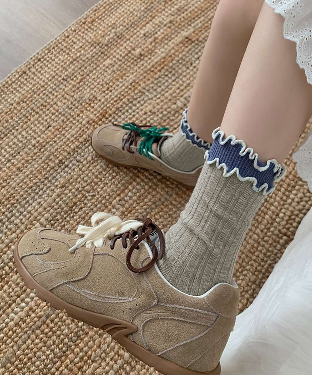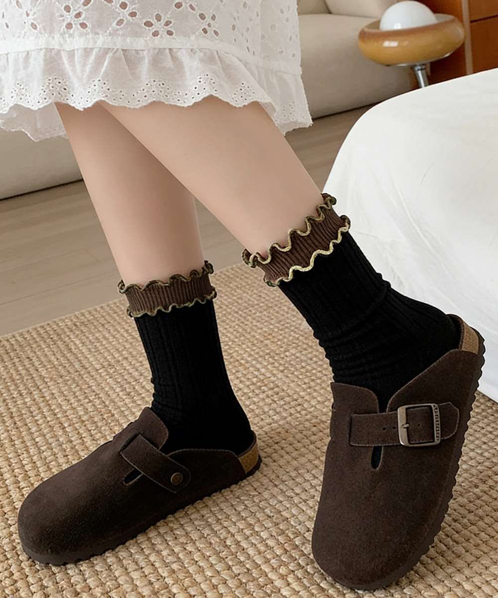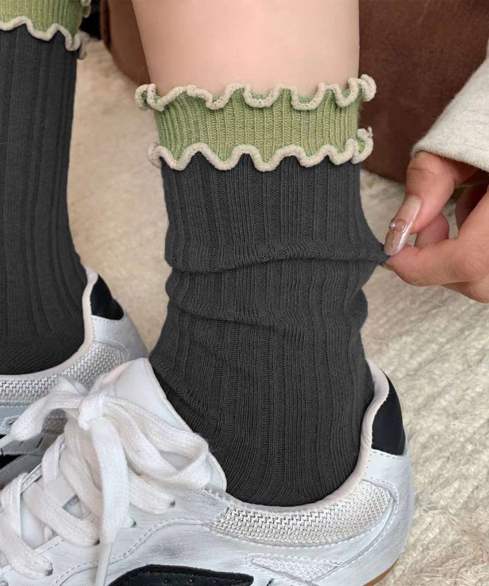 レトロ感のある配色が可愛い、2重フリル仕様のレディースリブソックス6色セット。